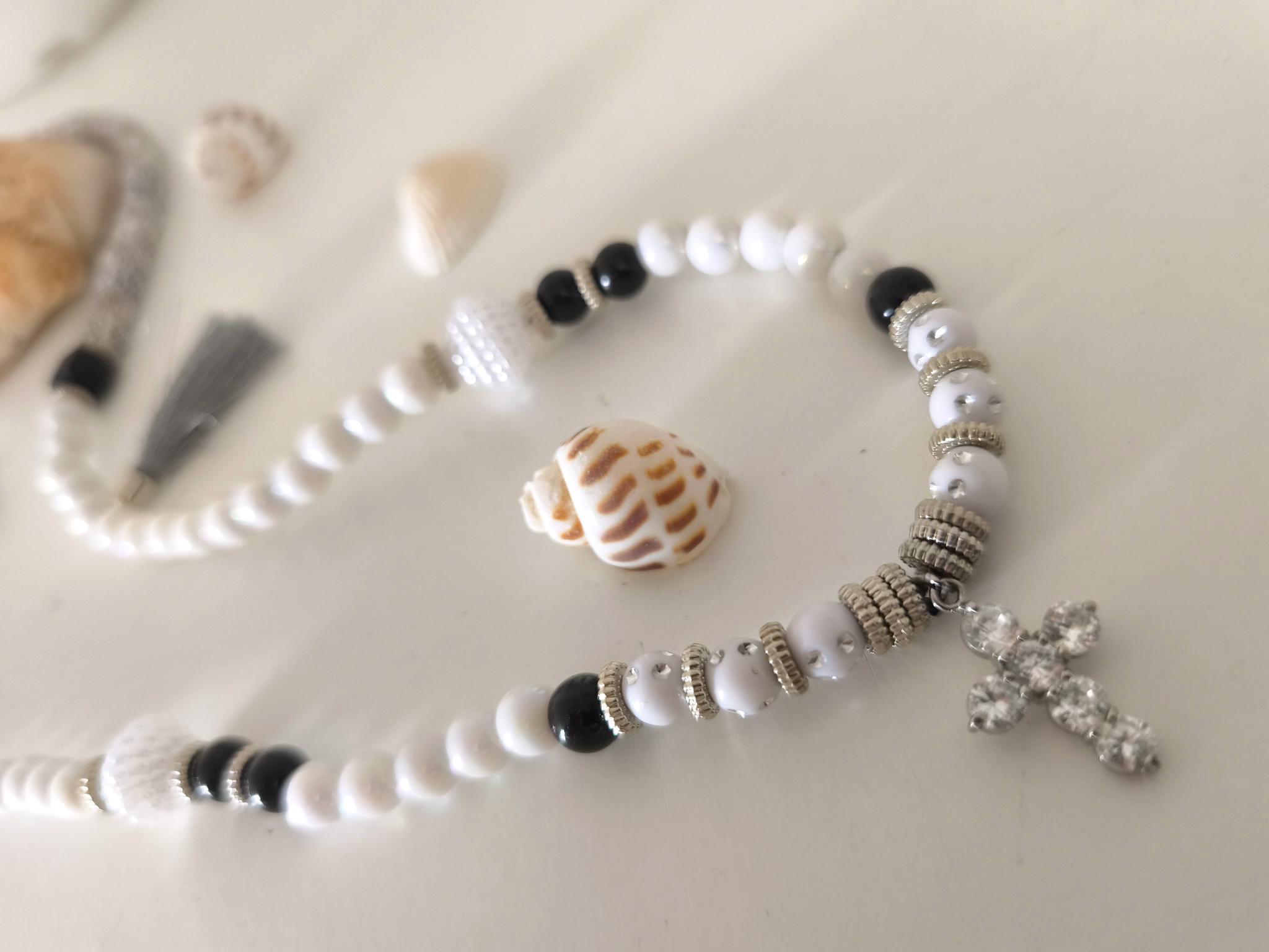 Color: Black & White, accented with silver accessories.
