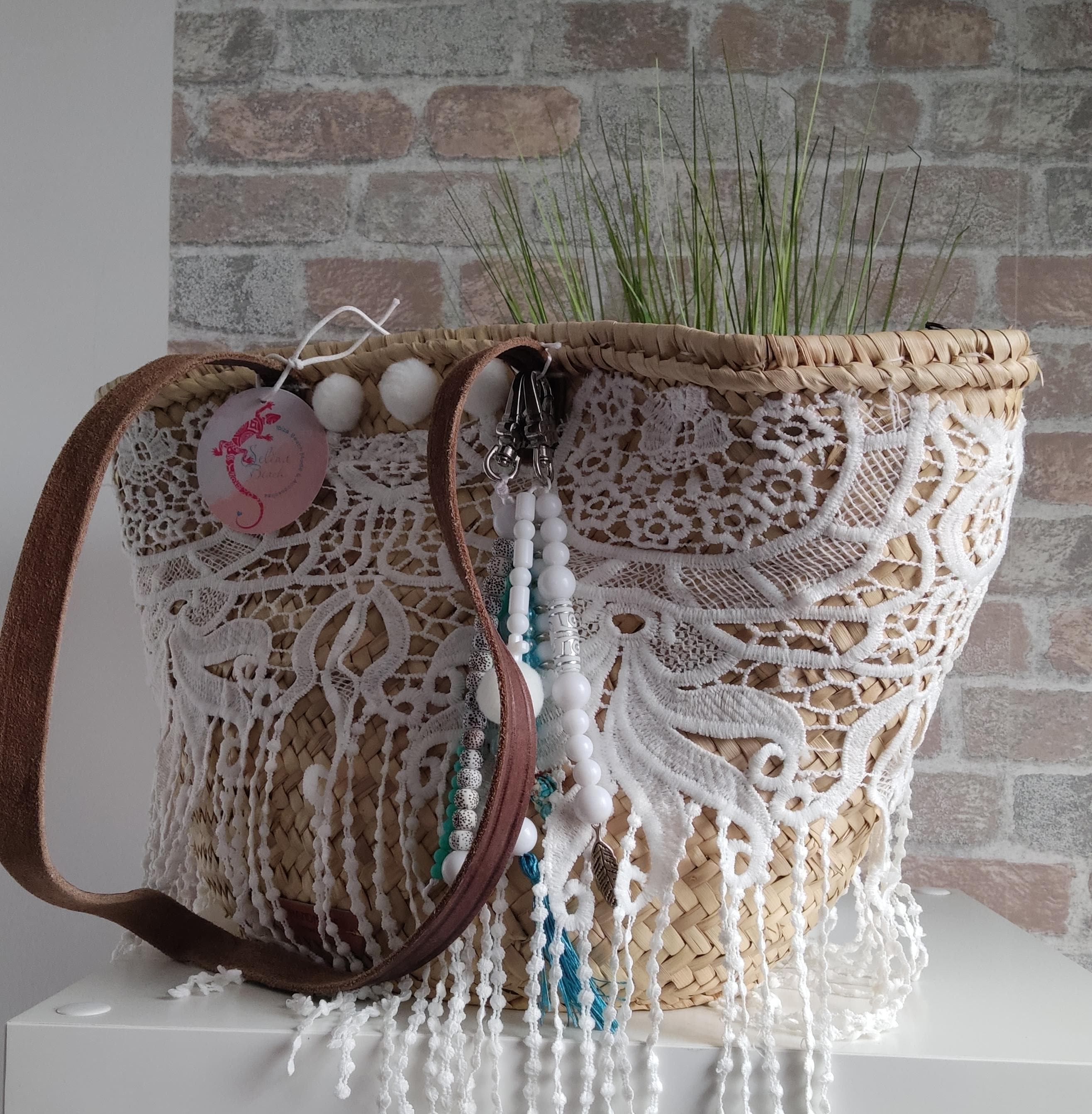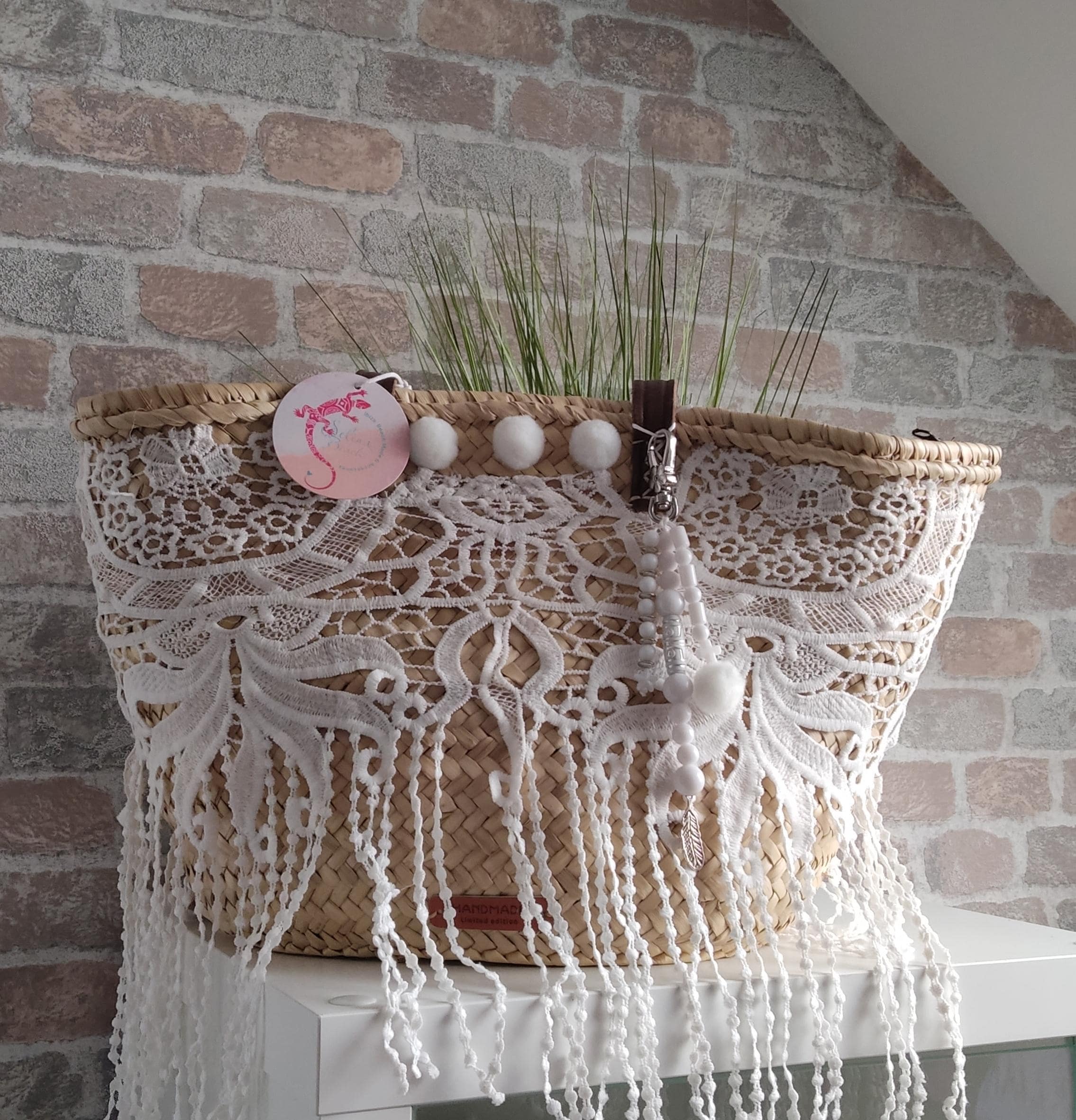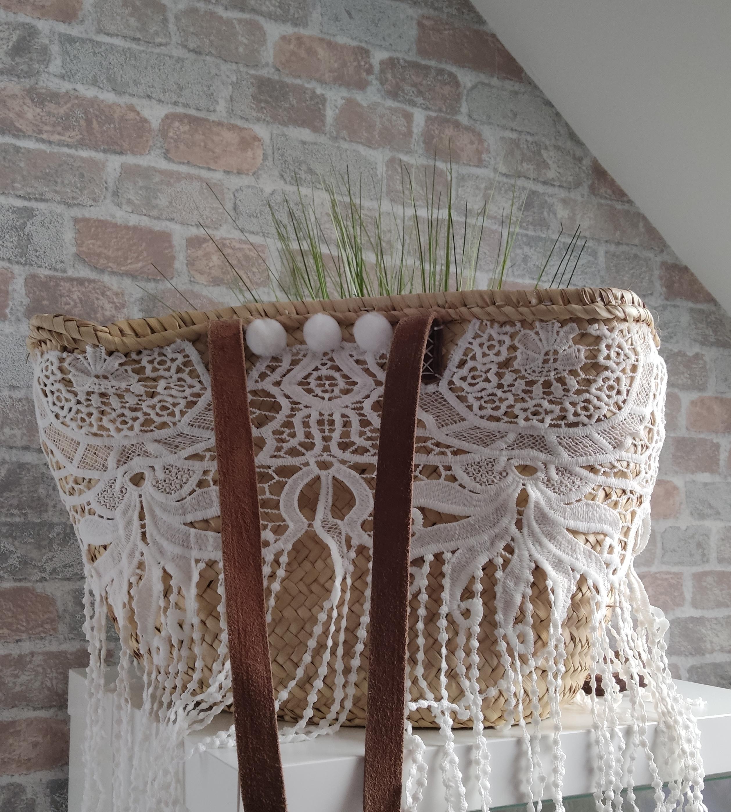Unique Ibiza basket bag Boho natural decorated with white lace, fringes and white pom-poms.