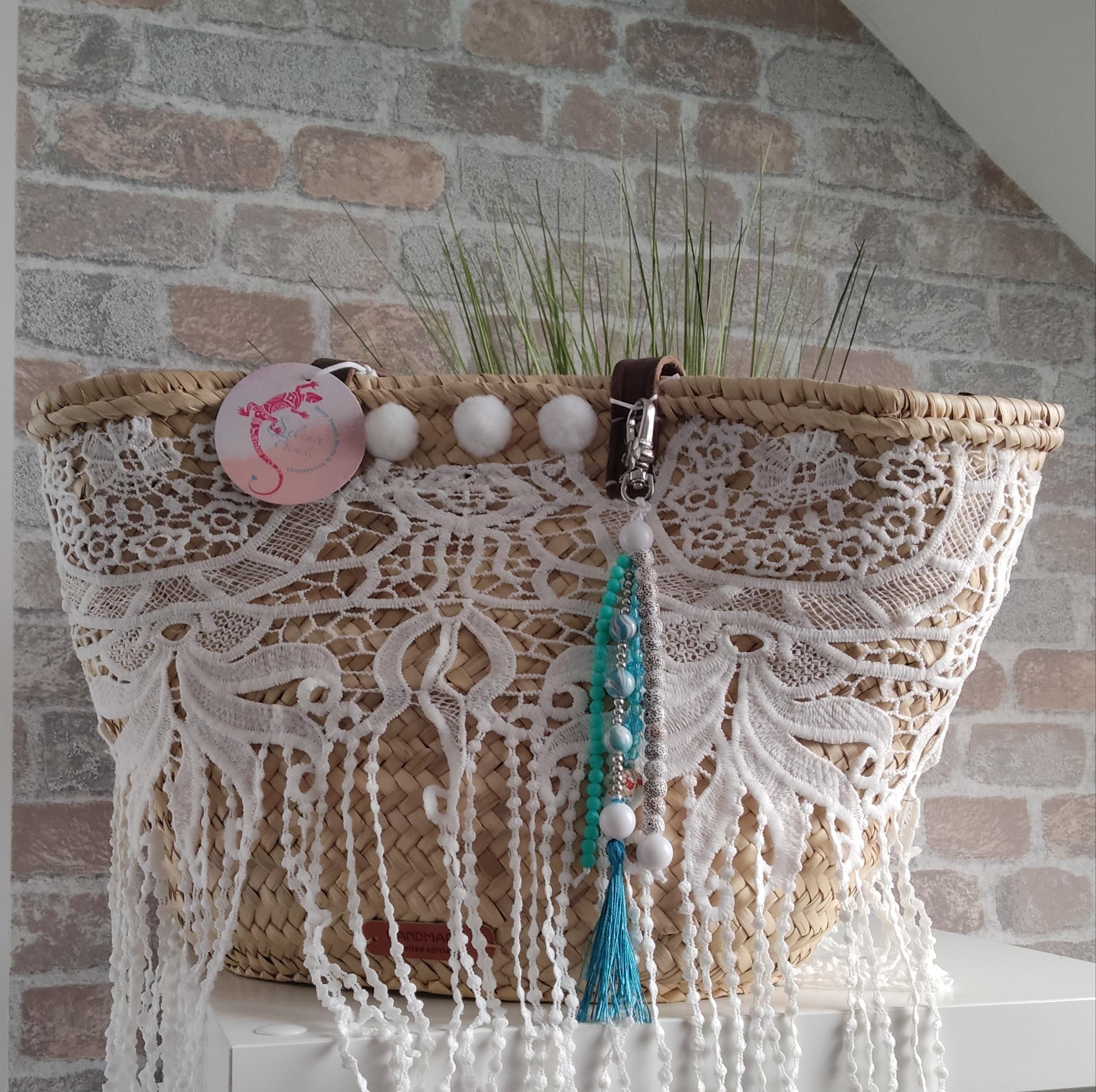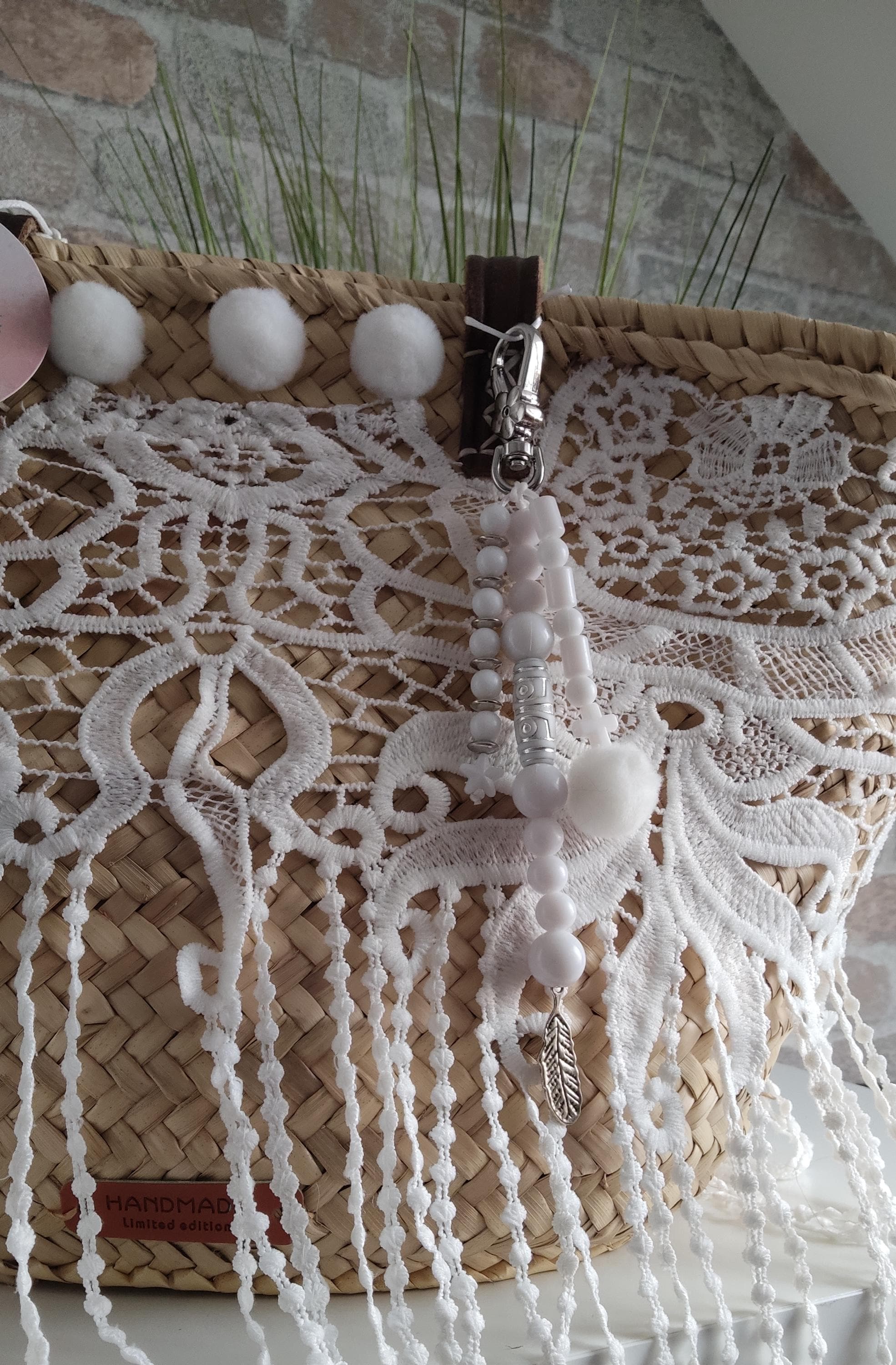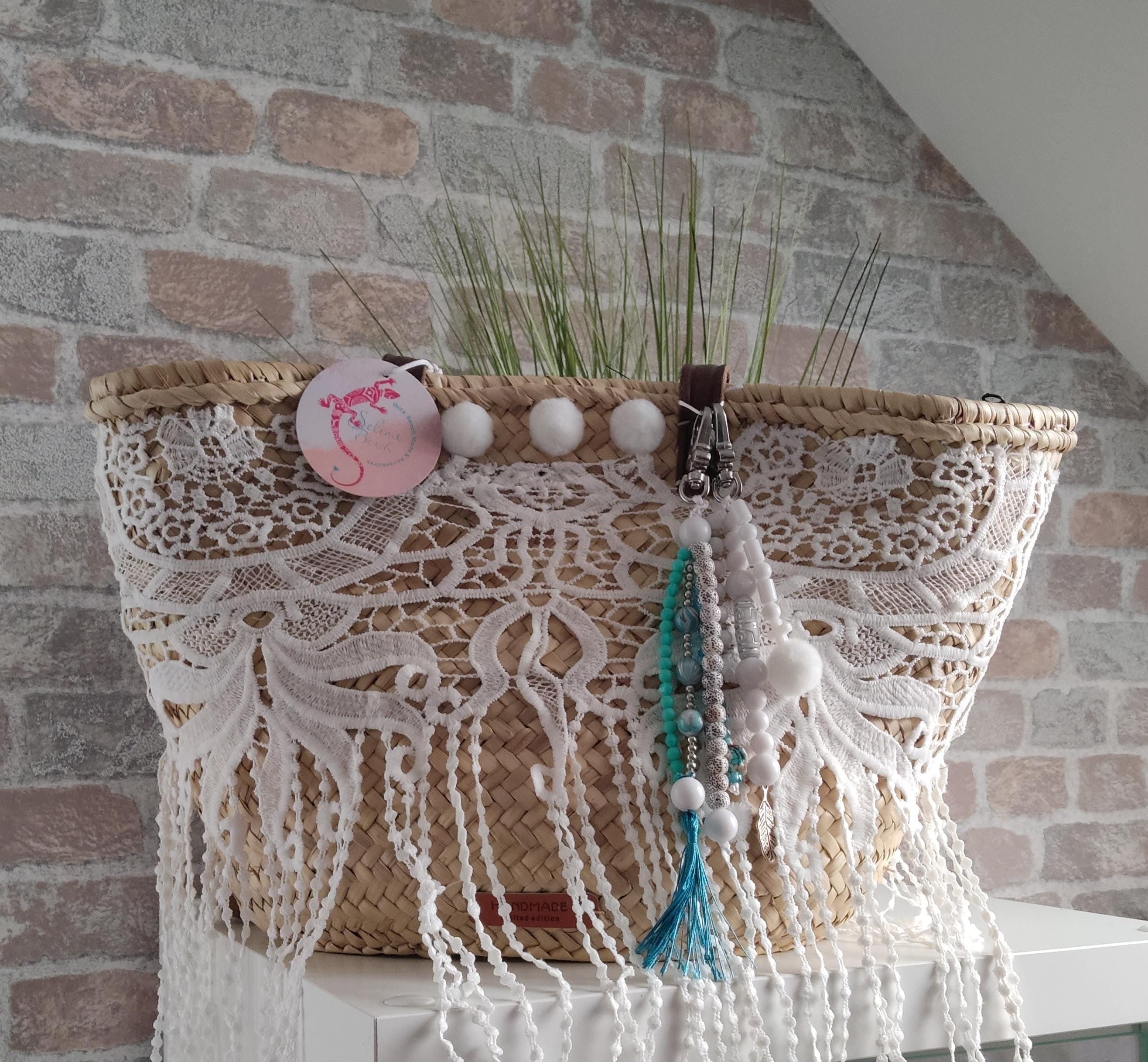 Unique Ibiza basket bag Boho natural decorated with white lace, fringes and white pom-poms.