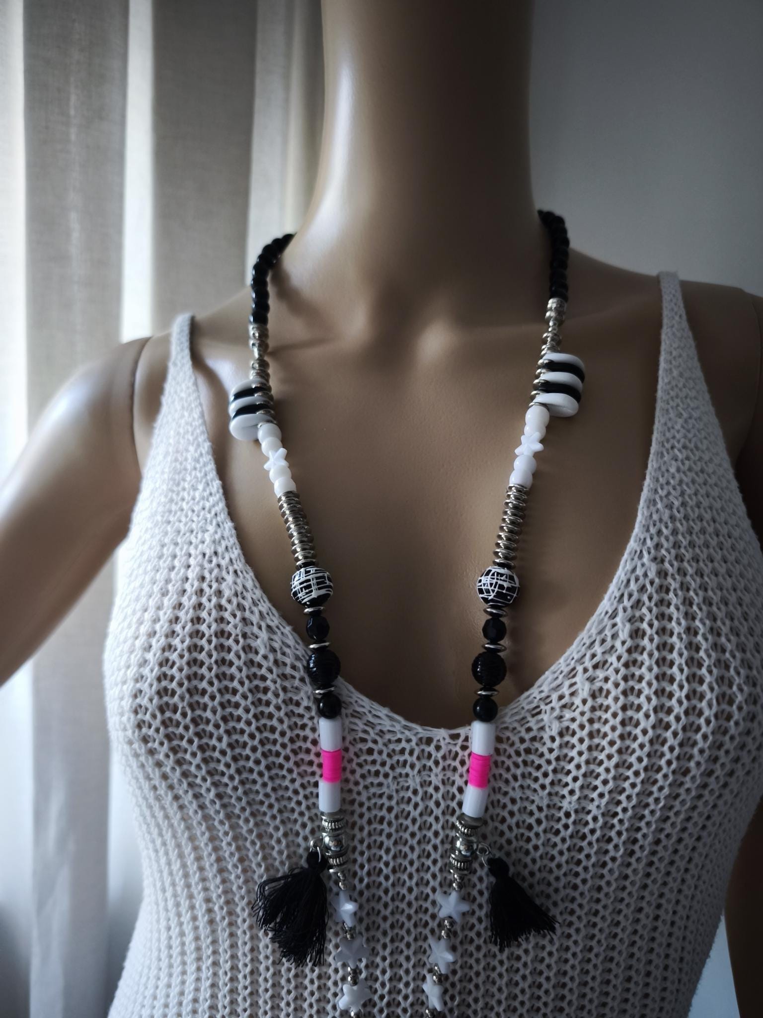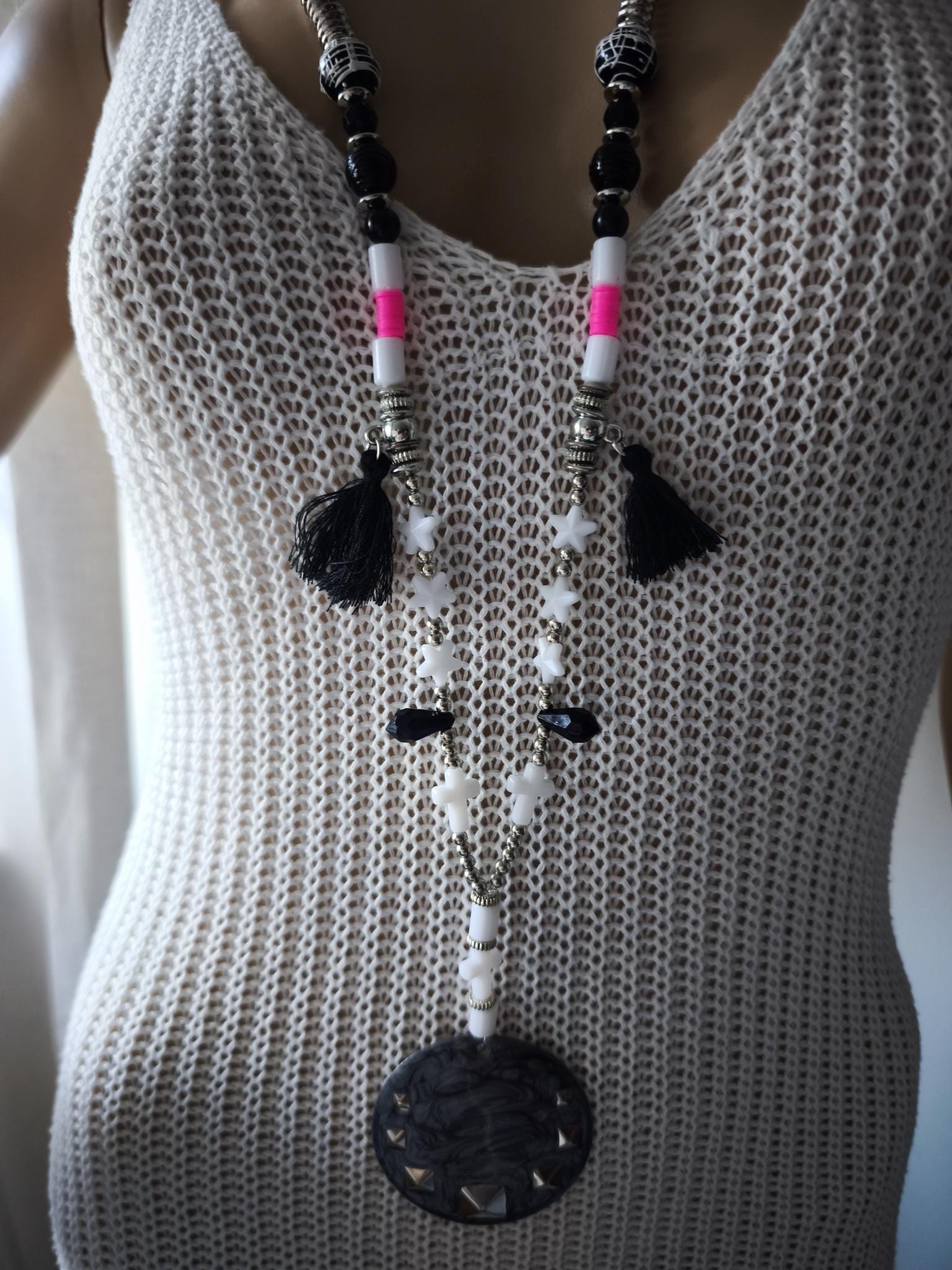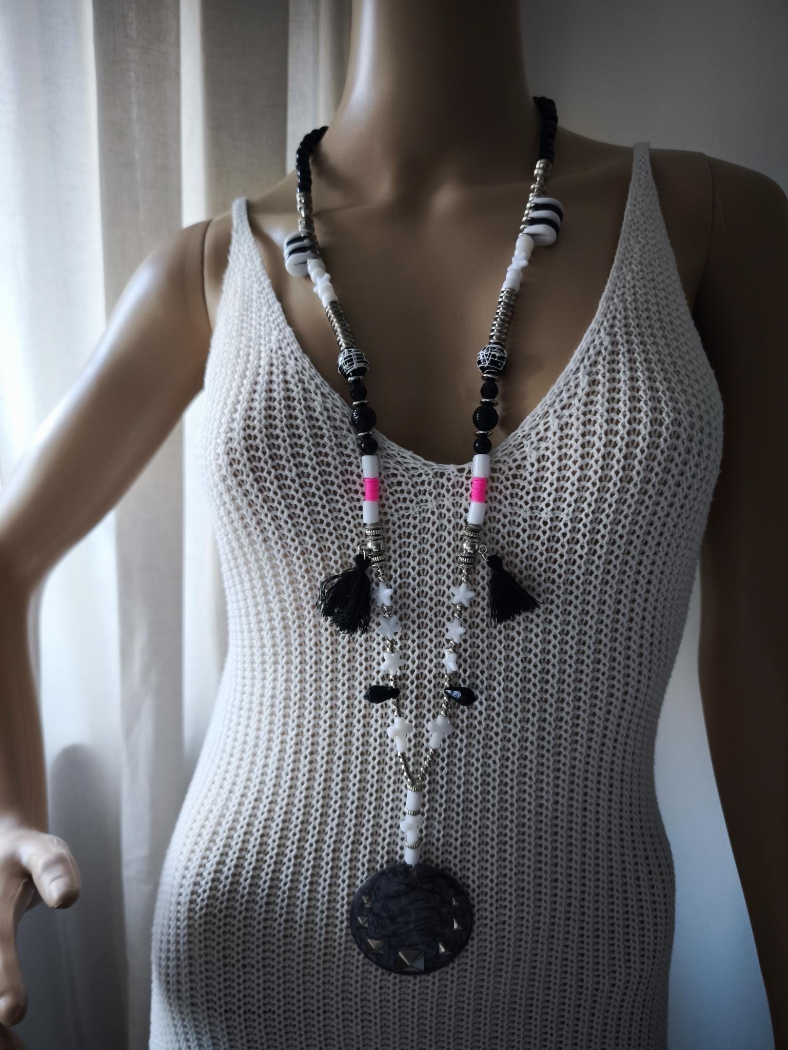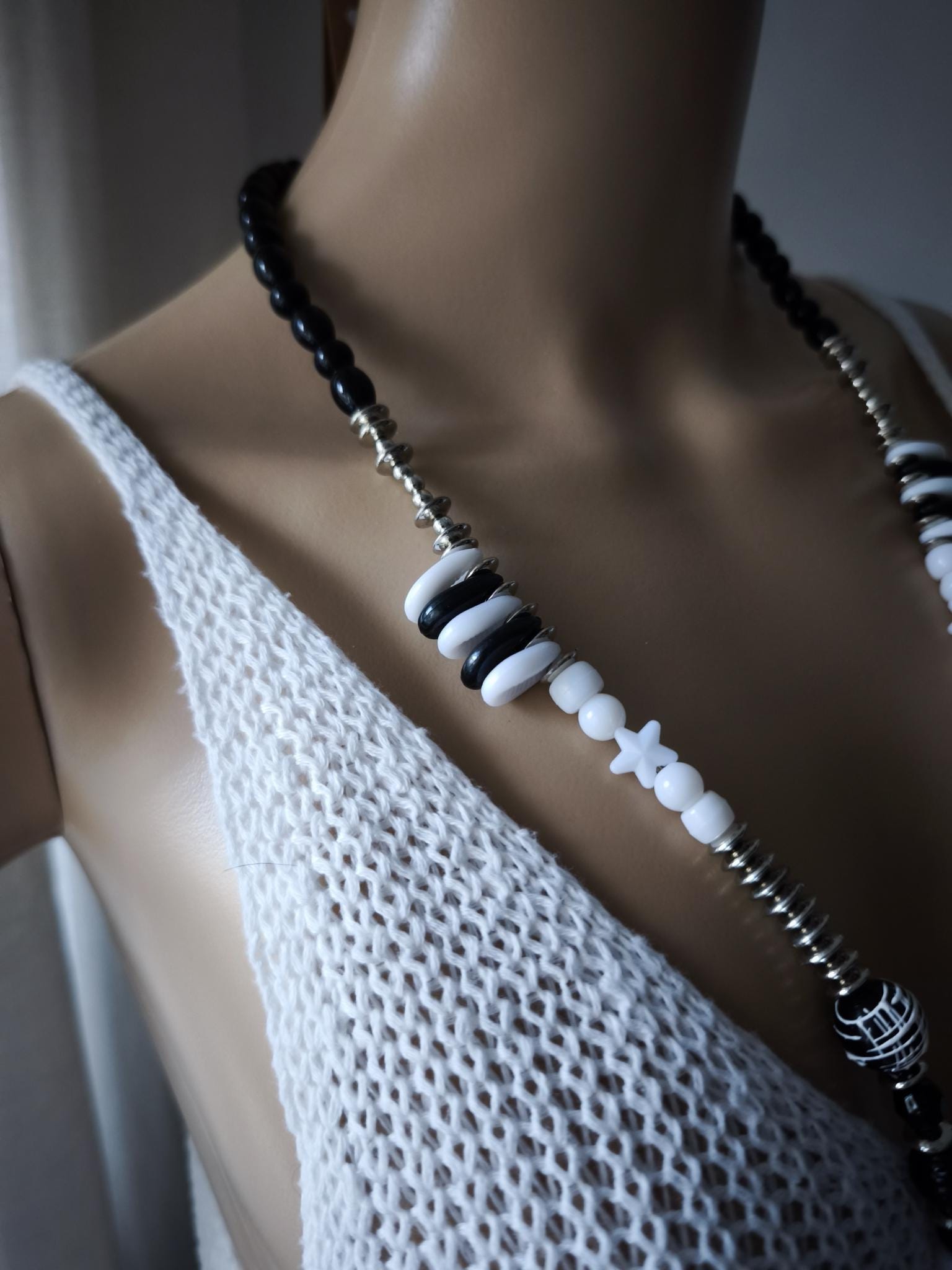 A stunning XXL boho Ibiza-style necklace made of pearls, featuring tassels, shells, numerous silver details, white crosses and stars, and a large round silver pendant. The neckline is adorned with glossy black oval and round pearls.