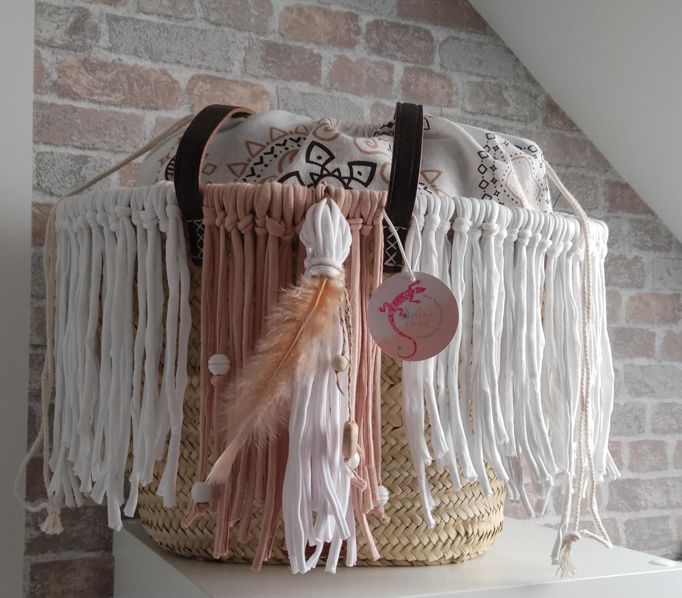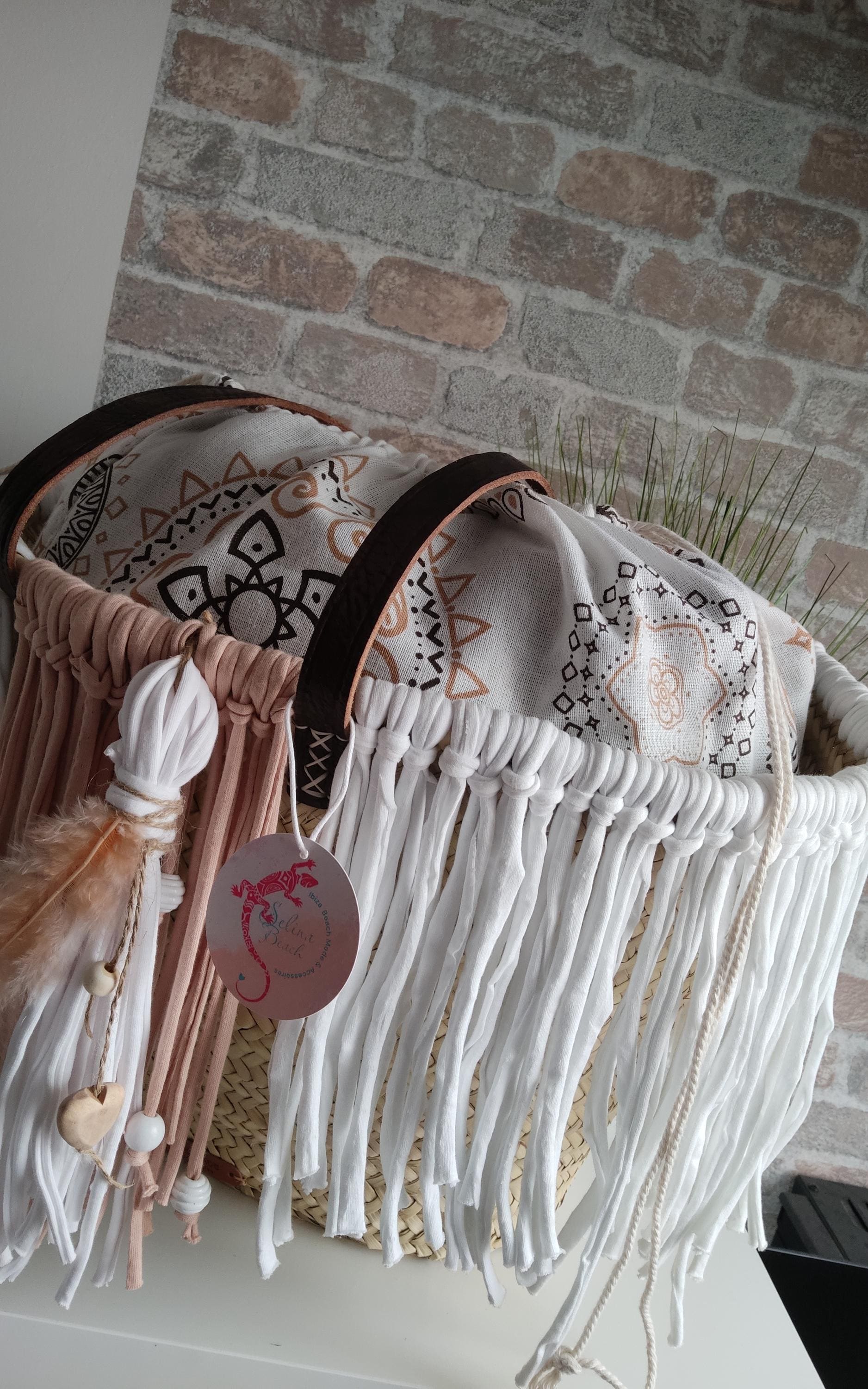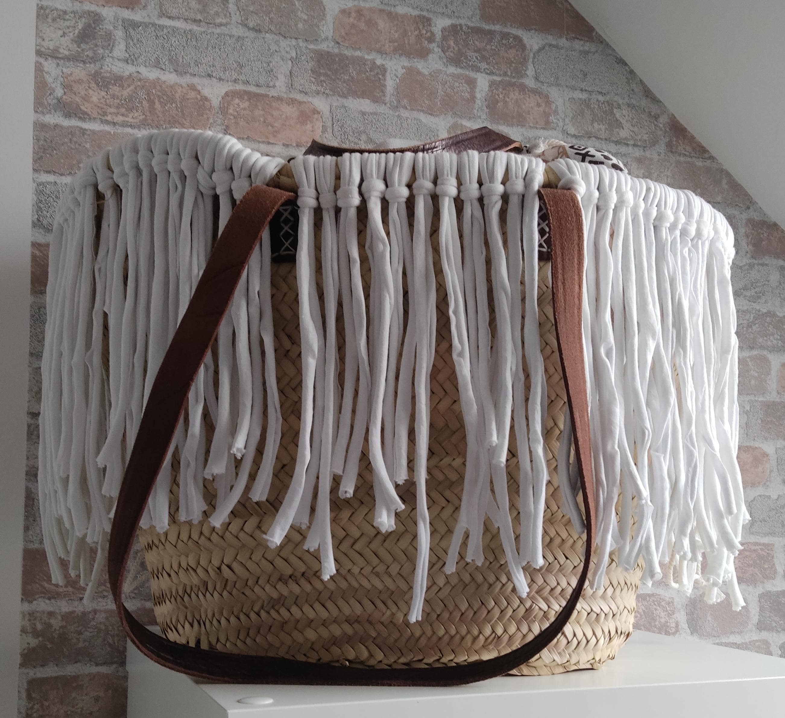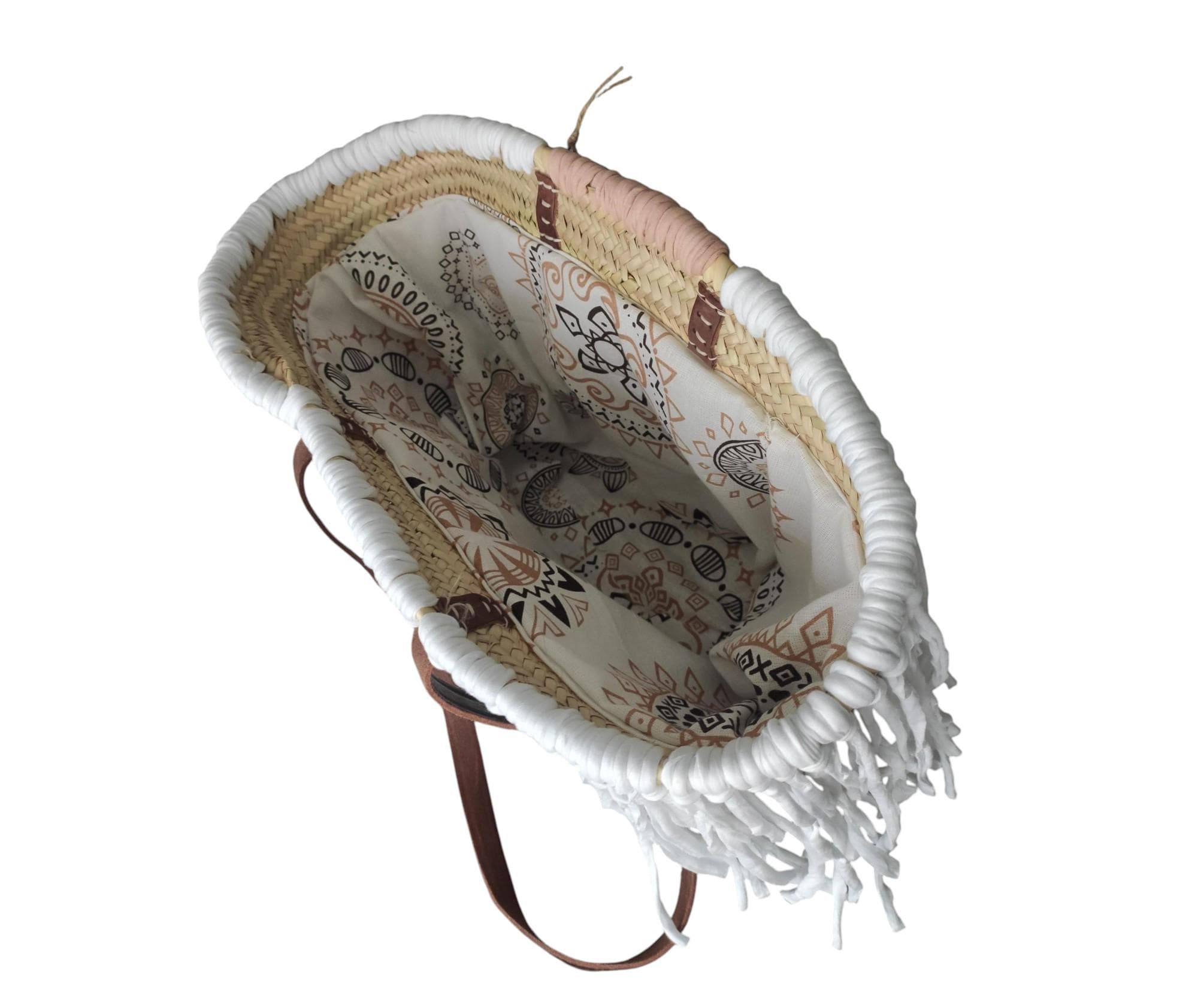 This beautiful Ibiza basket bag from our Selina collection is a handcrafted, limited-edition piece. It's artfully woven from palm leaves and adorned with numerous white and additional beige fringes on the front. The shoulder straps are made of high-quality leather. A large white pom-pom with a wooden trim and a feather hangs from the front, adding a touch of boho chic. The bag also features an interior pocket with a drawstring closure (handmade). An essential accessory for every boho lover!