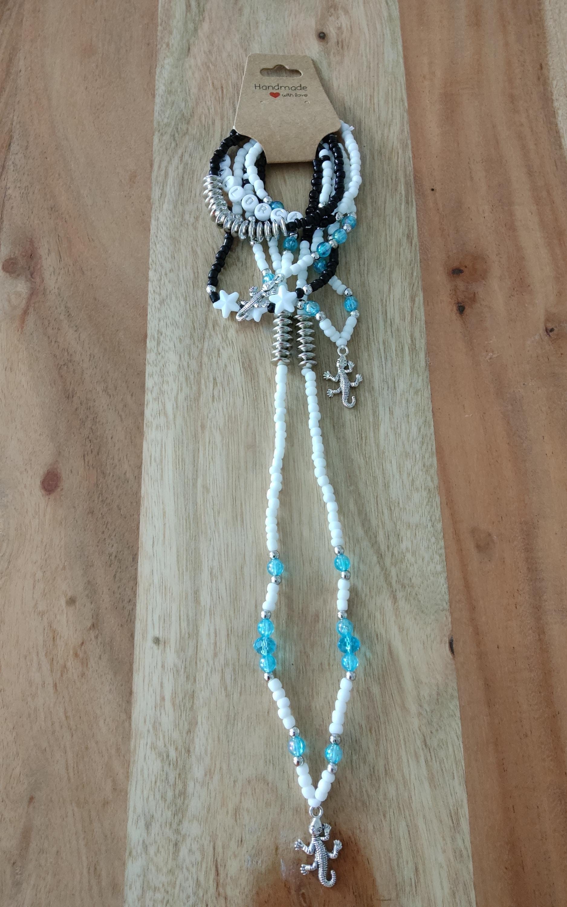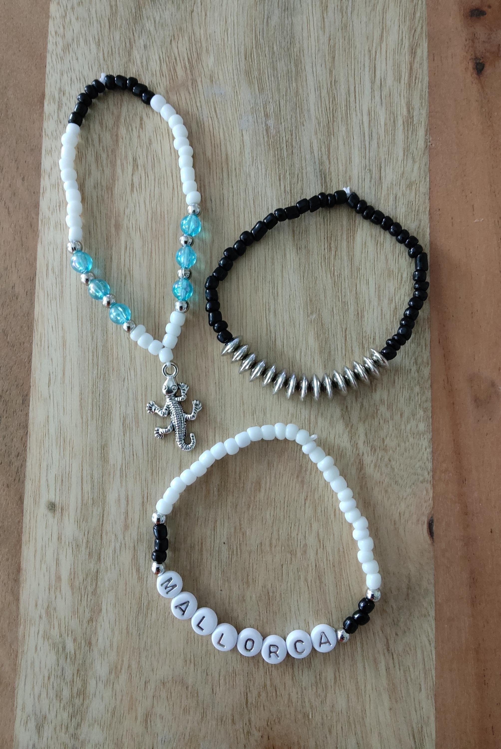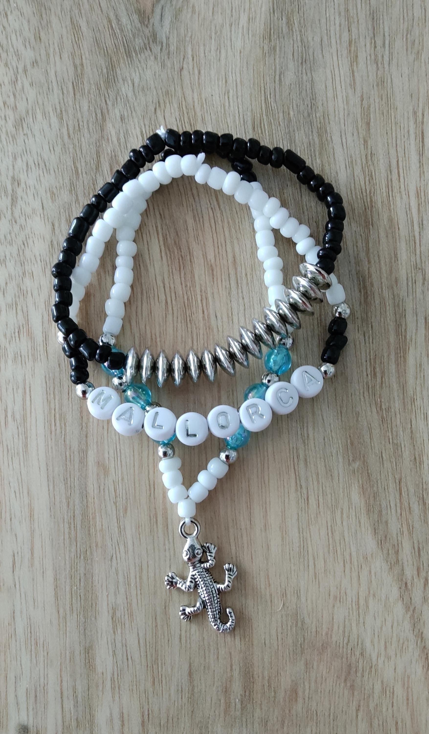 For Mallorca lovers... A sweet Ibiza Mallorca necklace set, 6 pieces, with a gecko design, consisting of a necklace, three bracelets, and two anklets in white, turquoise, black, and silver. All made of stretch fabric, simply slip it on... and you're done. One bracelet features the letters MALLORCA, and the second anklet has three white stars.
