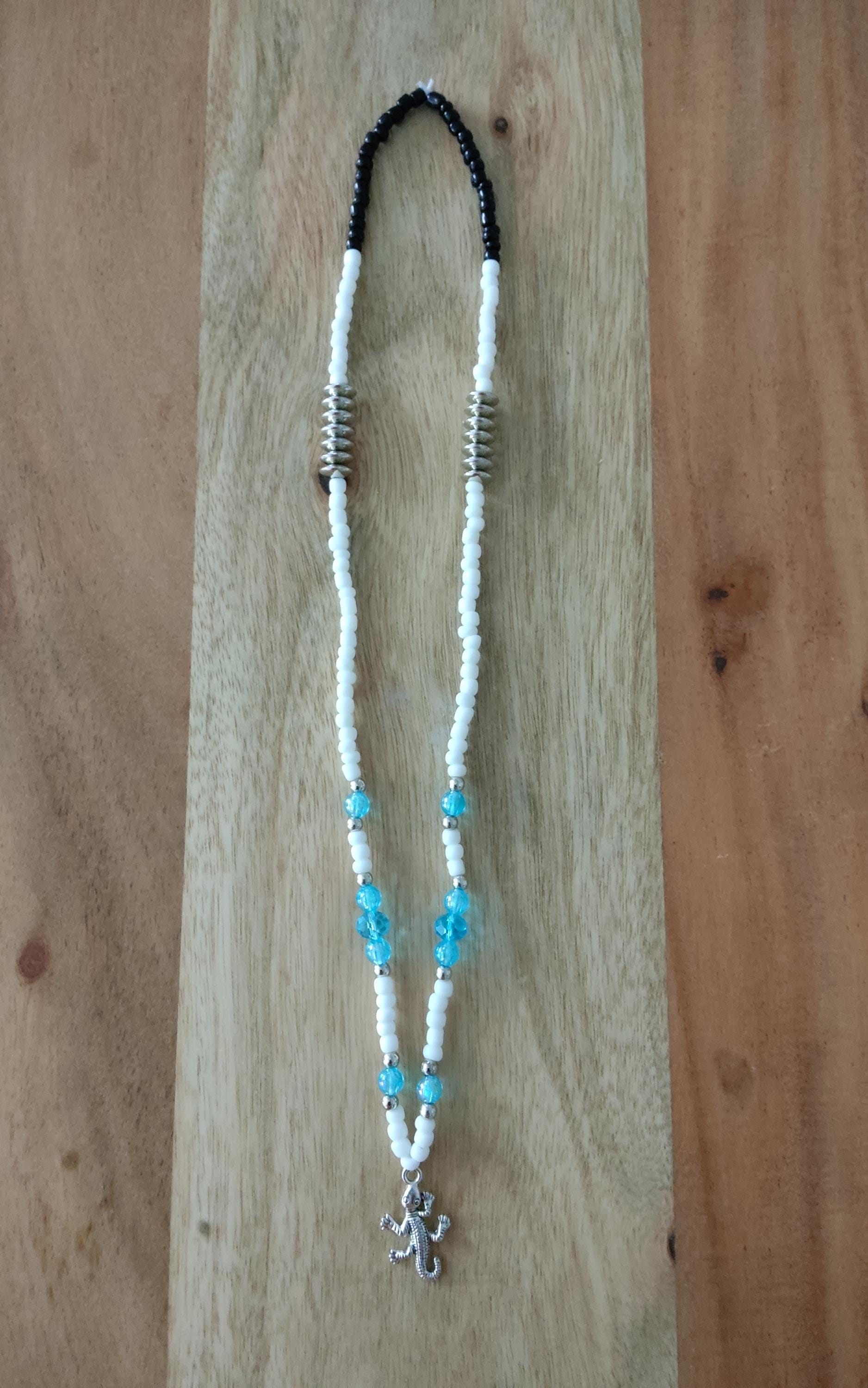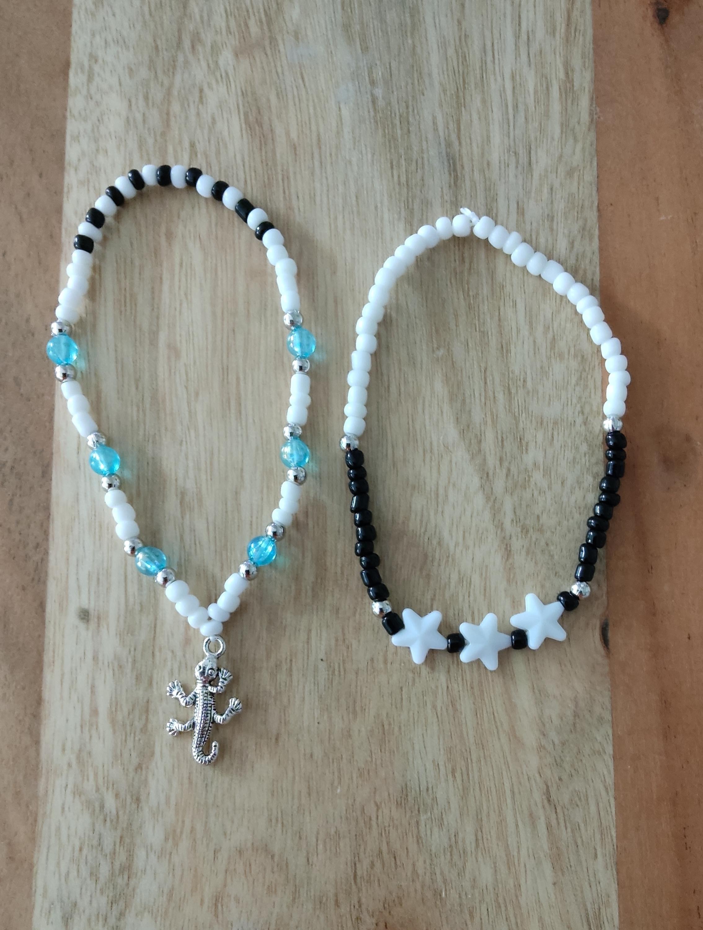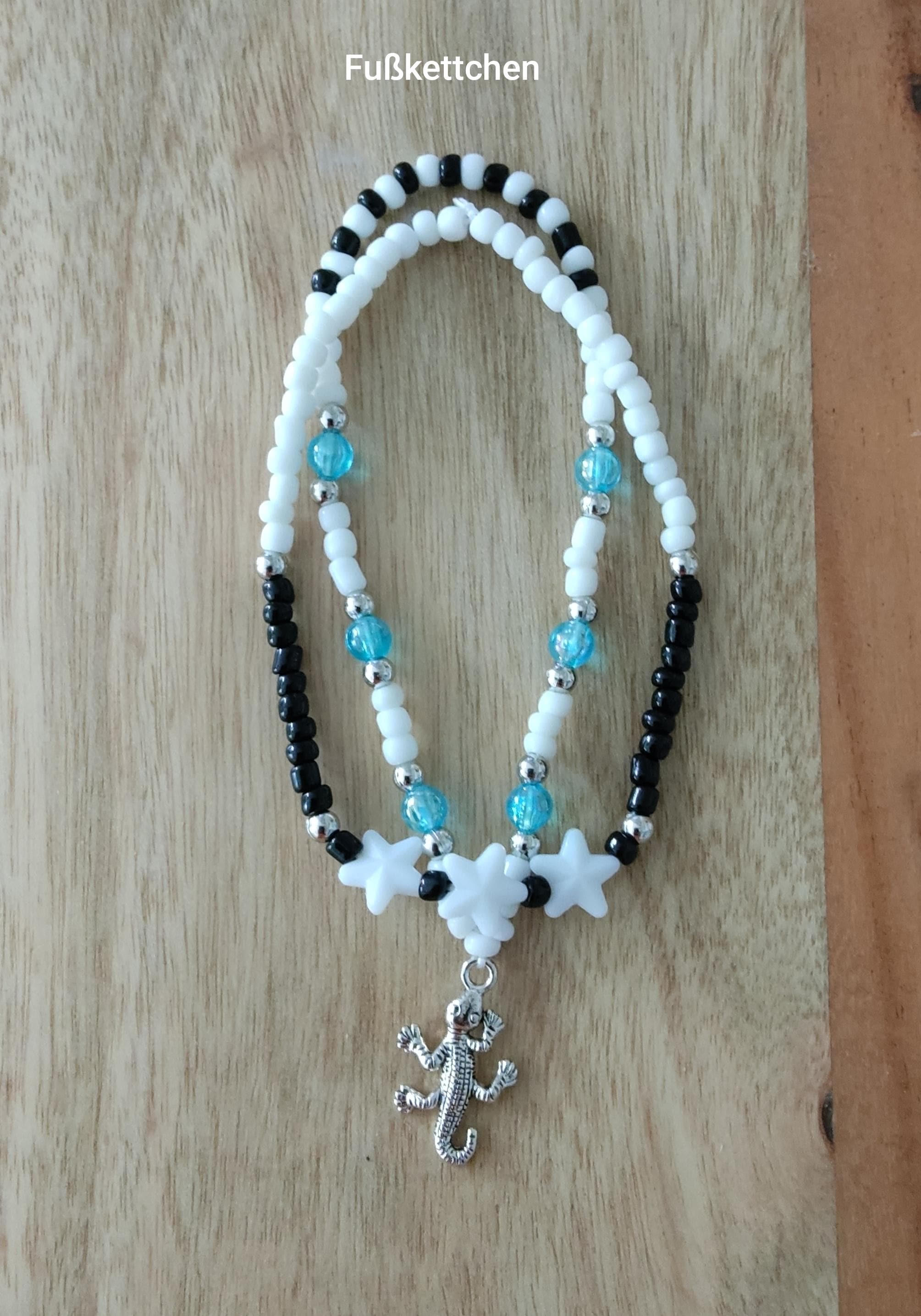For Mallorca lovers... A sweet Ibiza Mallorca necklace set, 6 pieces, with a gecko design, consisting of a necklace, three bracelets, and two anklets in white, turquoise, black, and silver. All made of stretch fabric, simply slip it on... and you're done. One bracelet features the letters MALLORCA, and the second anklet has three white stars.