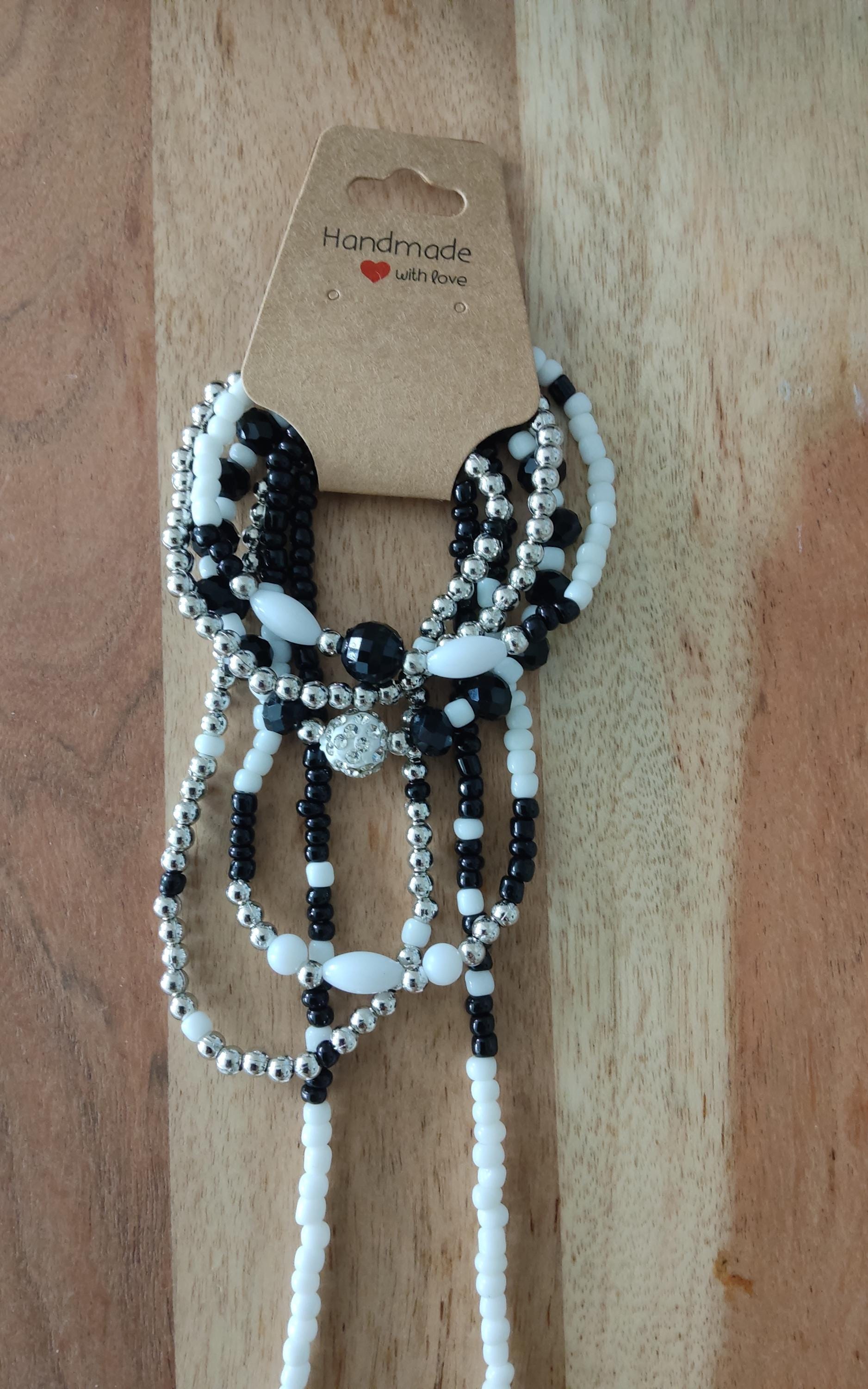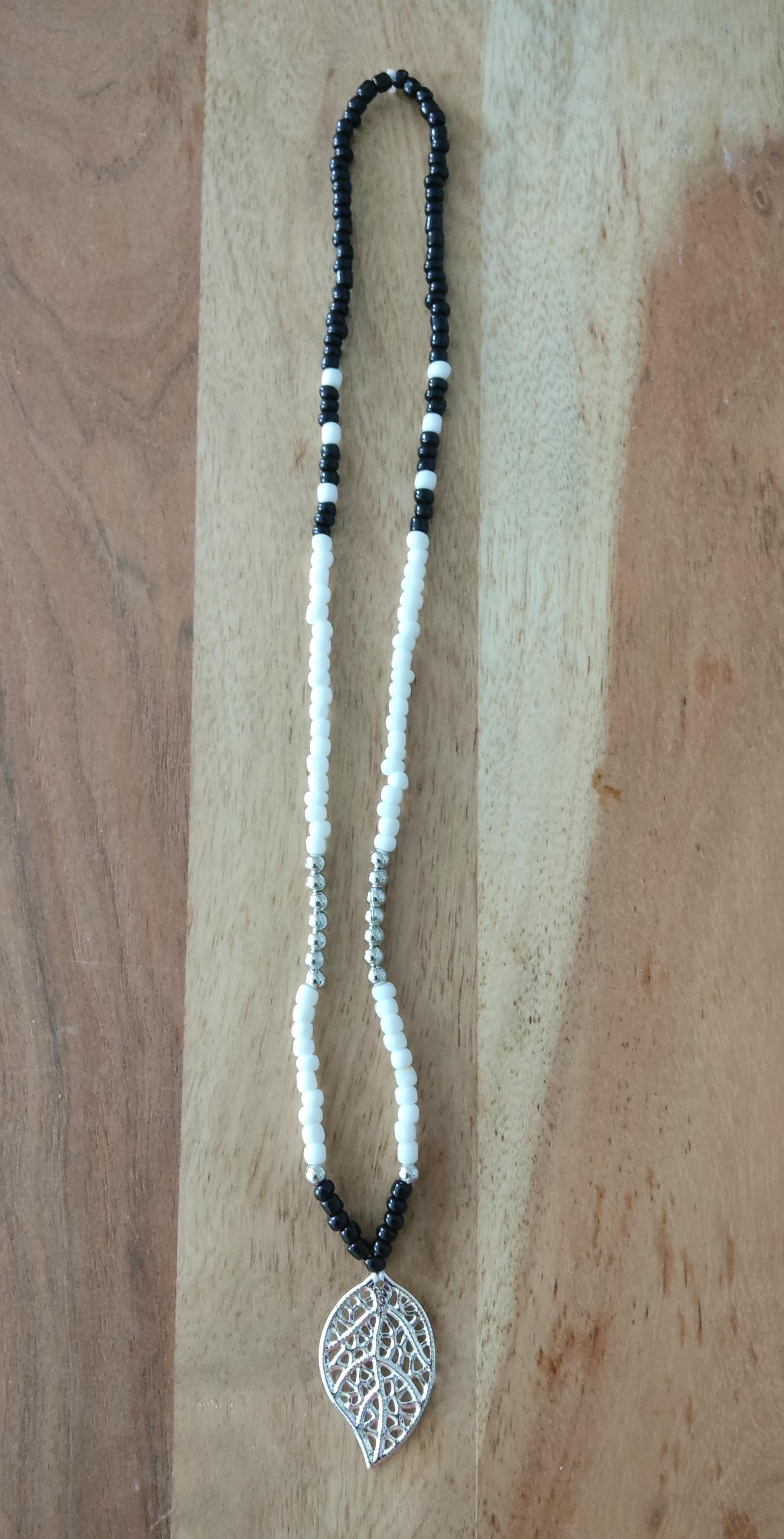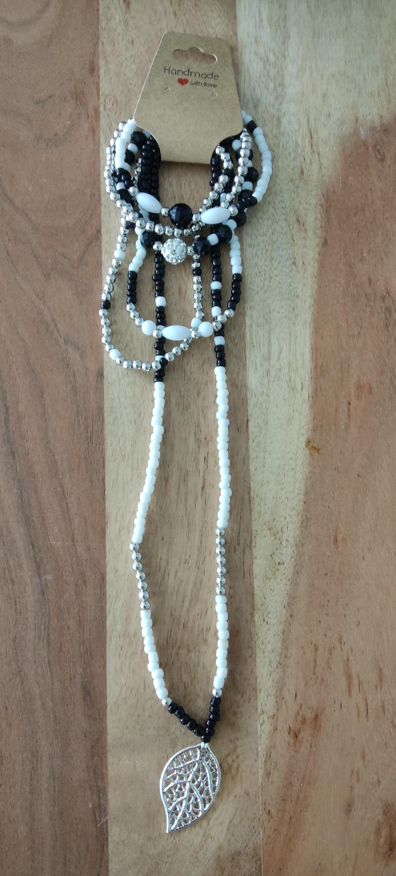 Ibiza Boho Necklace Set, 6 pieces, Black & White, consisting of a necklace with a silver leaf pendant, three bracelets and two anklets, all black and white with subtle silver accents... goes with any summer outfit, sweet details, color-coordinated, all made of stretch material, simply slip it on and you're done!