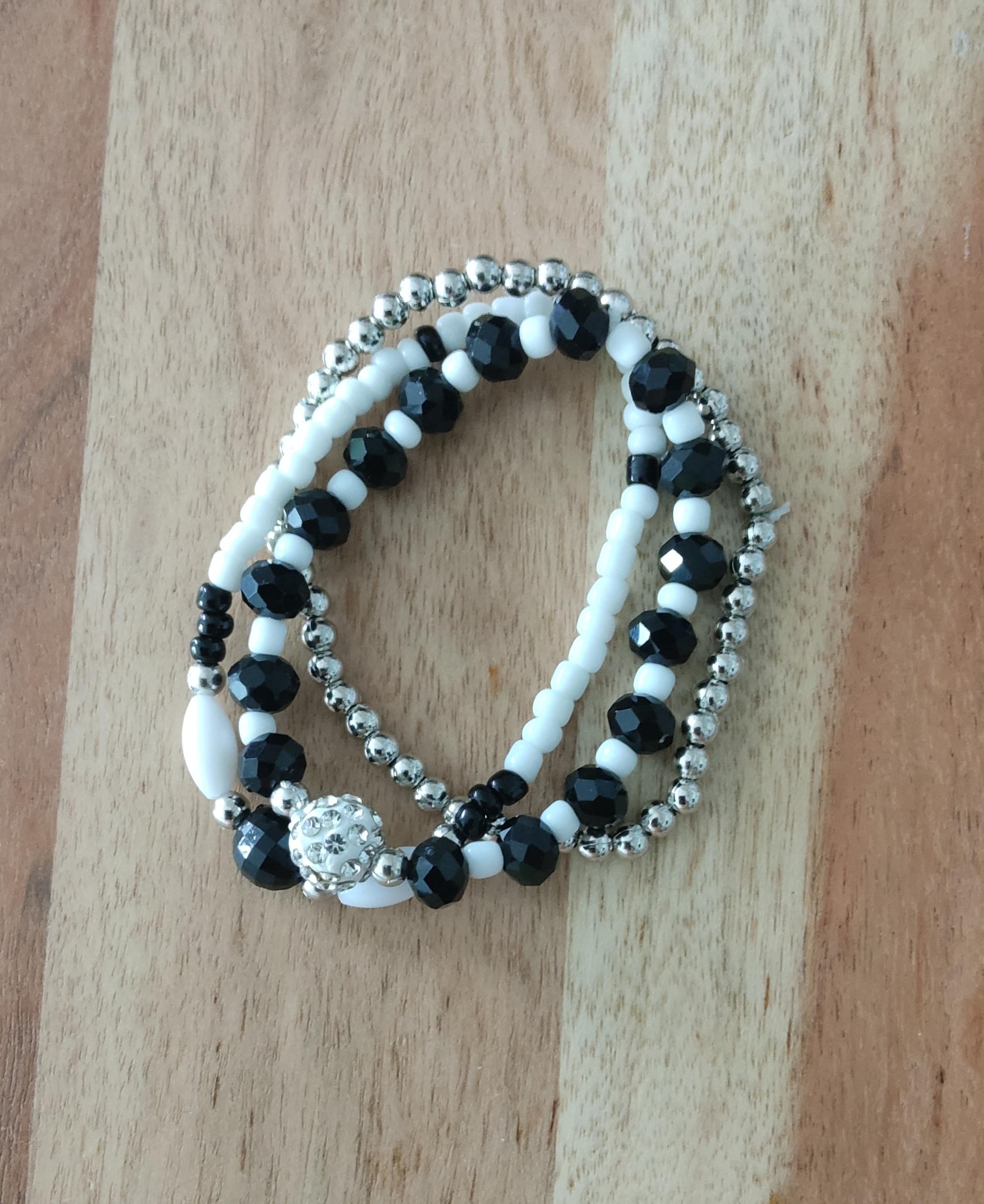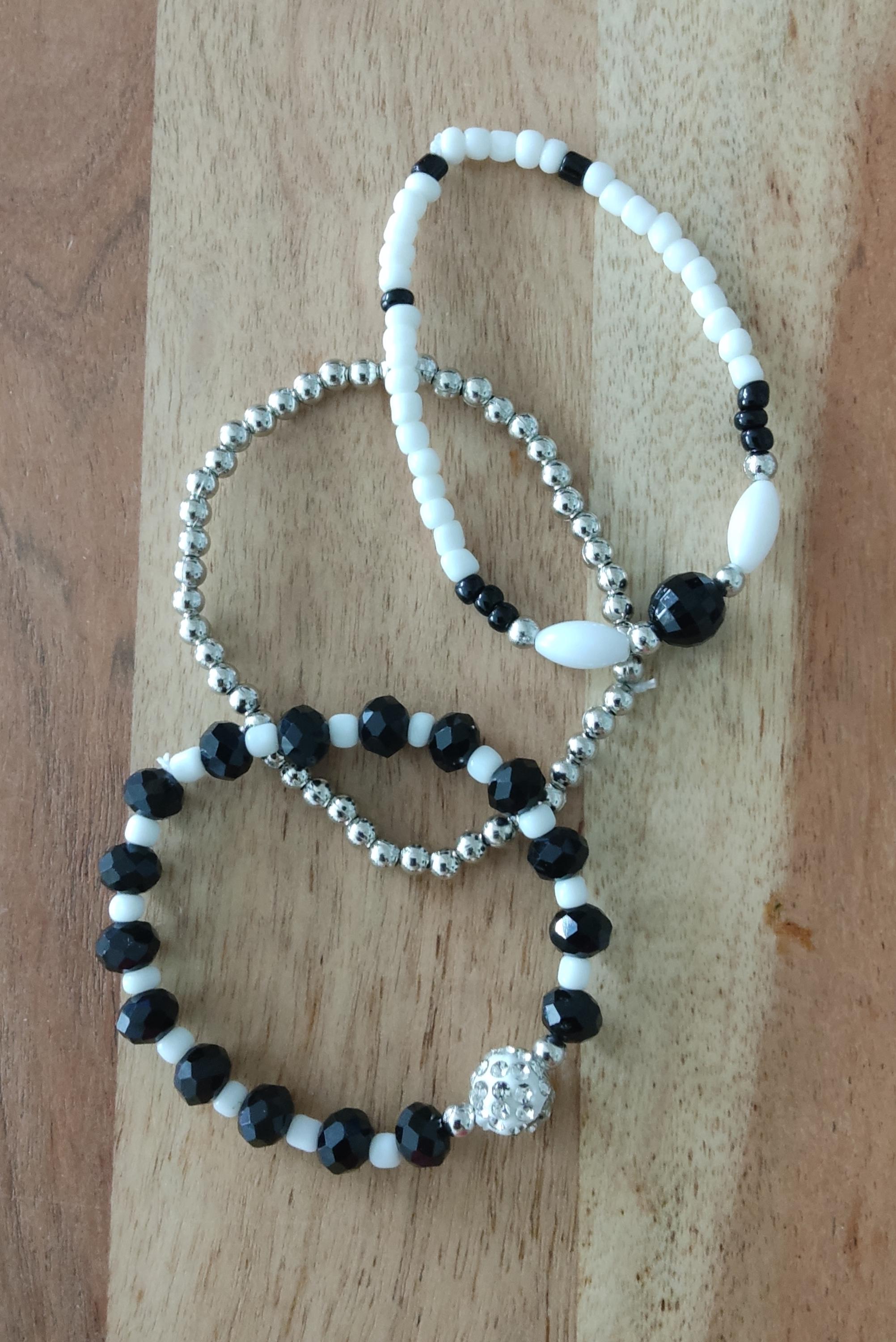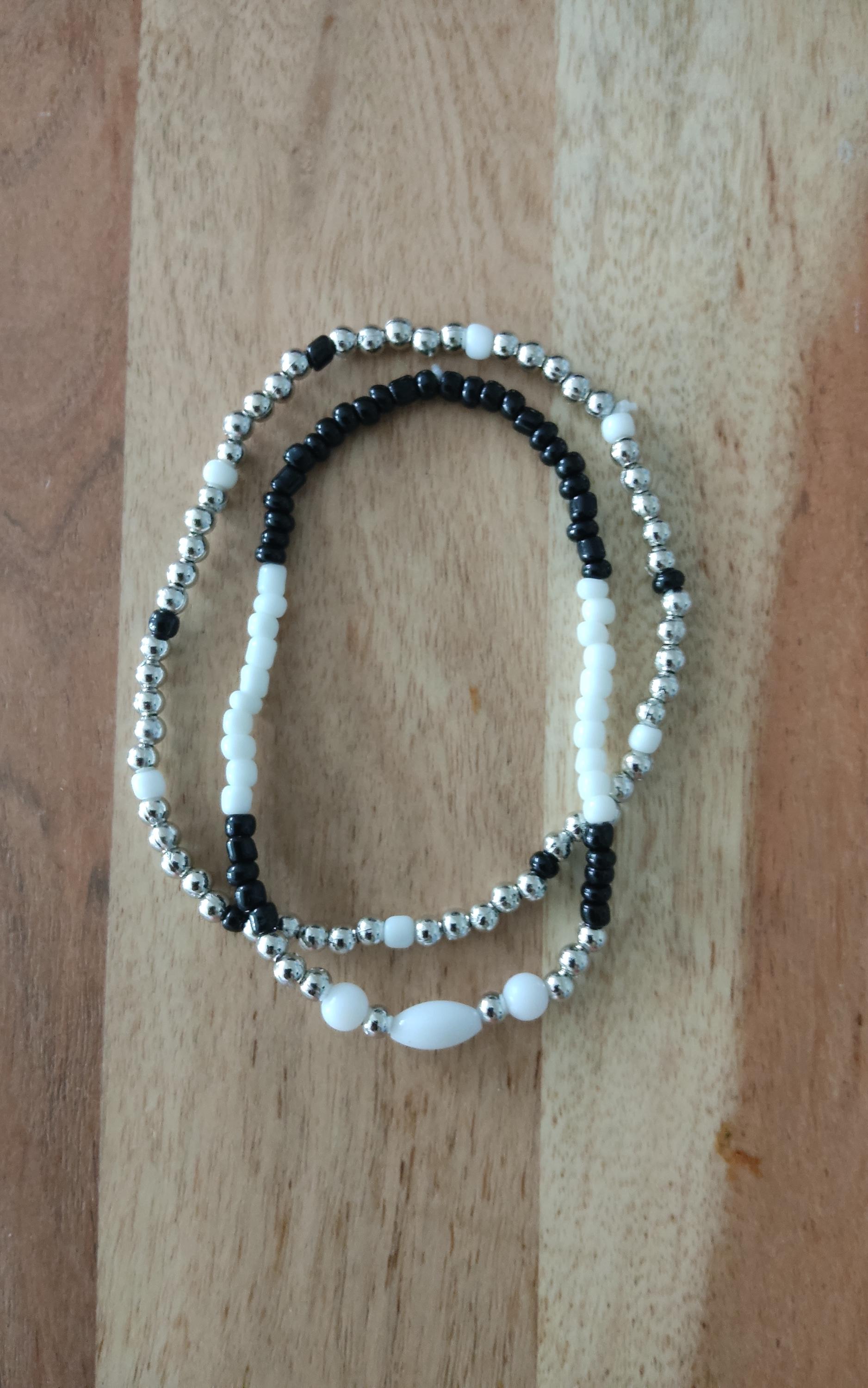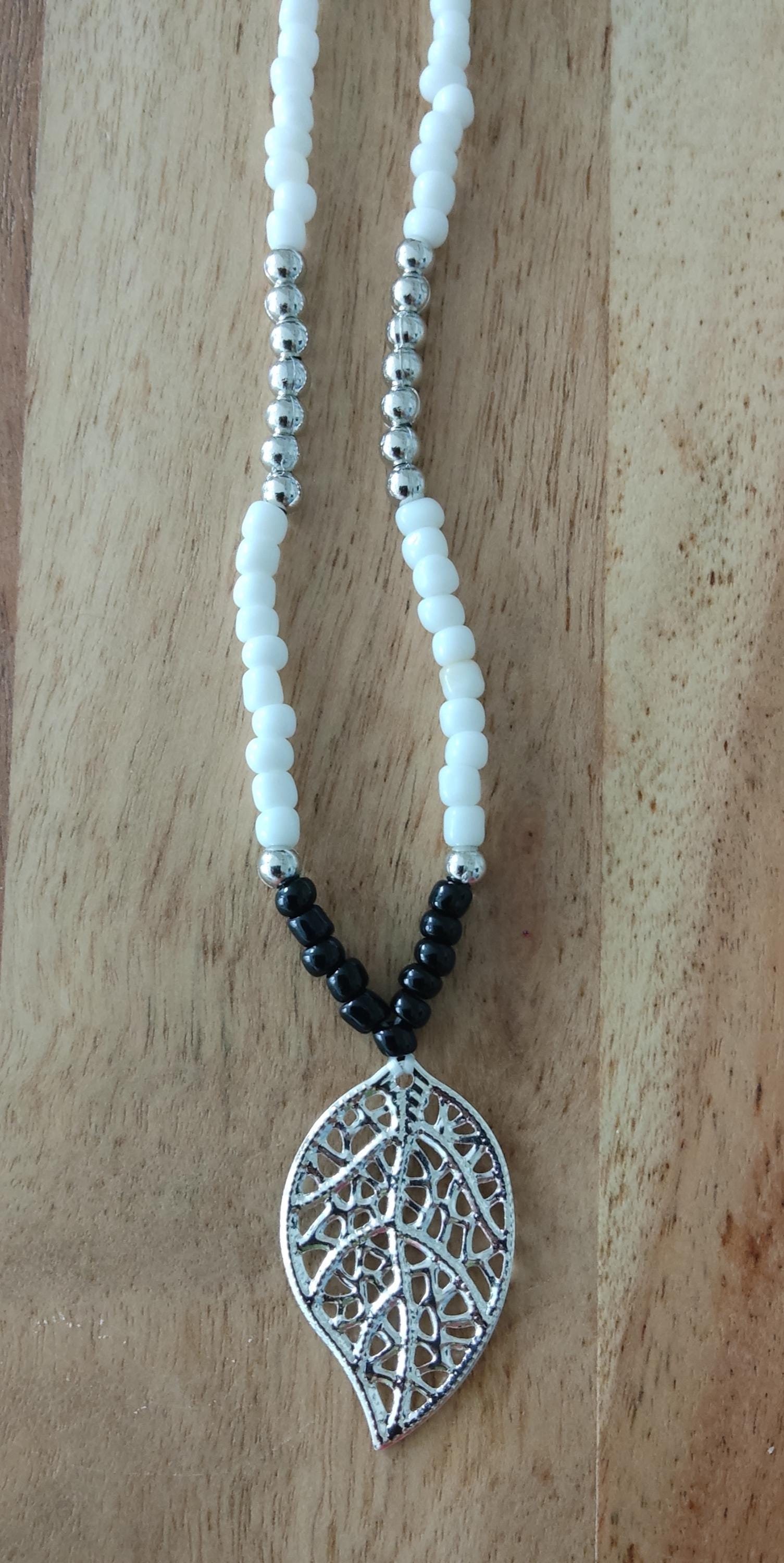 Ibiza Boho Necklace Set, 6 pieces, Black & White, consisting of a necklace with a silver leaf pendant, three bracelets and two anklets, all black and white with subtle silver accents... goes with any summer outfit, sweet details, color-coordinated, all made of stretch material, simply slip it on and you're done!