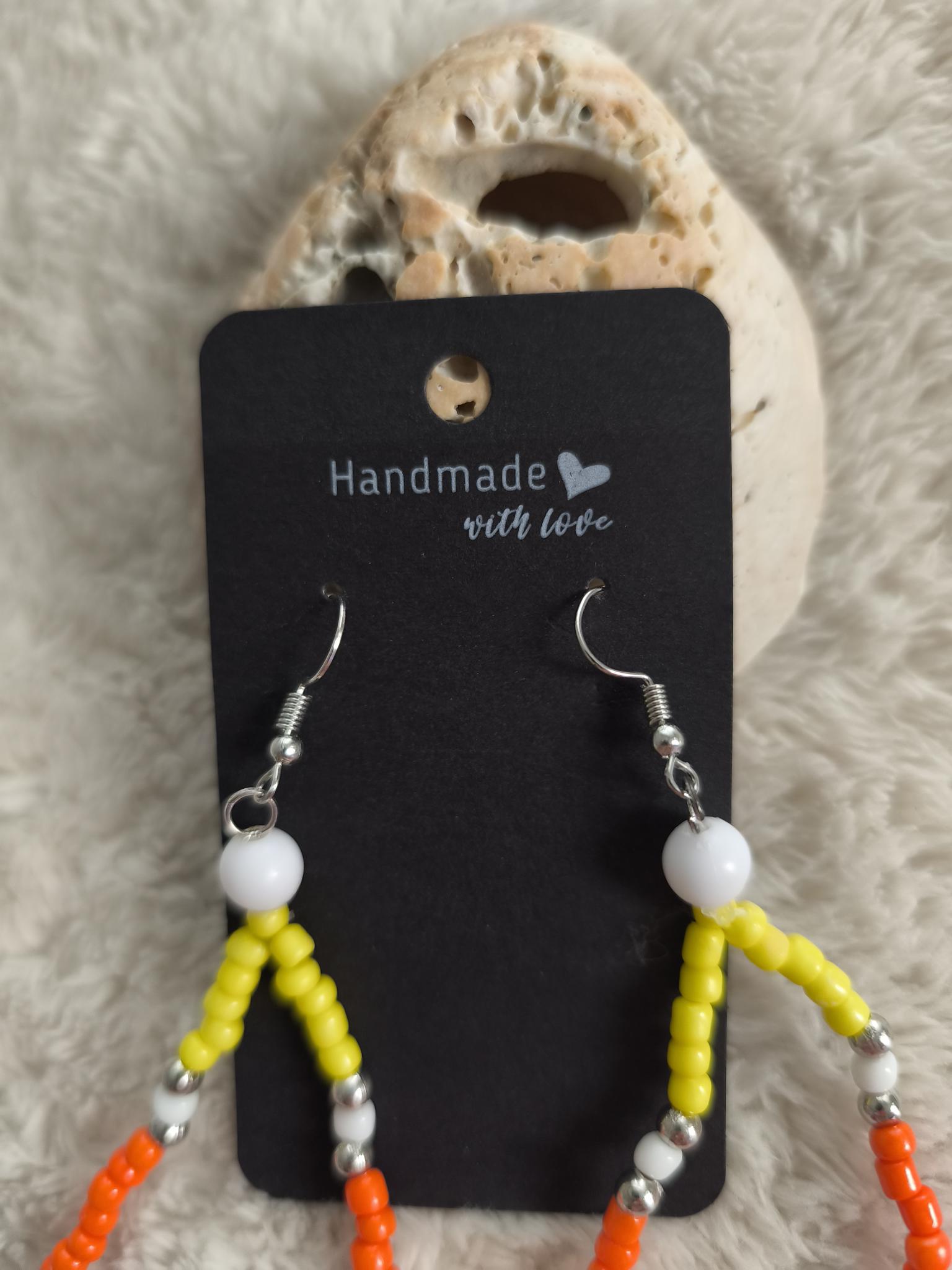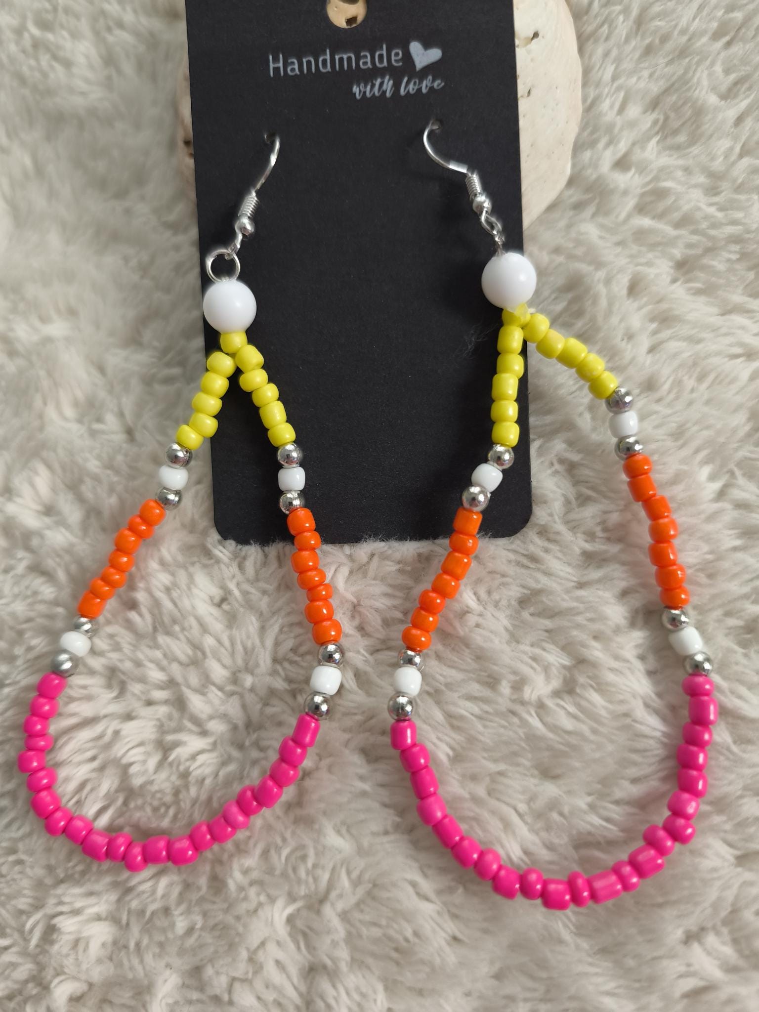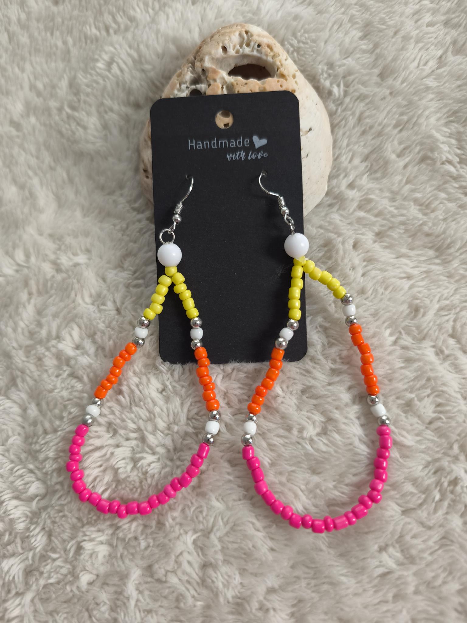 For those seeking something special... pretty long Ibiza boho earrings with a small clasp at the back to prevent loss, in gorgeous summery colors of pink, orange, yellow, and white with silver accents. Unique and new!
