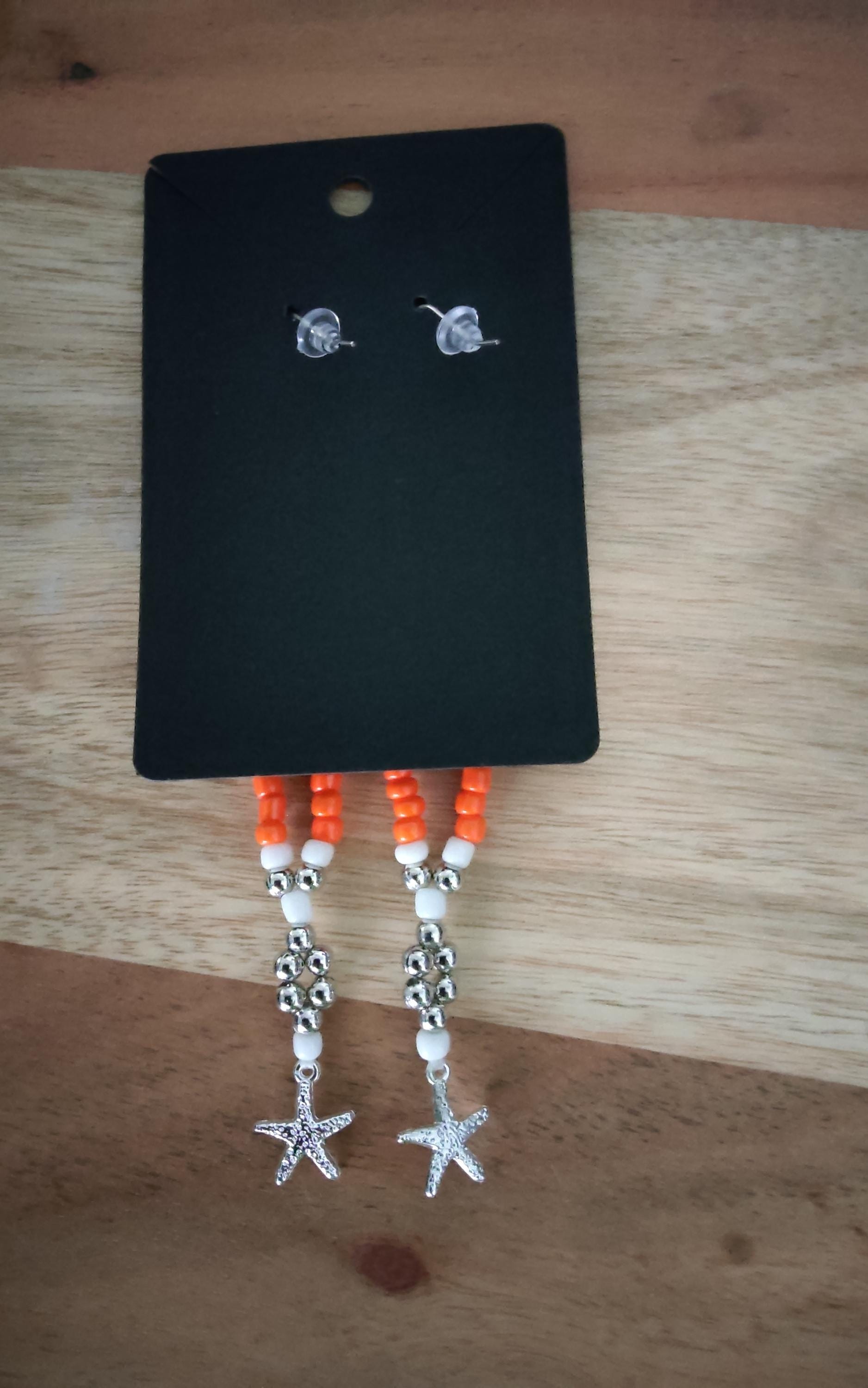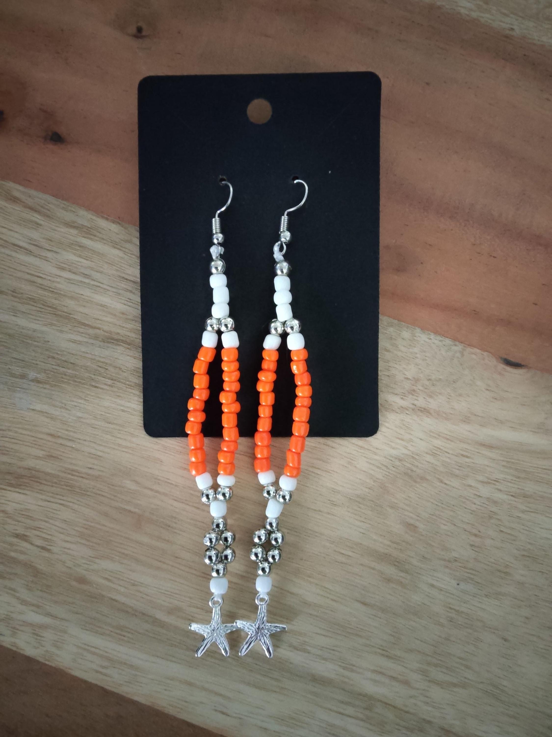Pretty long Ibiza earrings in orange, white with silver, boho, hippie, Ibiza style. With silicone stoppers on the back so they won't get lost.