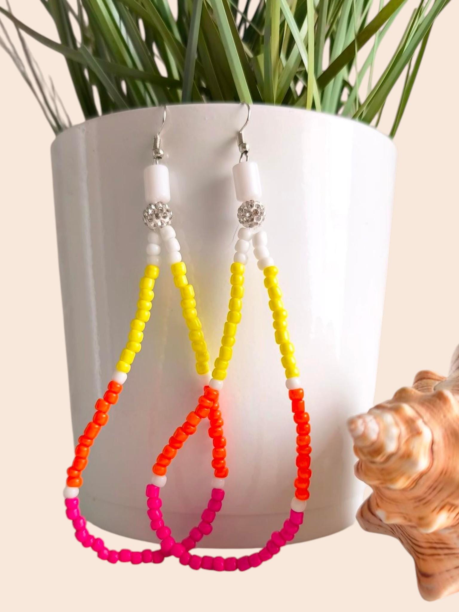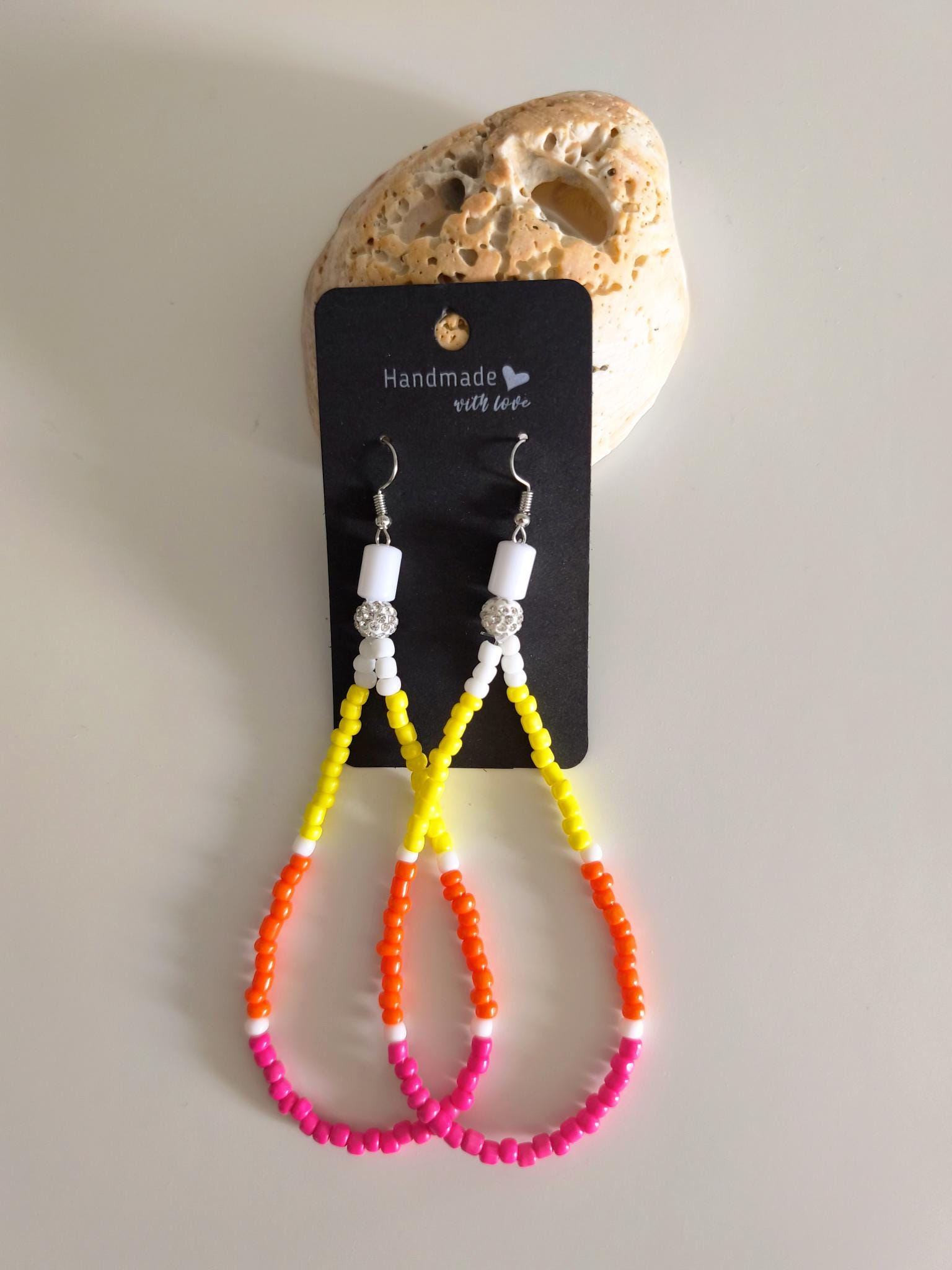 Pretty long Ibiza Boho earrings with hooks, featuring small silicone stoppers at the back to prevent them from getting lost.