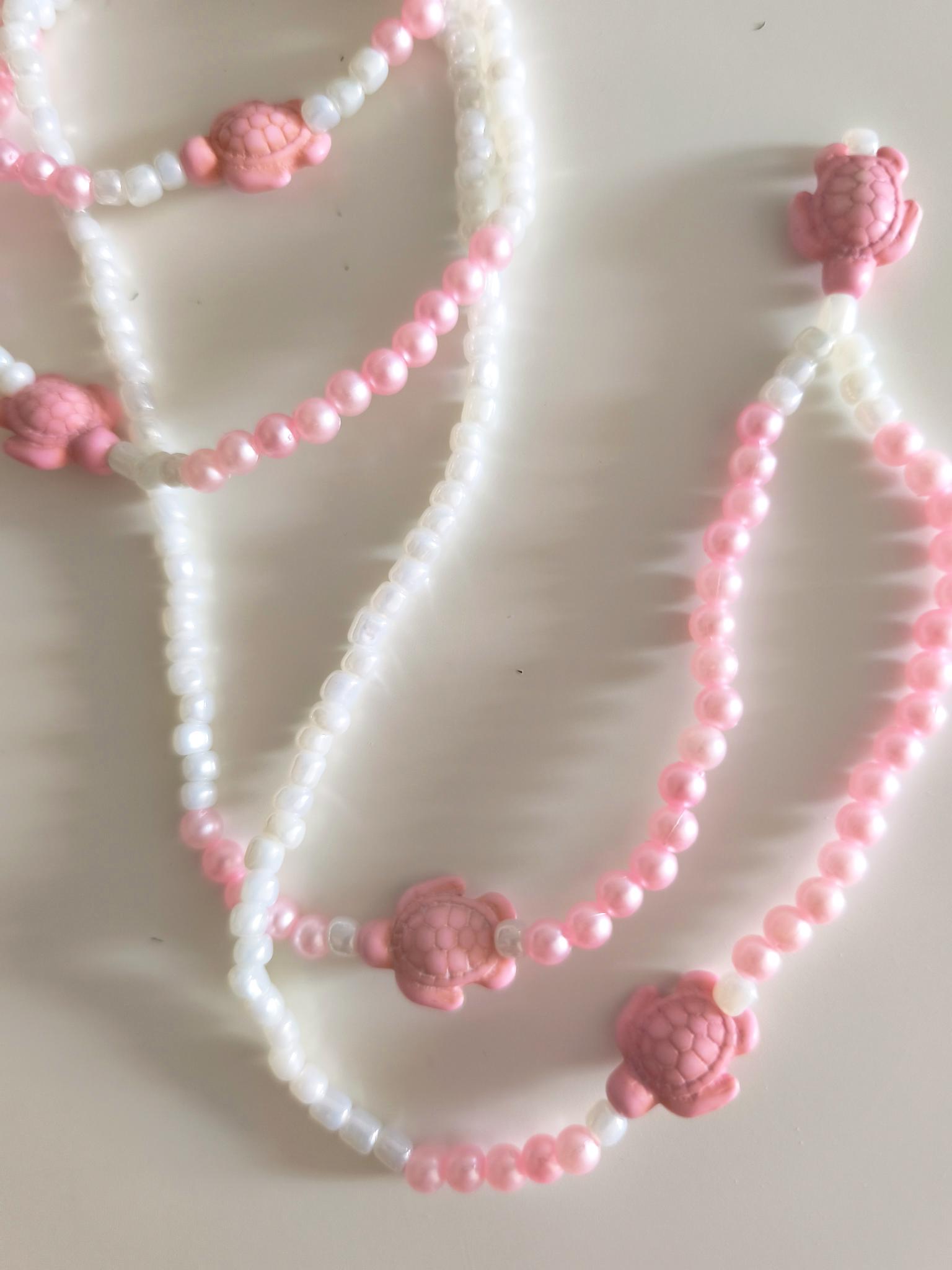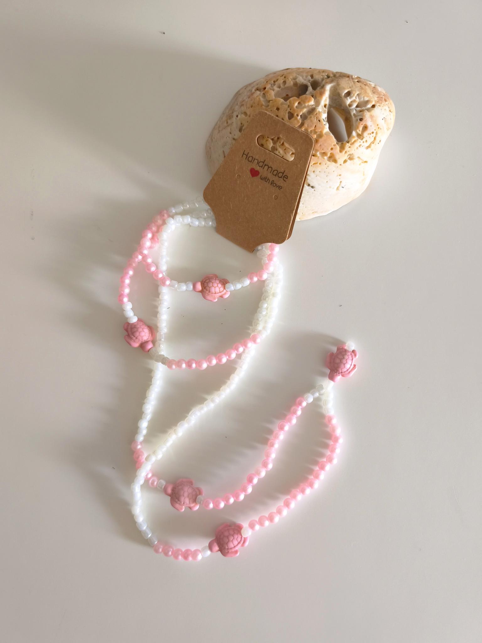 Sweet Ibiza Boho necklace set, 3 pieces, consisting of a necklace, a bracelet and an anklet, white and pink pearls with silver accents, cute little turtle pendants also in pink.