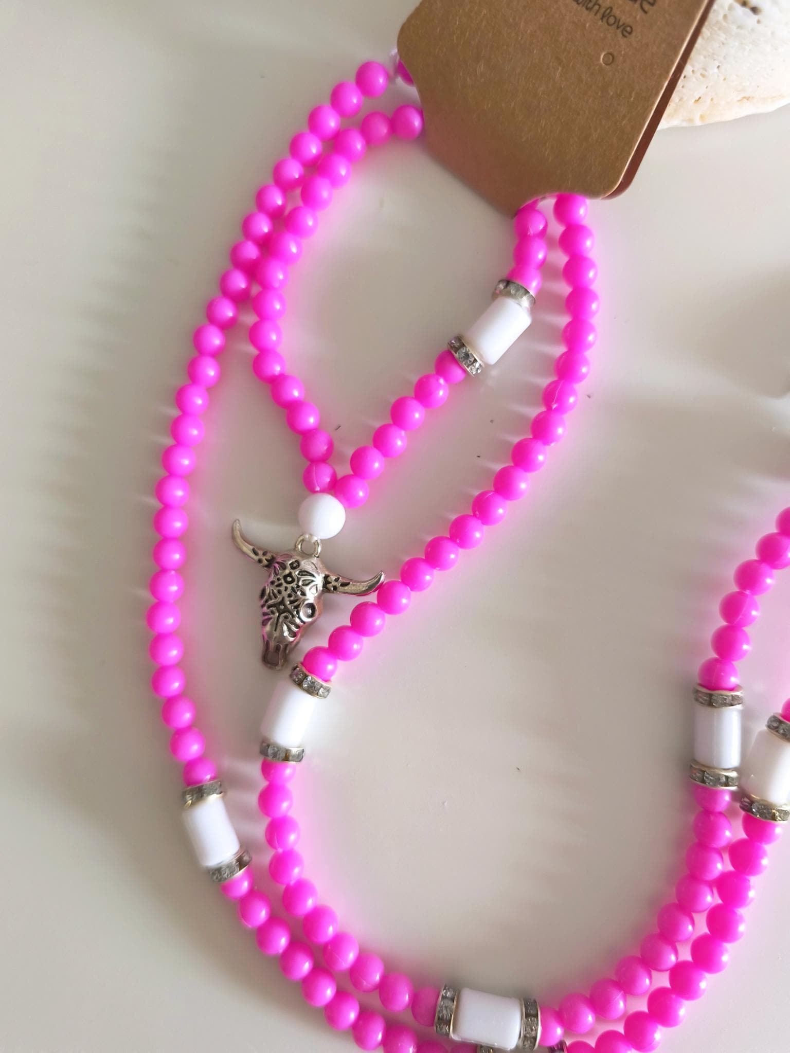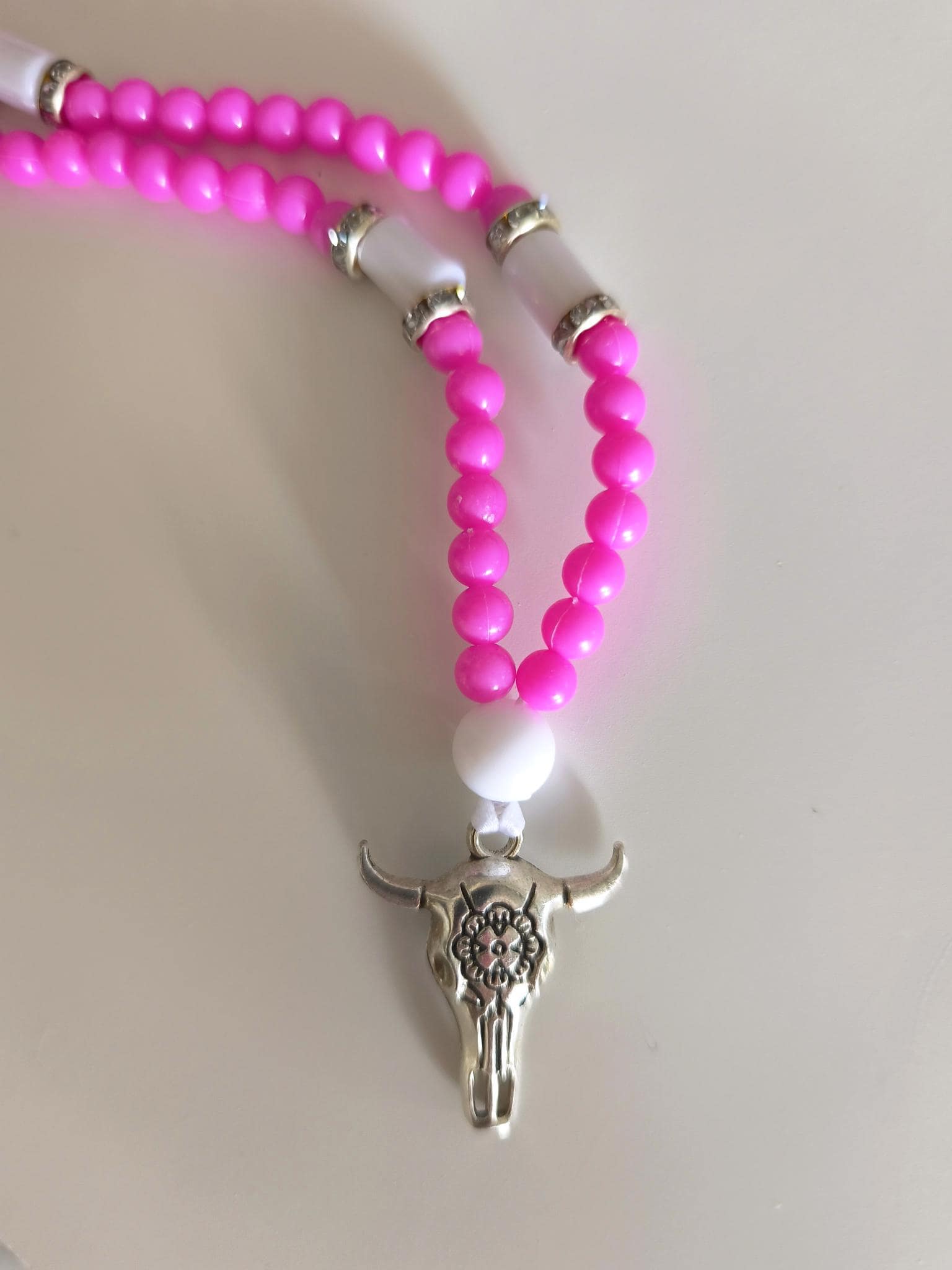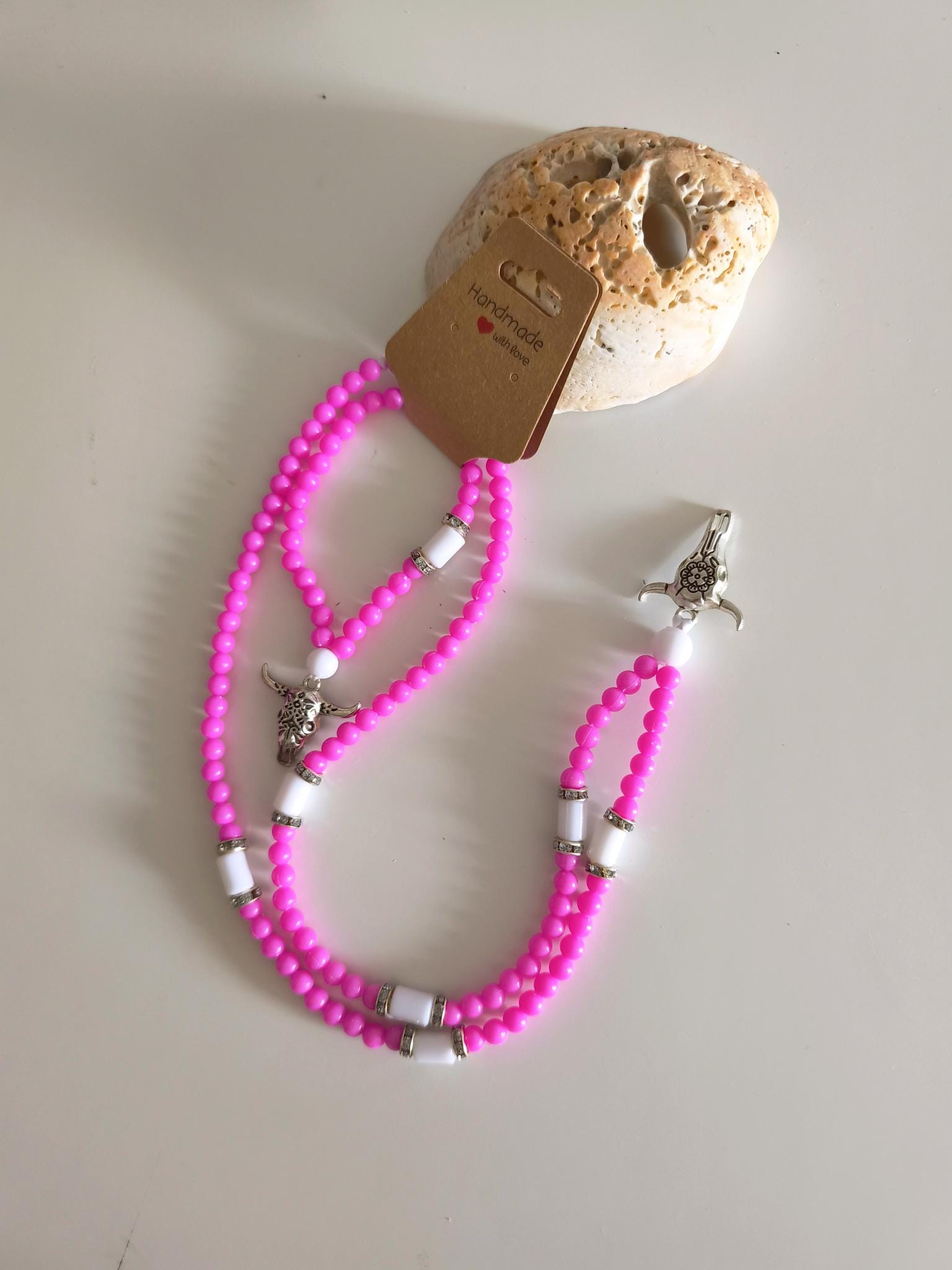 A gorgeous pink holiday accessory set, consisting of a necklace (solid) and a bracelet (stretch), both coordinated in pink with white and silver accents, each adorned with a silver bull's head pendant. Ibiza boho style. A must-have for every boho lover!