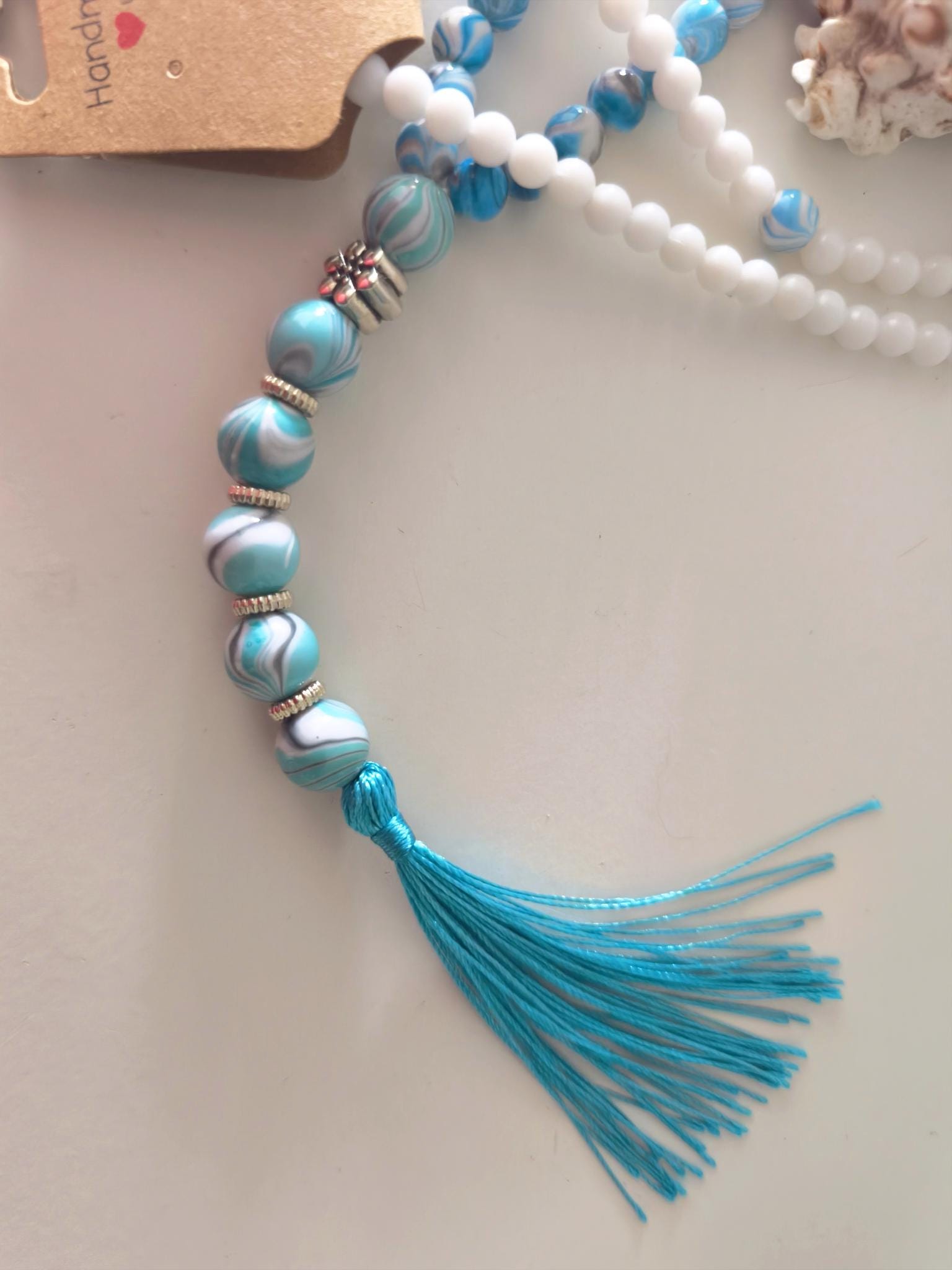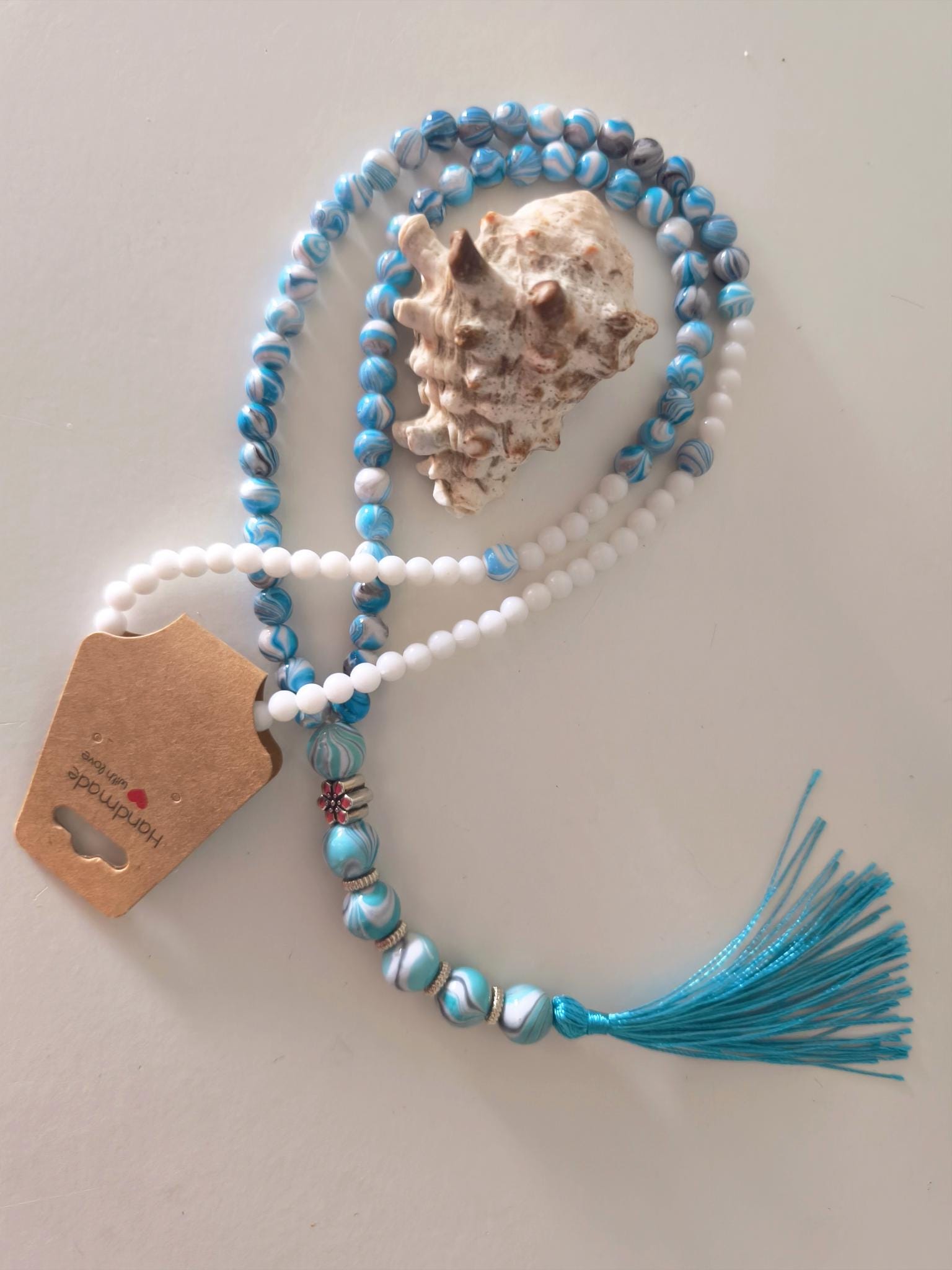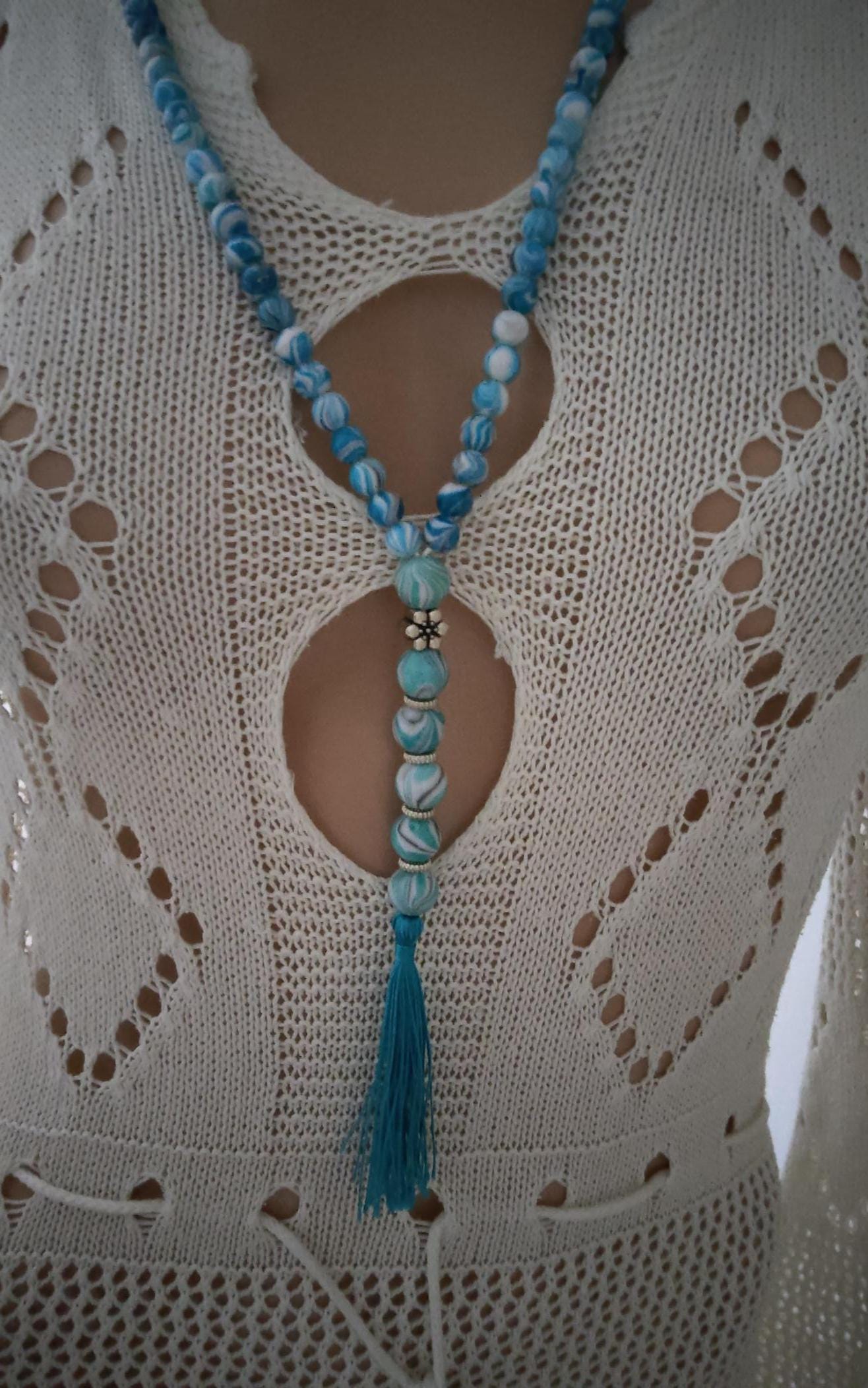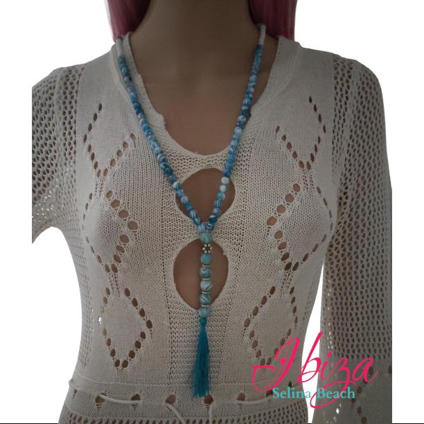 IBIZA Boho necklace XXL, handmade, acrylic beads with a turquoise/white pattern, silver accessories and a long turquoise pom-pom as a pendant.