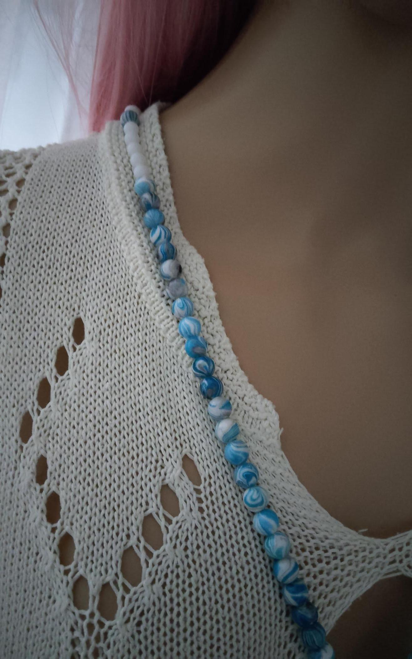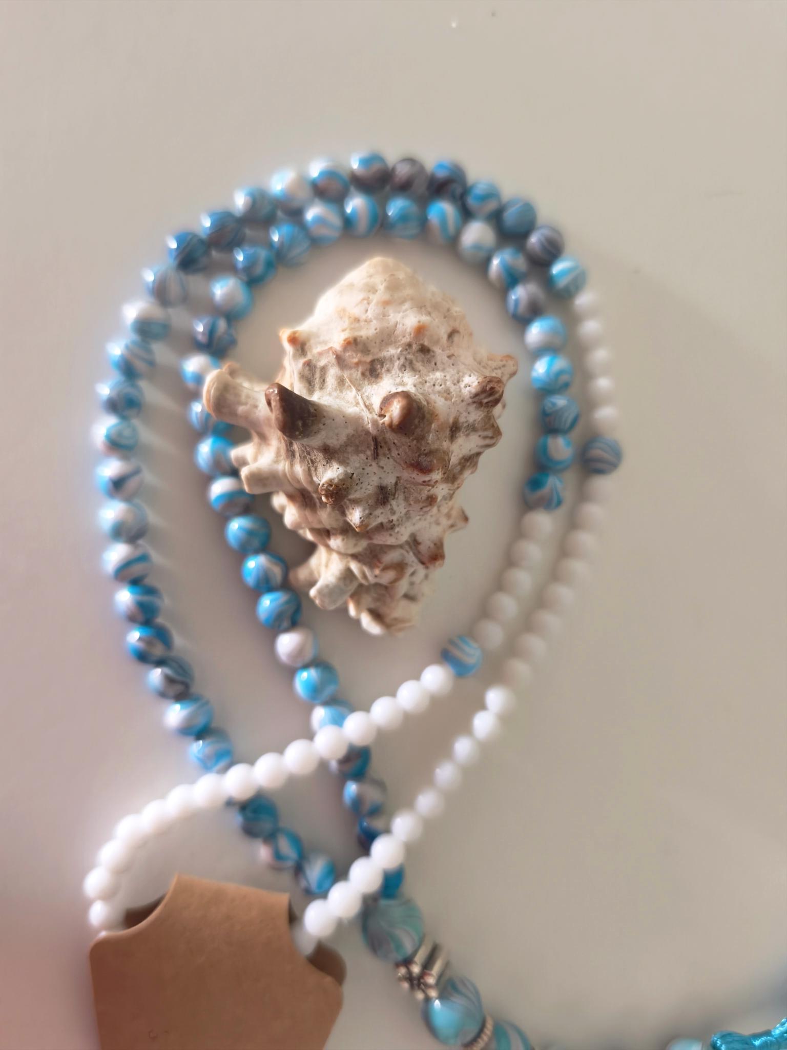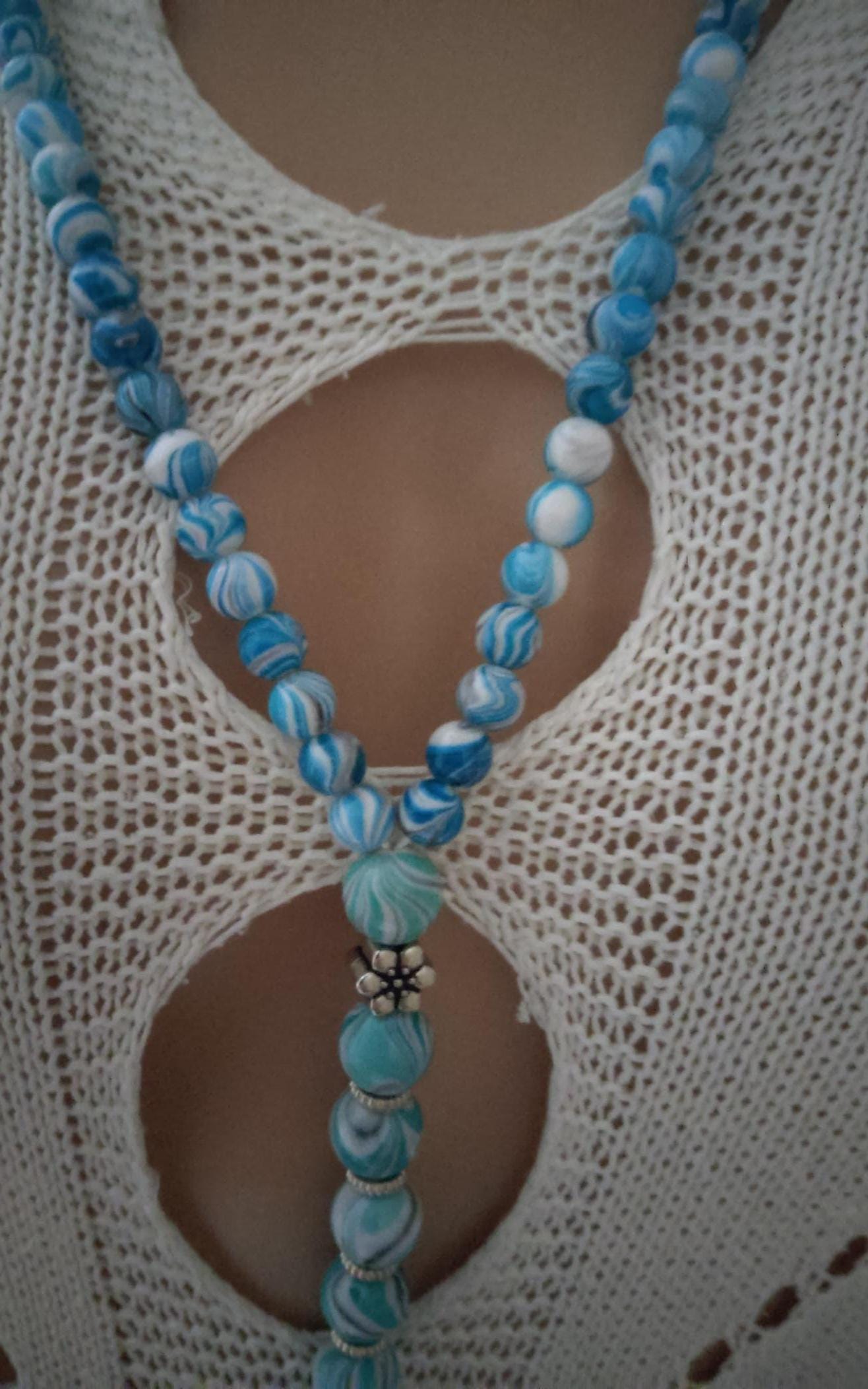 IBIZA Boho necklace XXL, handmade, acrylic beads with a turquoise/white pattern, silver accessories and a long turquoise pom-pom as a pendant.