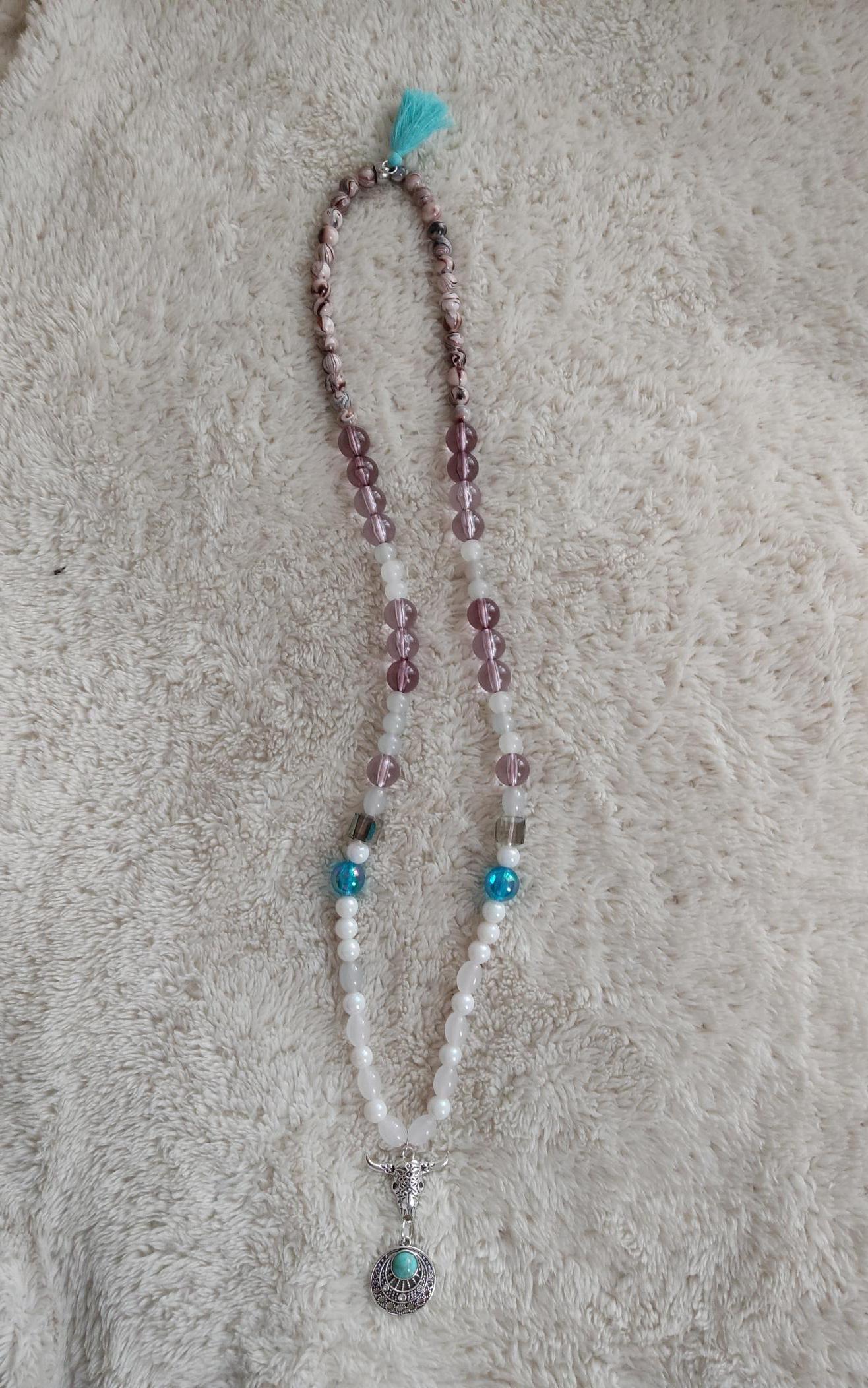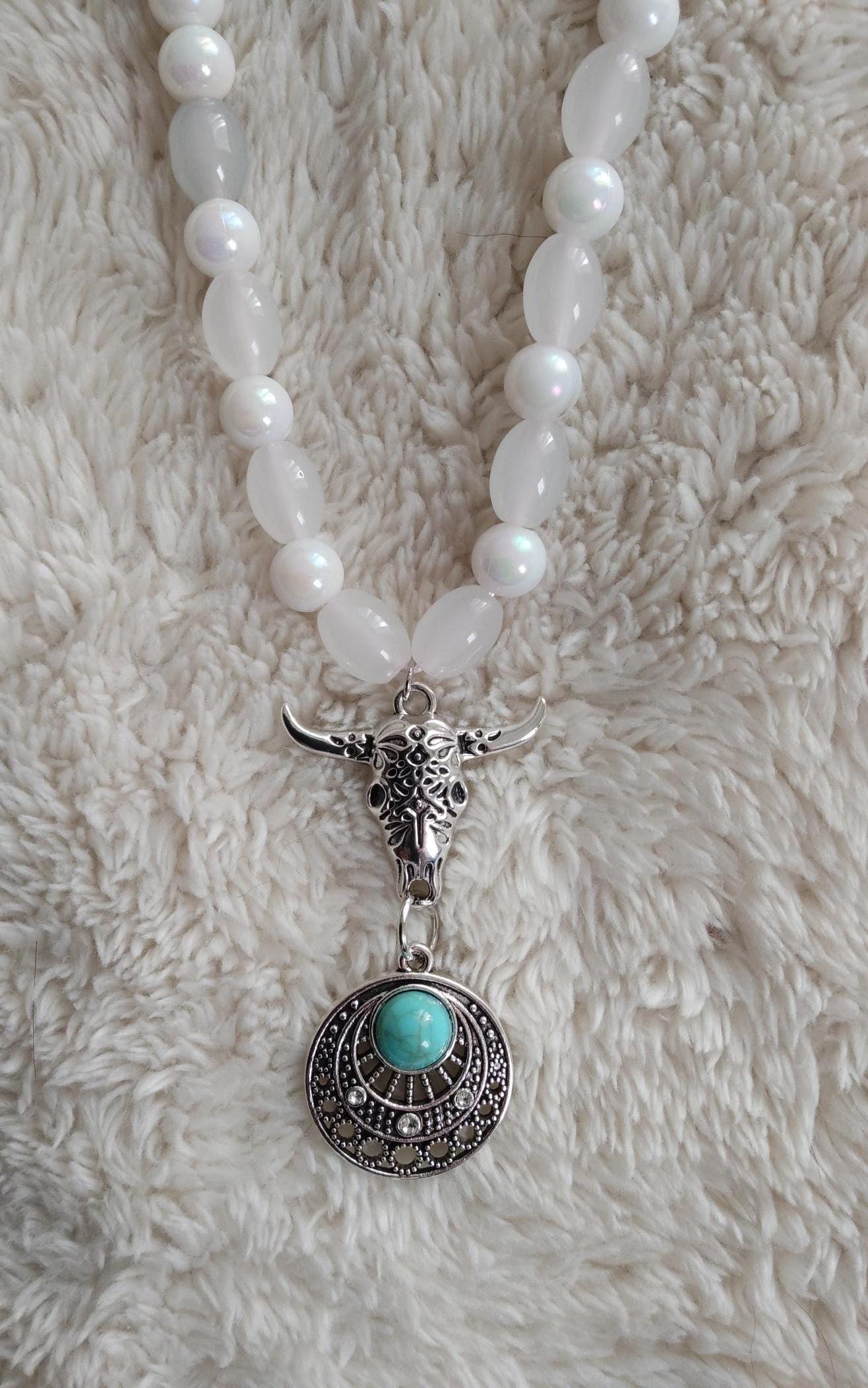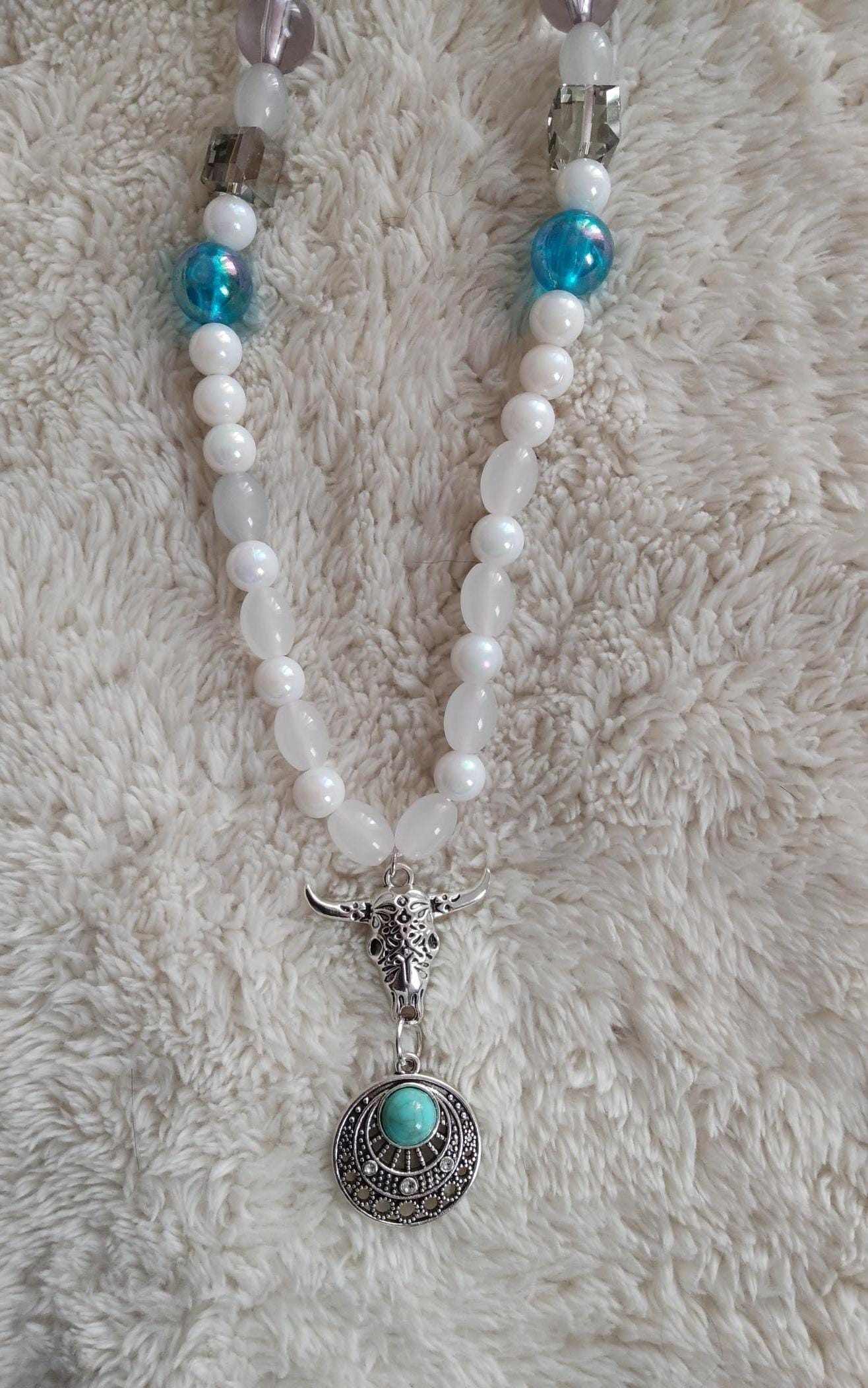 IBIZA BOHO necklace with a bull's head and boho pendant in silver. Acrylic beads with a glass look. Summery colors in white, turquoise, and beige. A small turquoise pom-pom adorns the nape of the neck. Sturdy material. Simply slip it on and you're done.