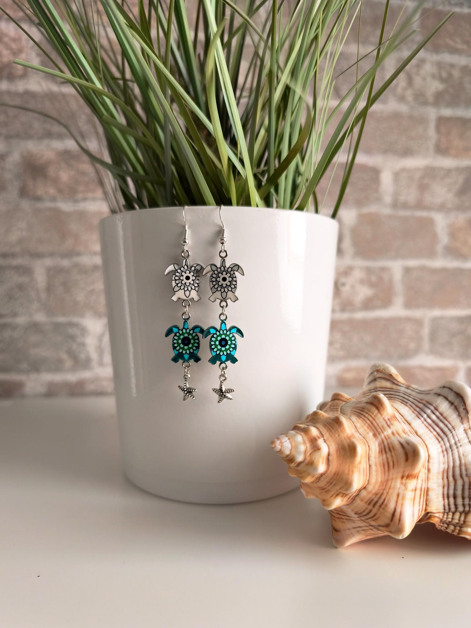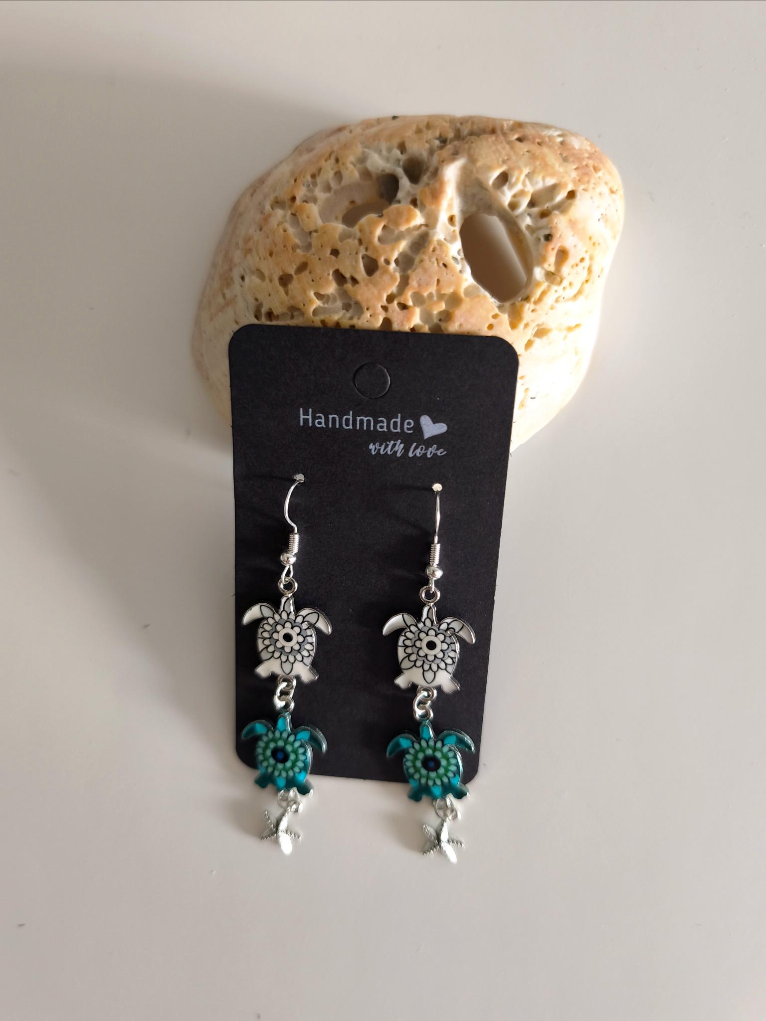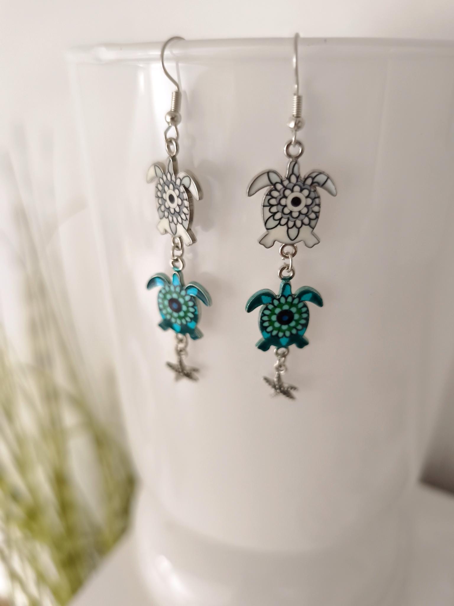 Pretty drop earrings with a silicone clasp at the back. Cute turtle pendants in a mandala style, in white and turquoise with a small silver starfish.
