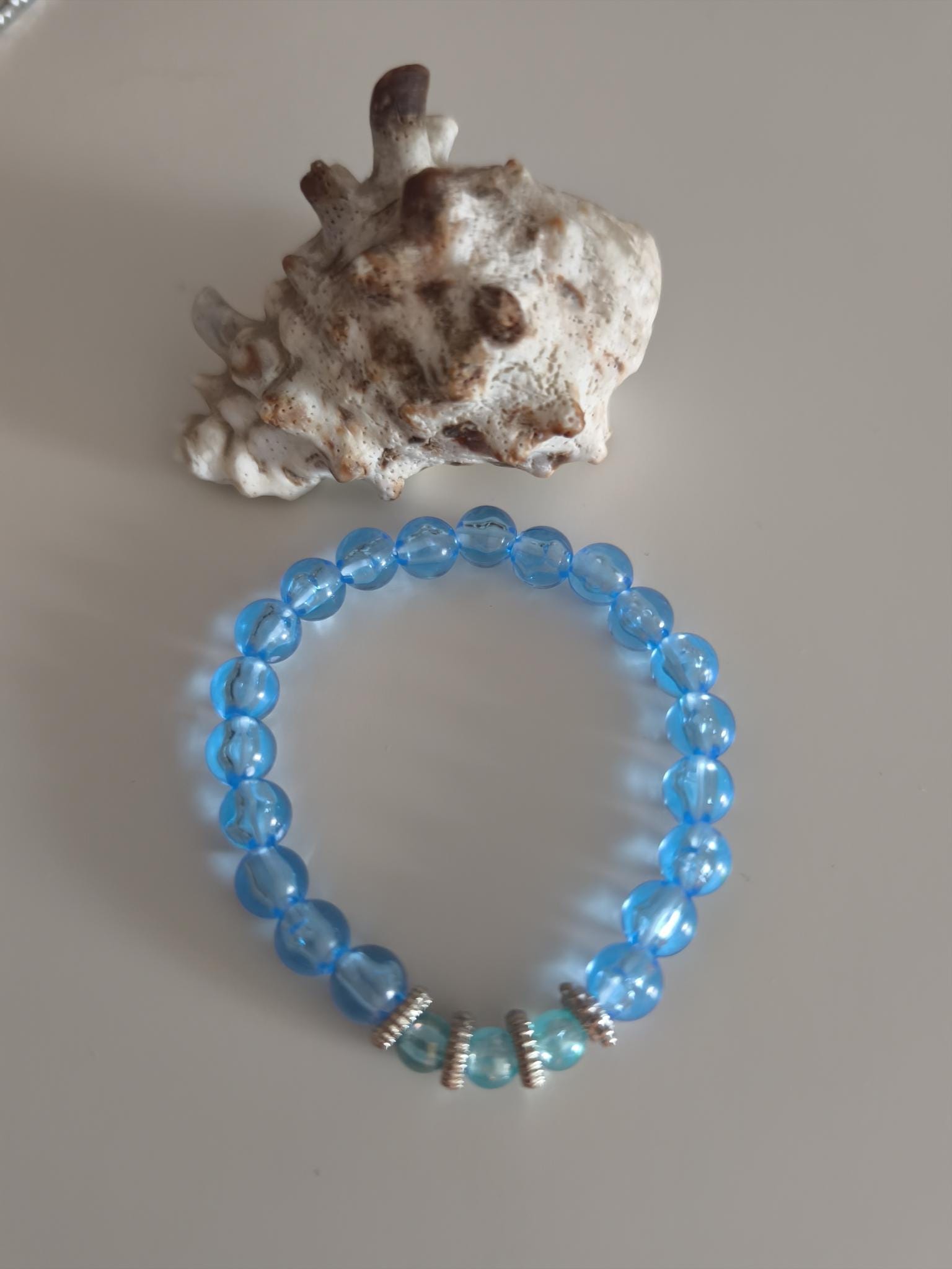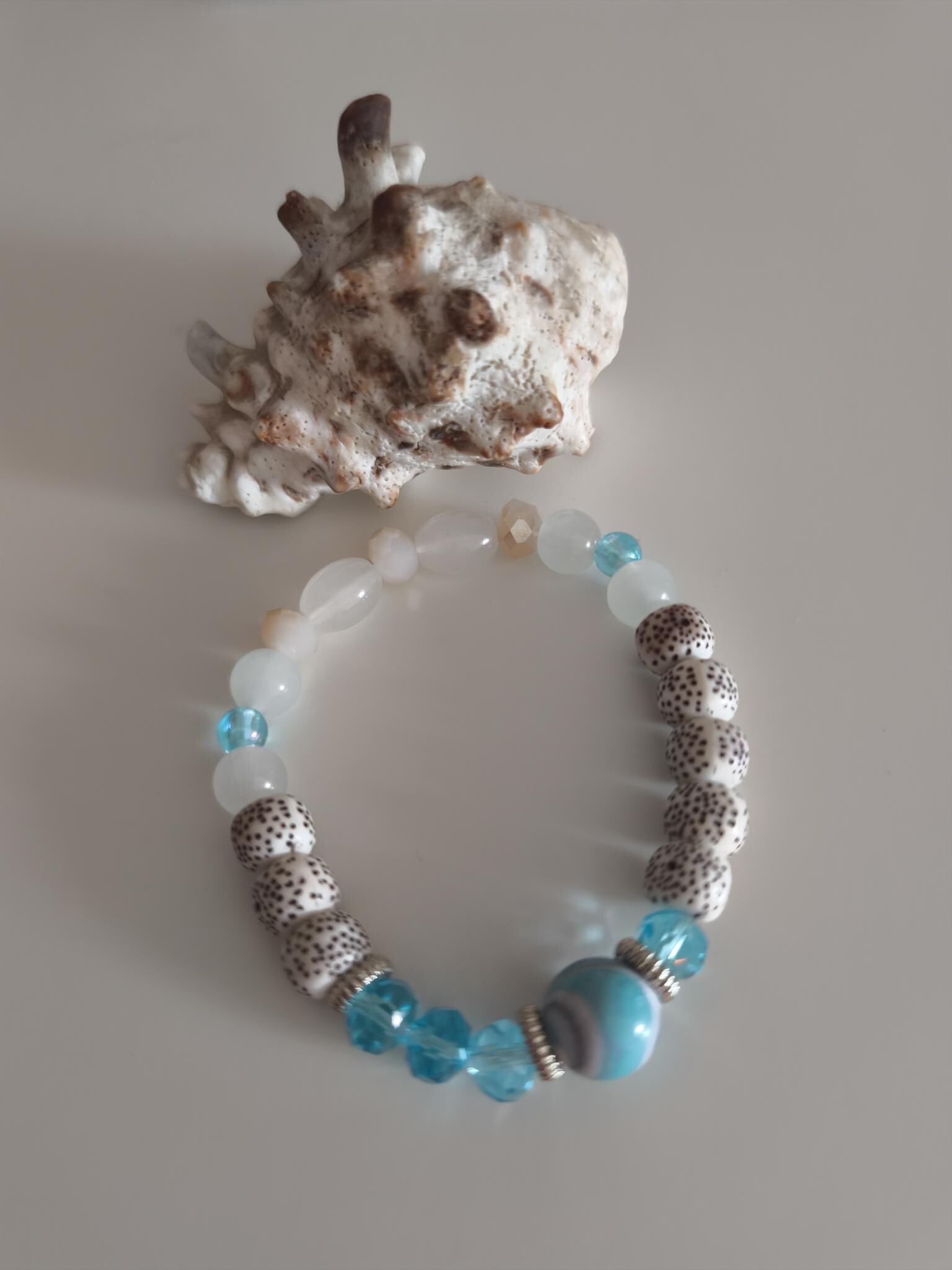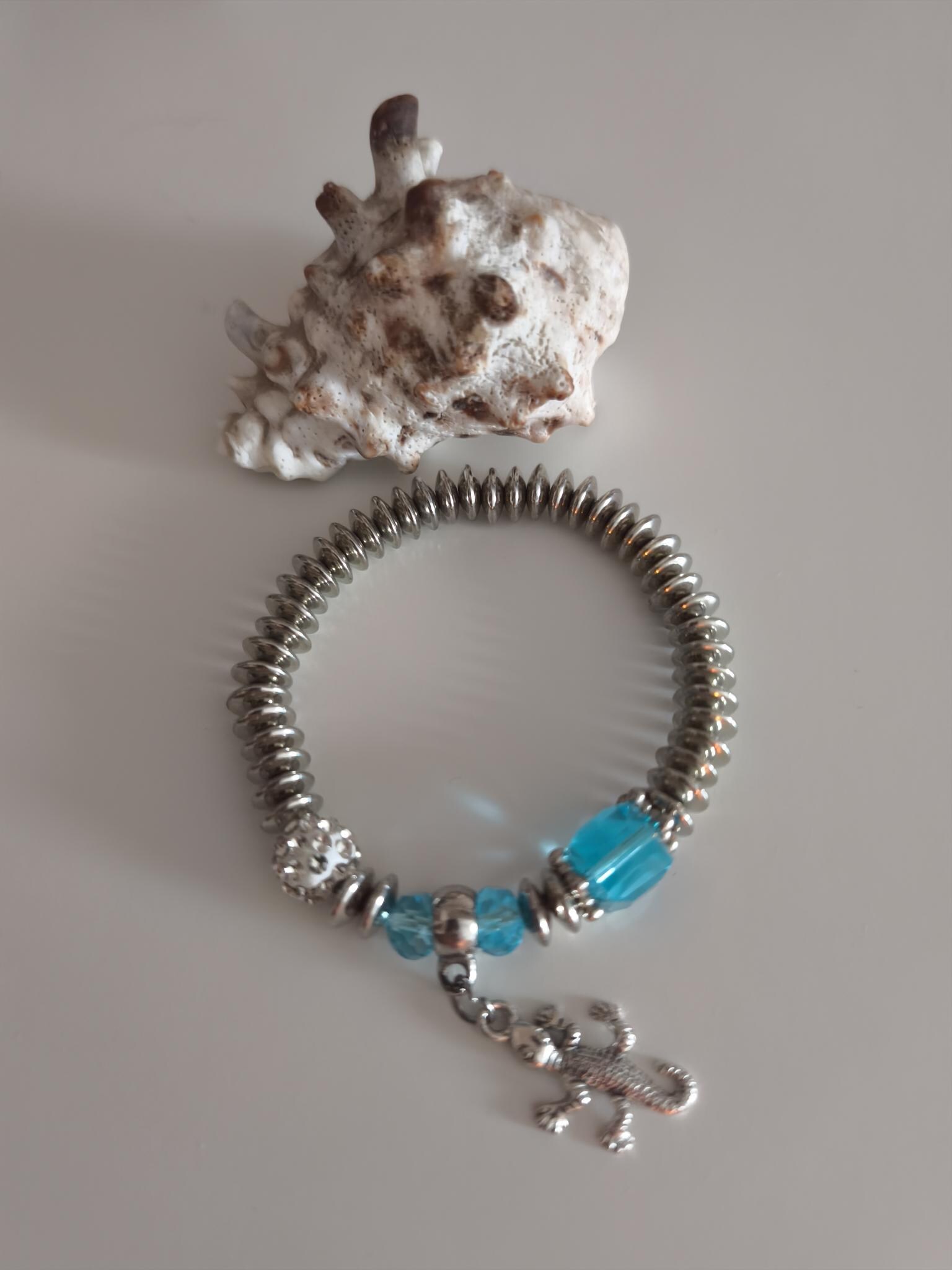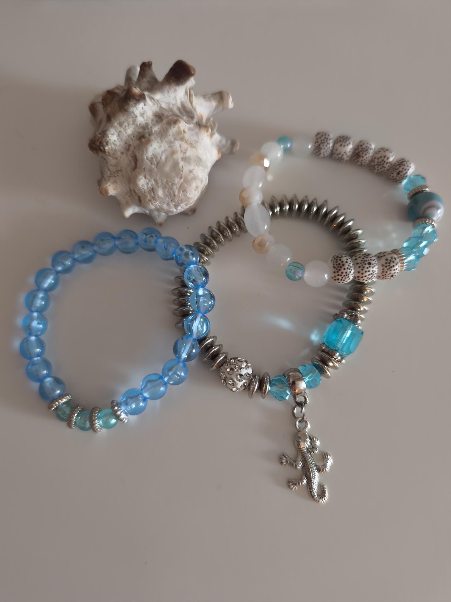 Boho bracelet set consisting of three coordinated beaded bracelets. Pure summer feeling. Summery colors: turquoise, azure blue, white, accented with silver accessories. Highlight: a cute little gecko.