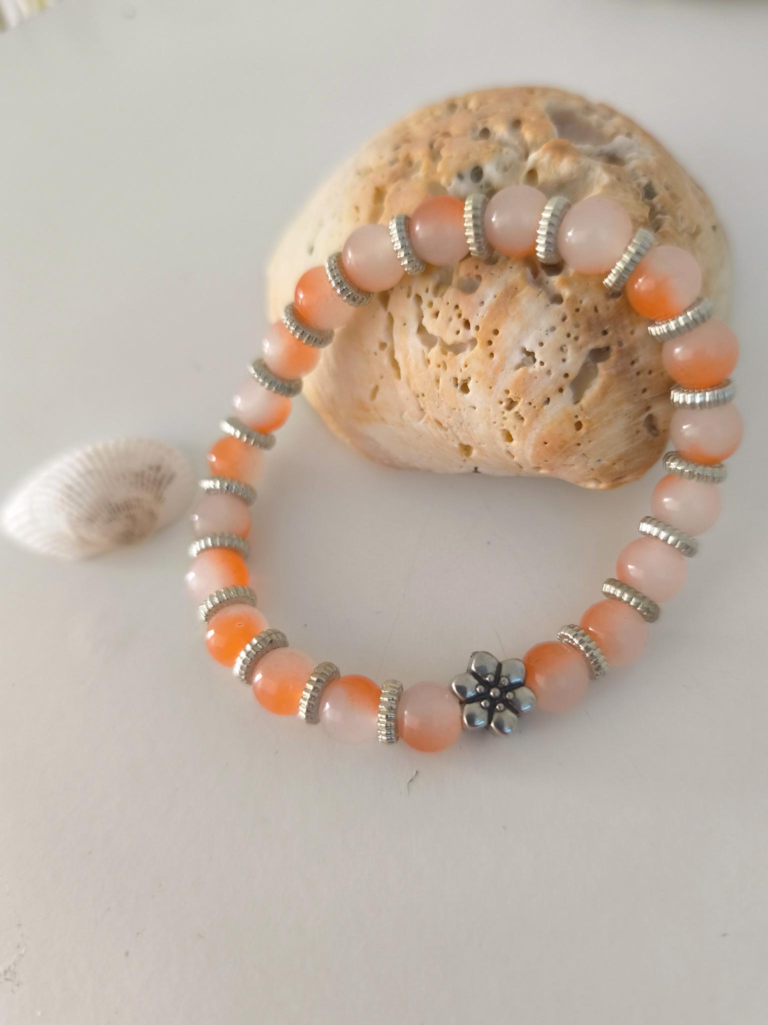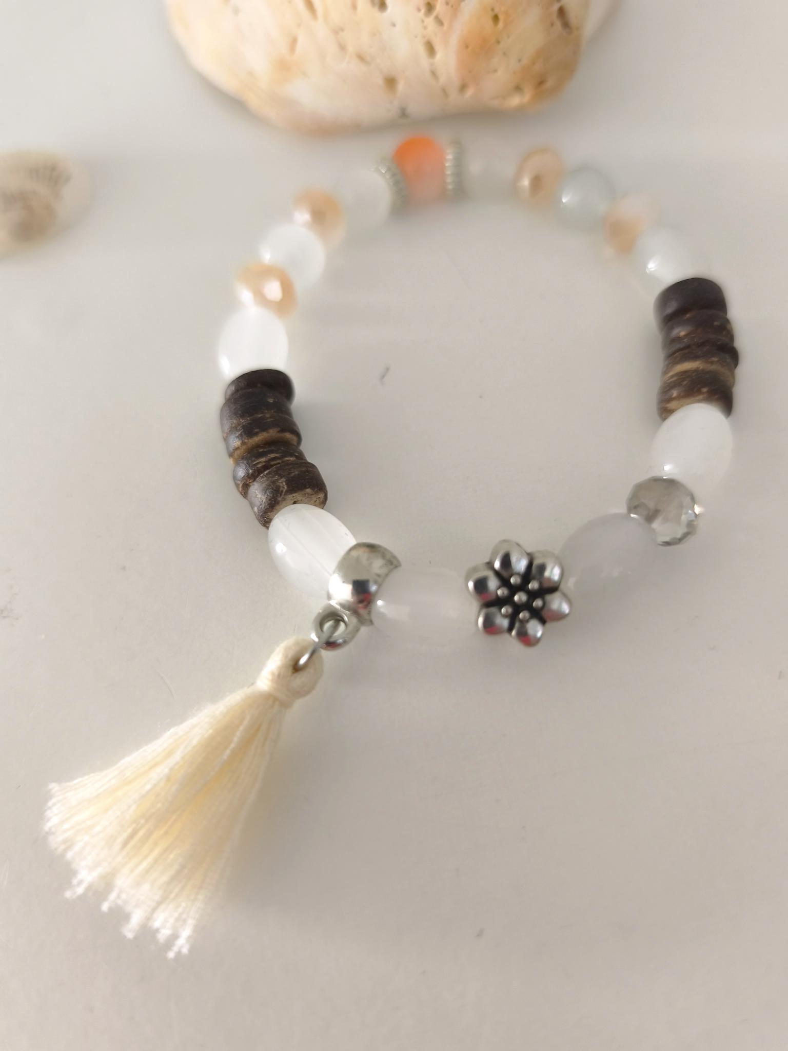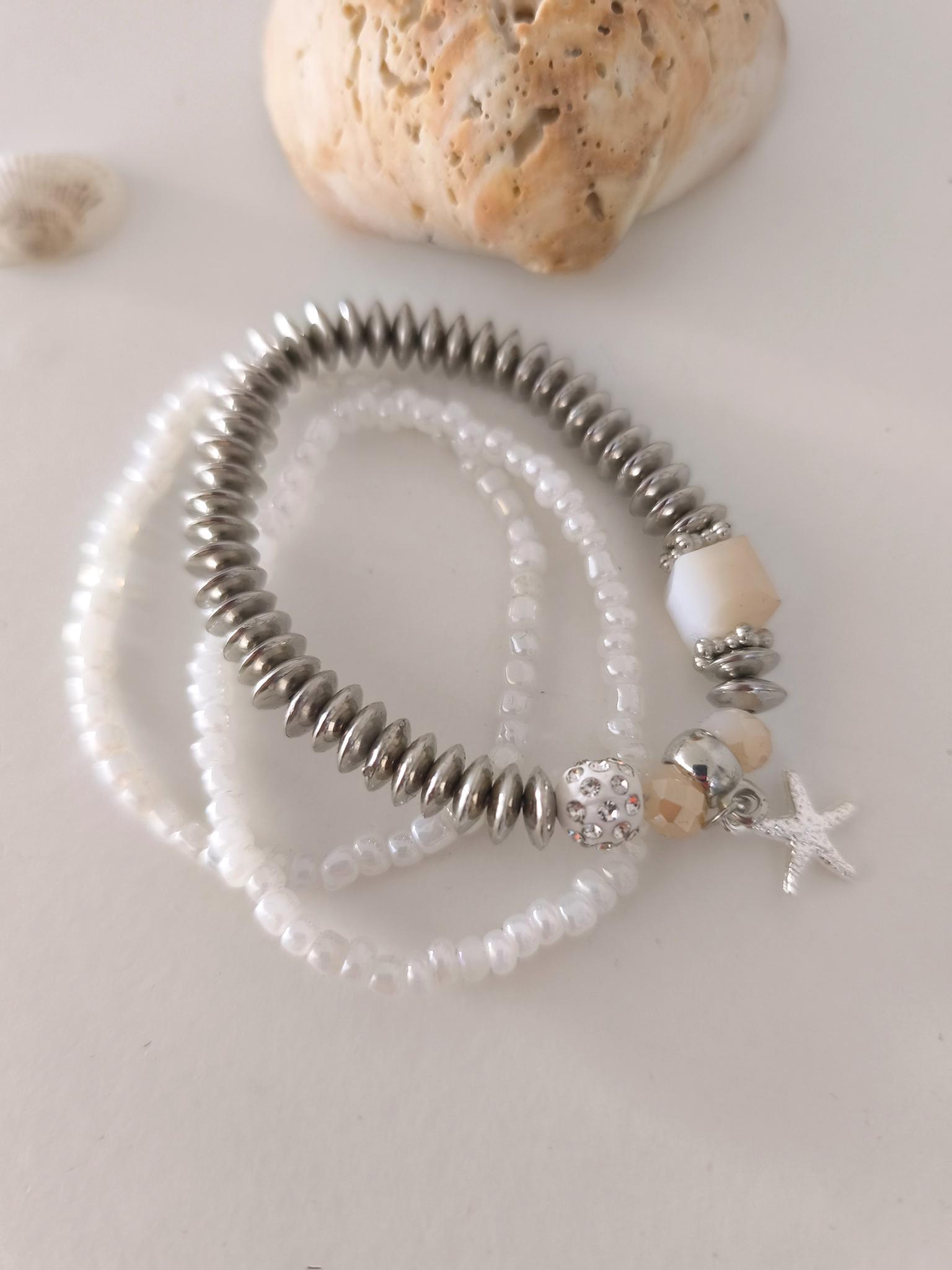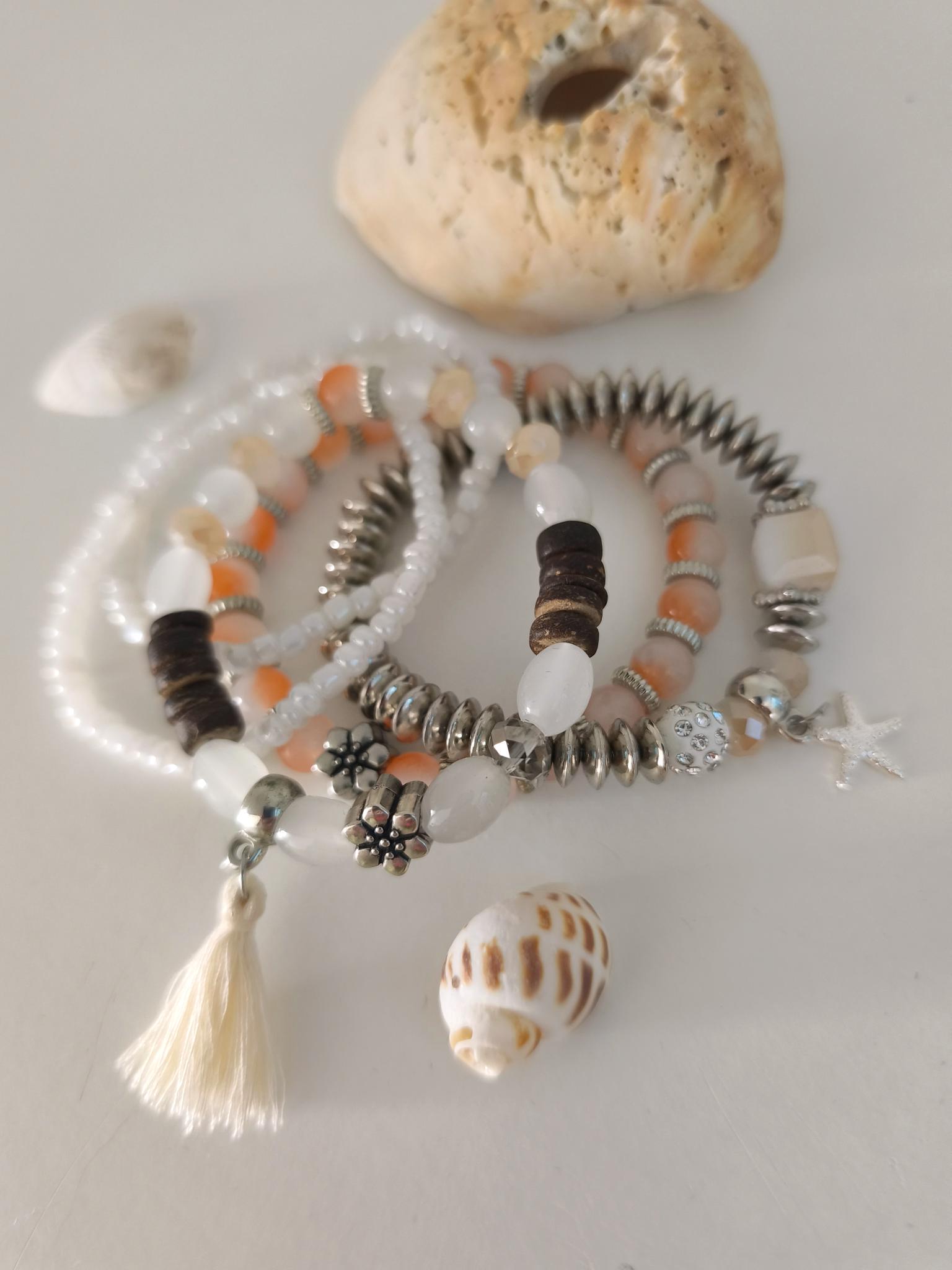 A pretty five-piece beaded bracelet in summery white/peach with silver accents. Made from a mix of glass and acrylic beads with wooden rings. Beautiful accessories that evoke the feeling of vacation and summer, featuring a small starfish and a pom-pom.