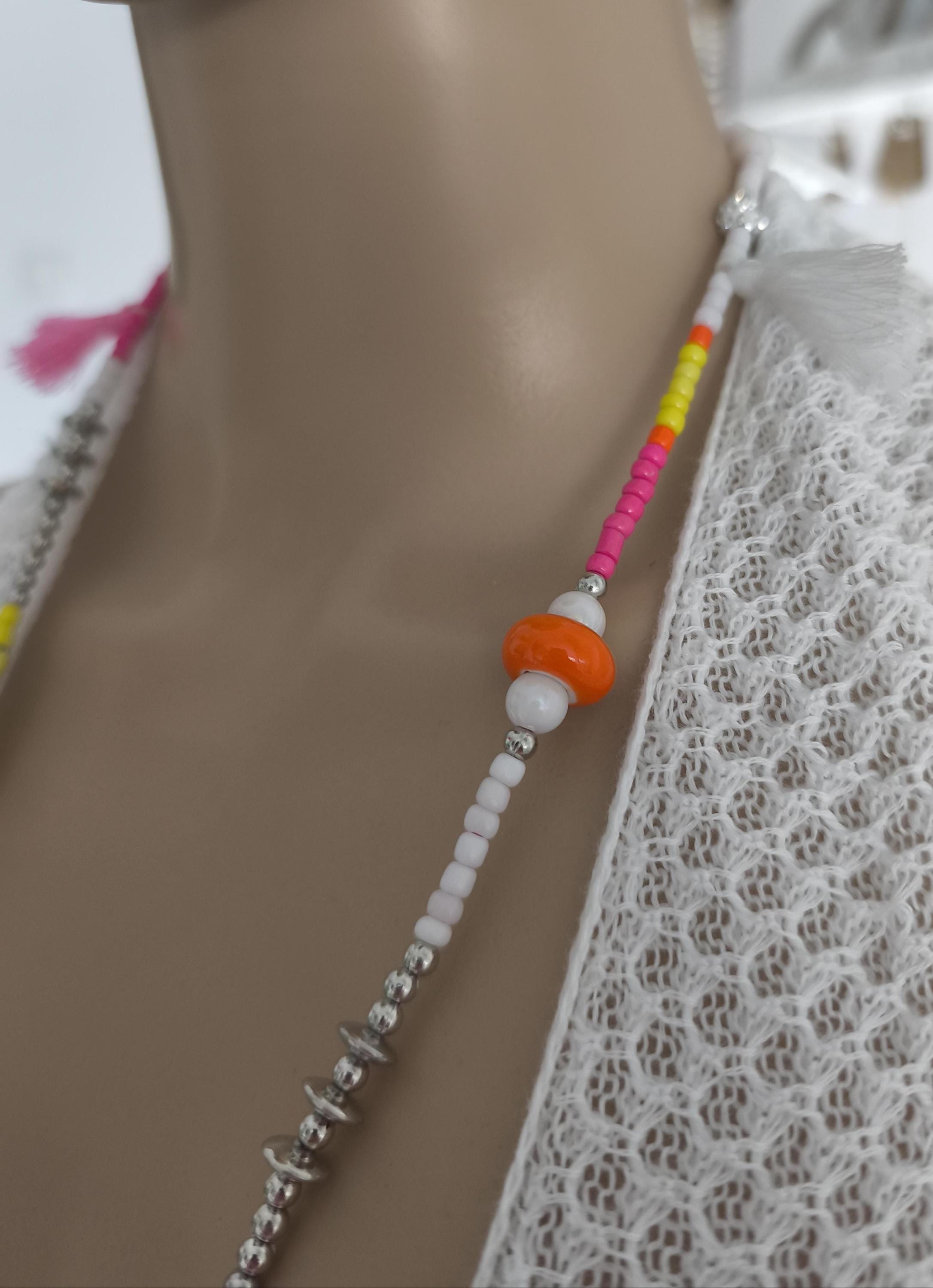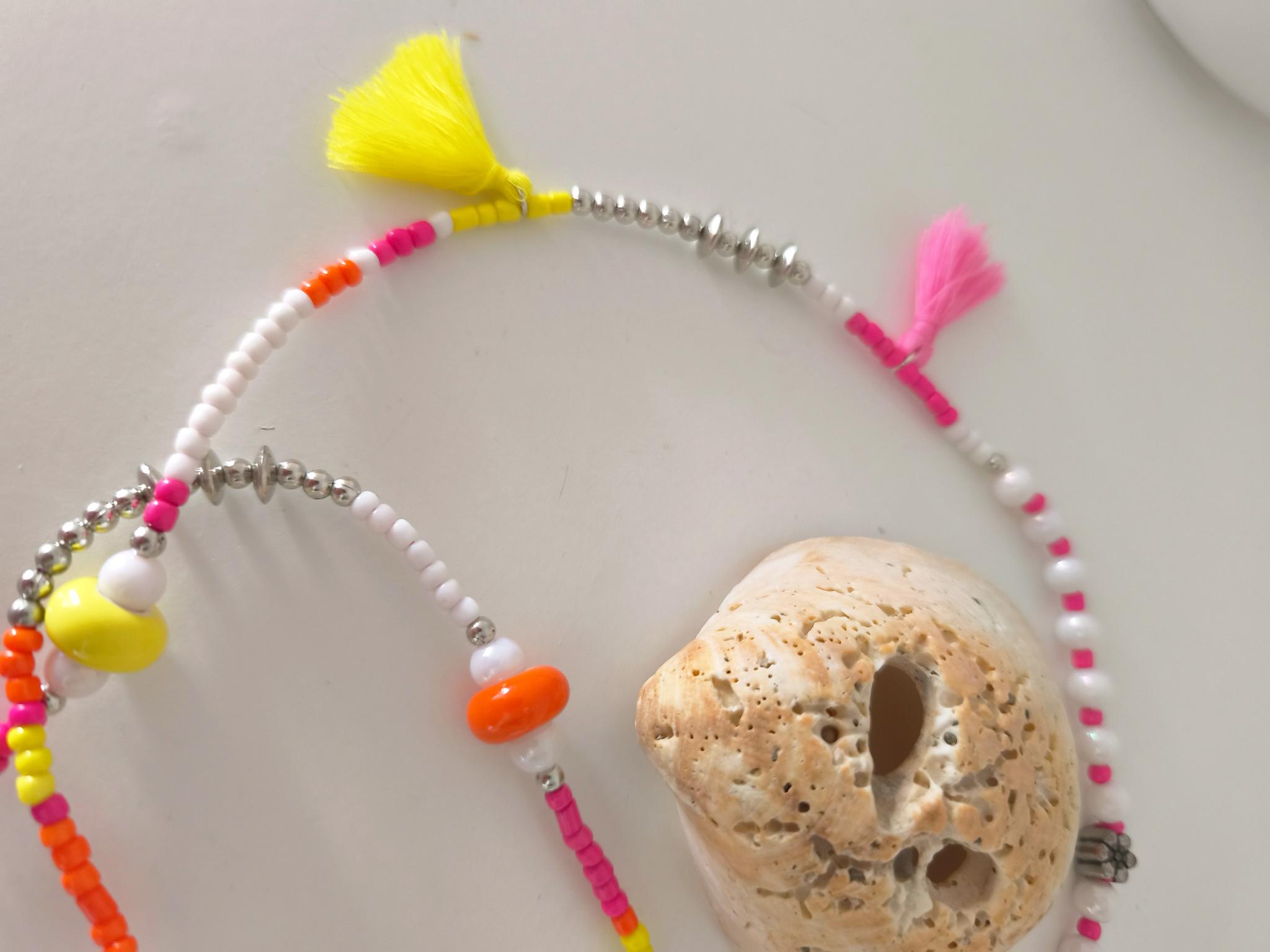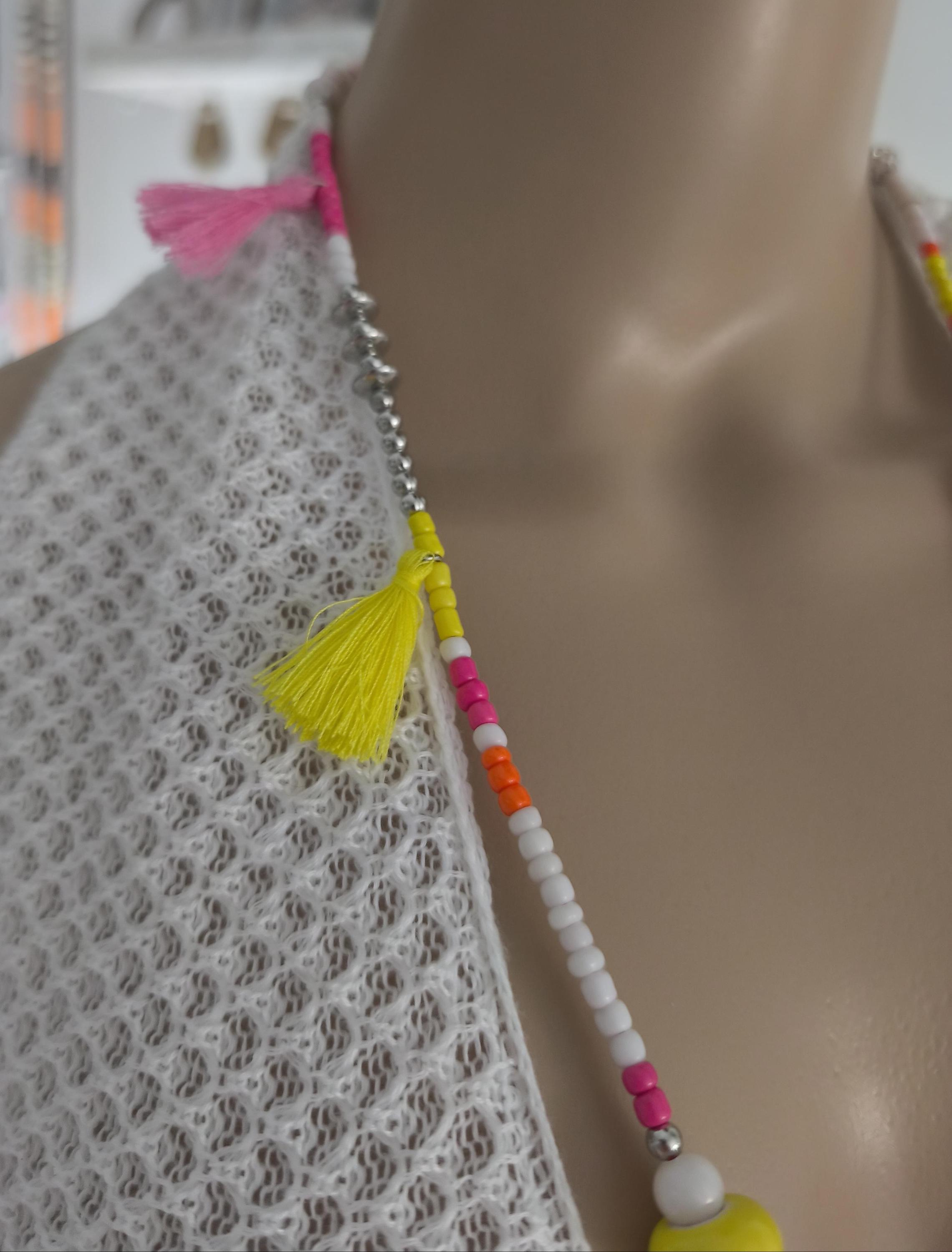 Beautiful boho necklace made of a mix of pearls in white with neon colors, such as pink, yellow, and orange.