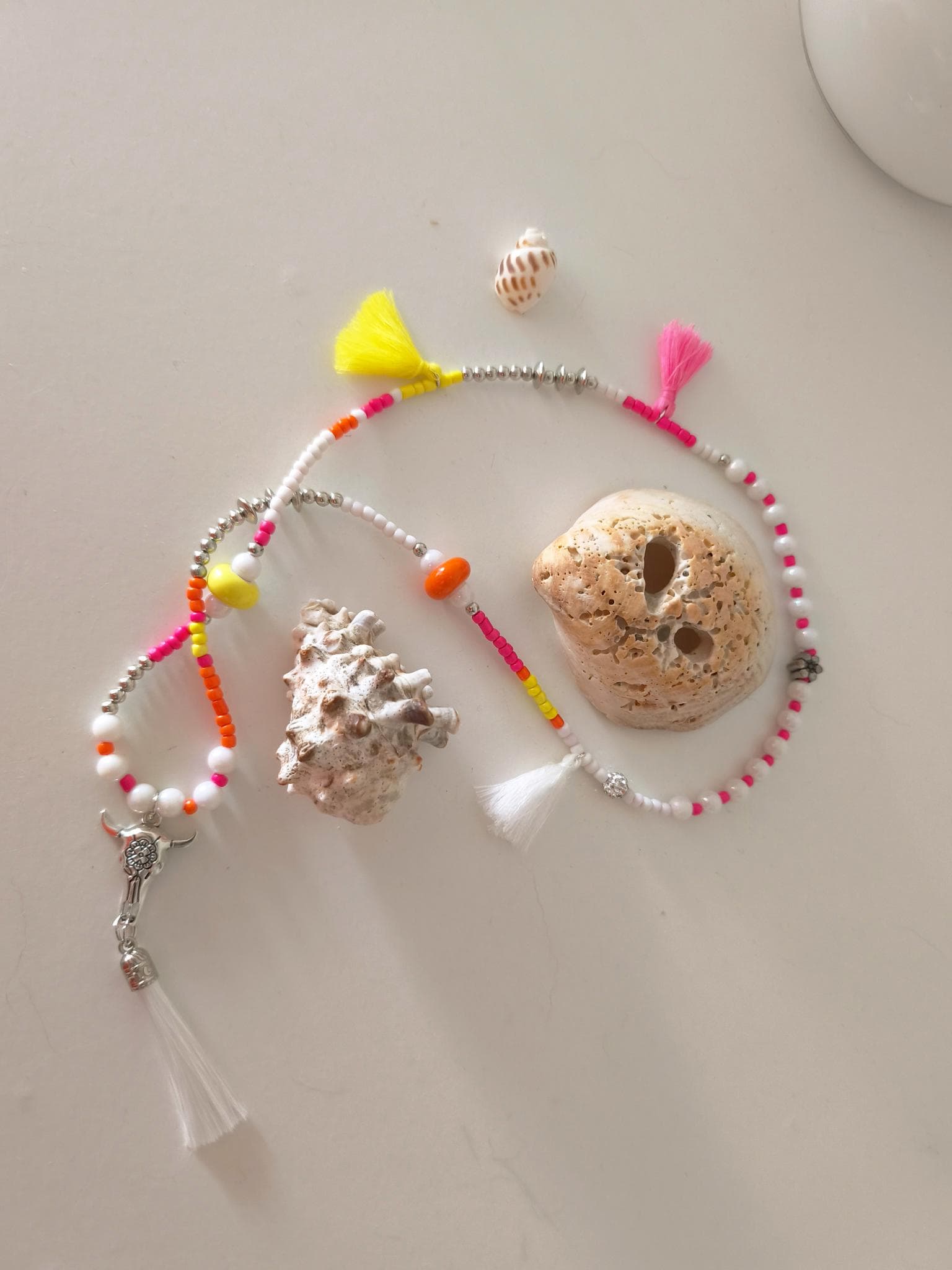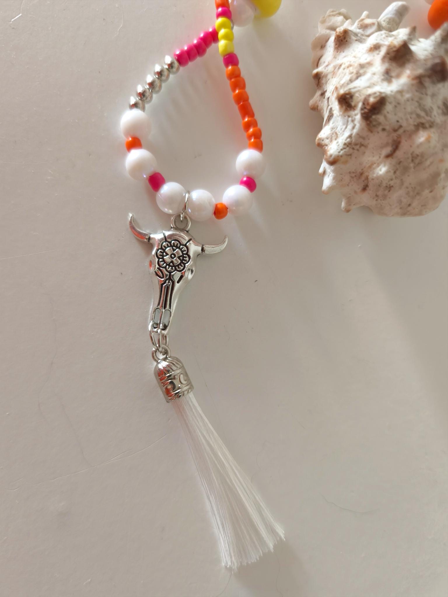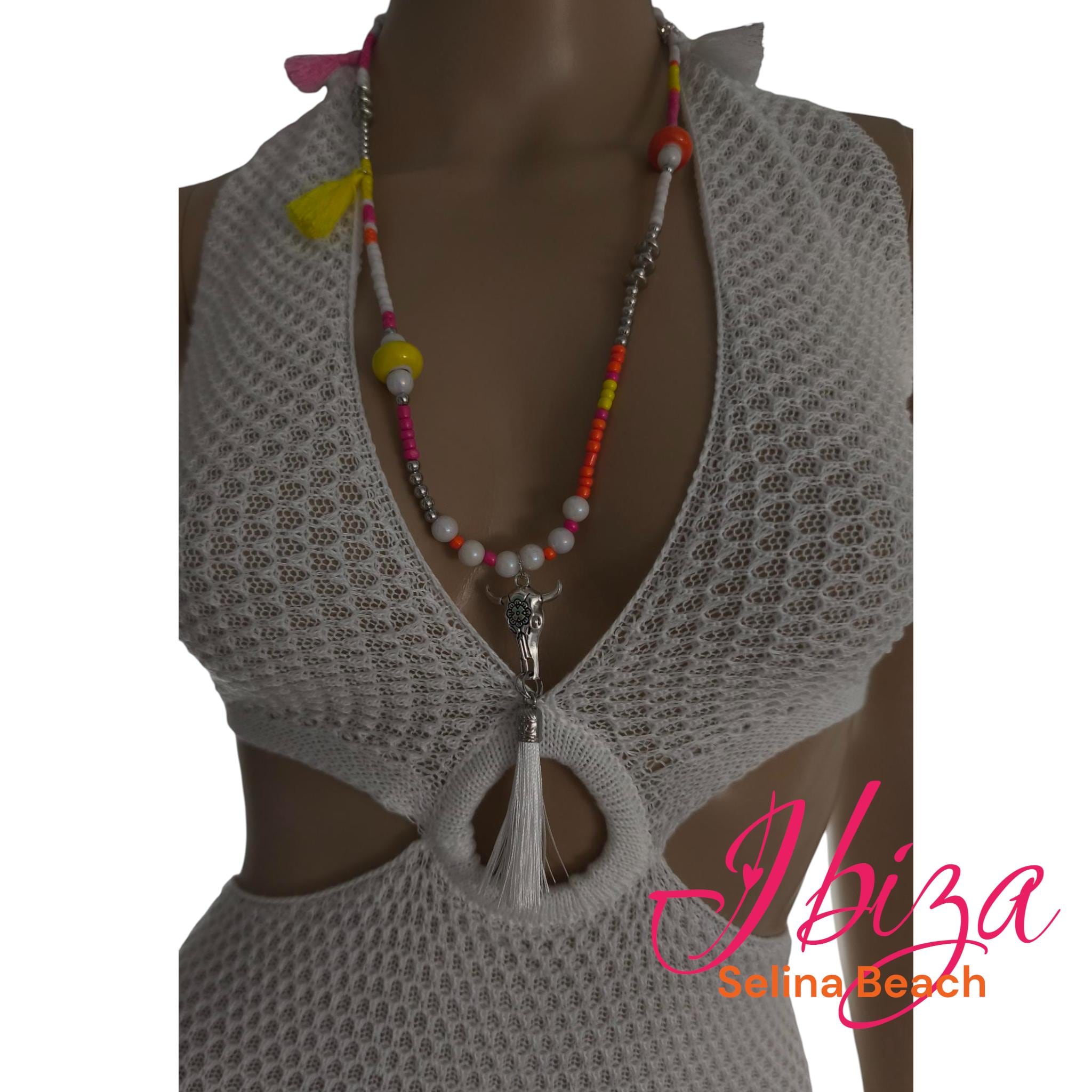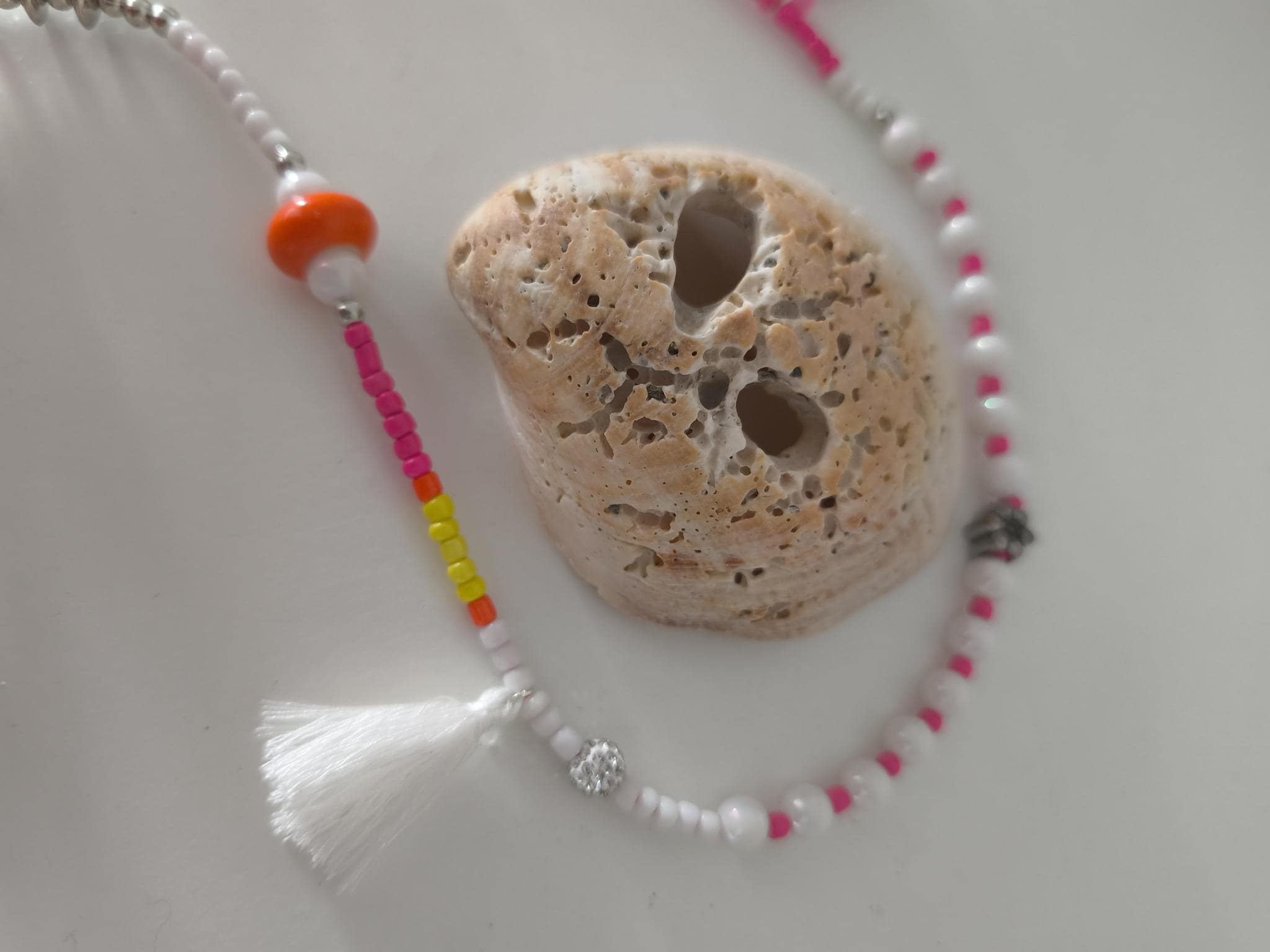Beautiful boho necklace made of a mix of pearls in white with neon colors, such as pink, yellow, and orange.