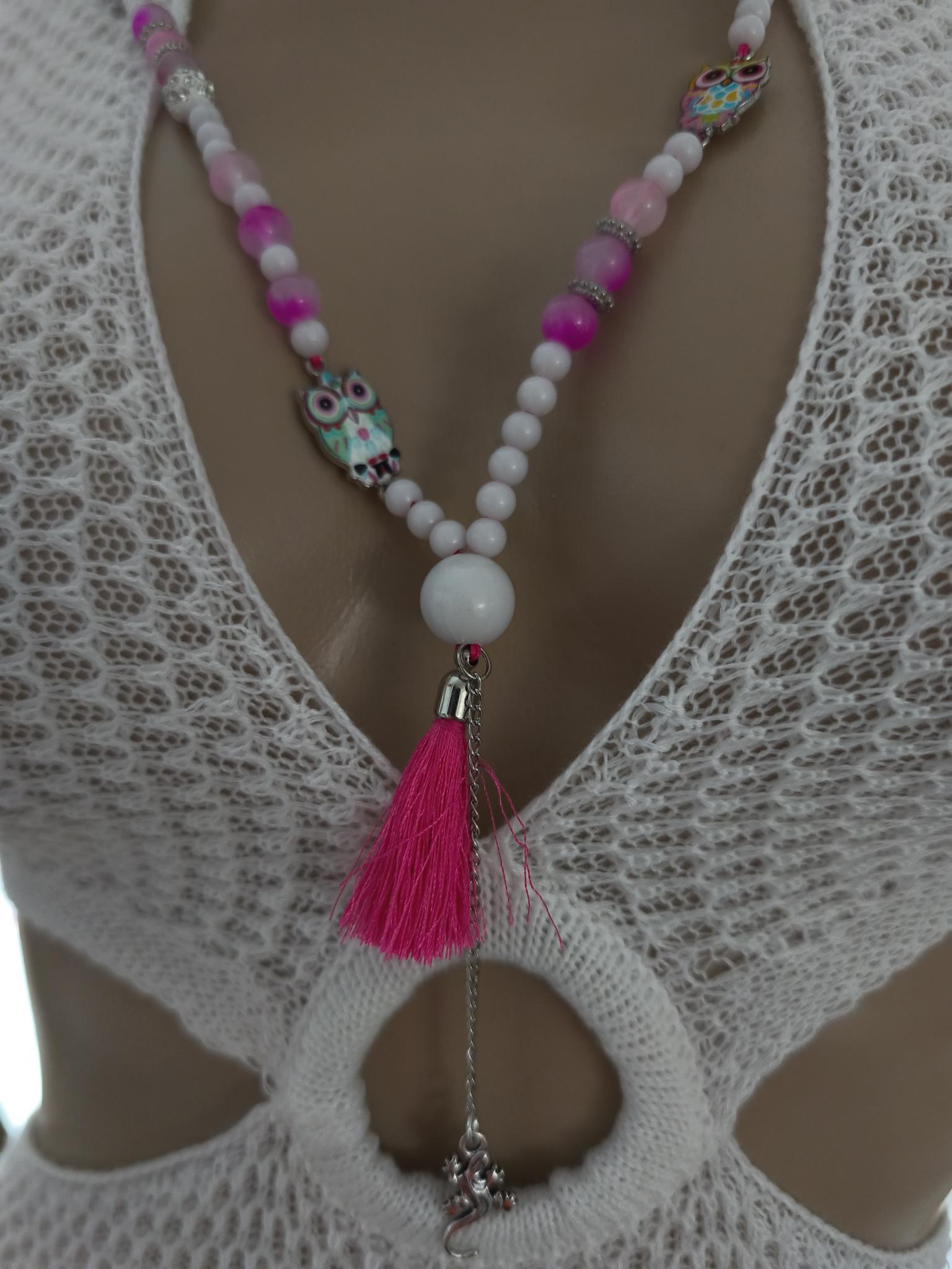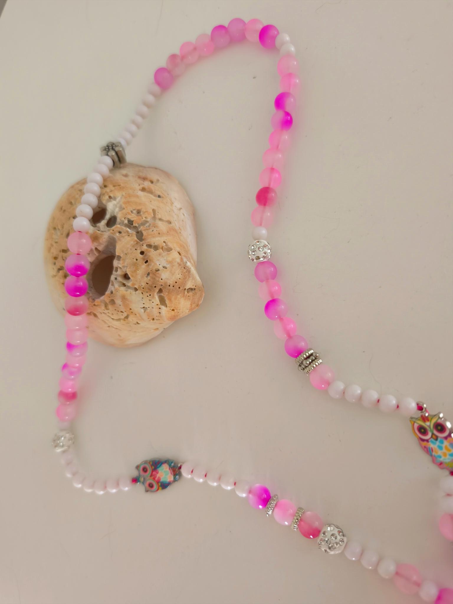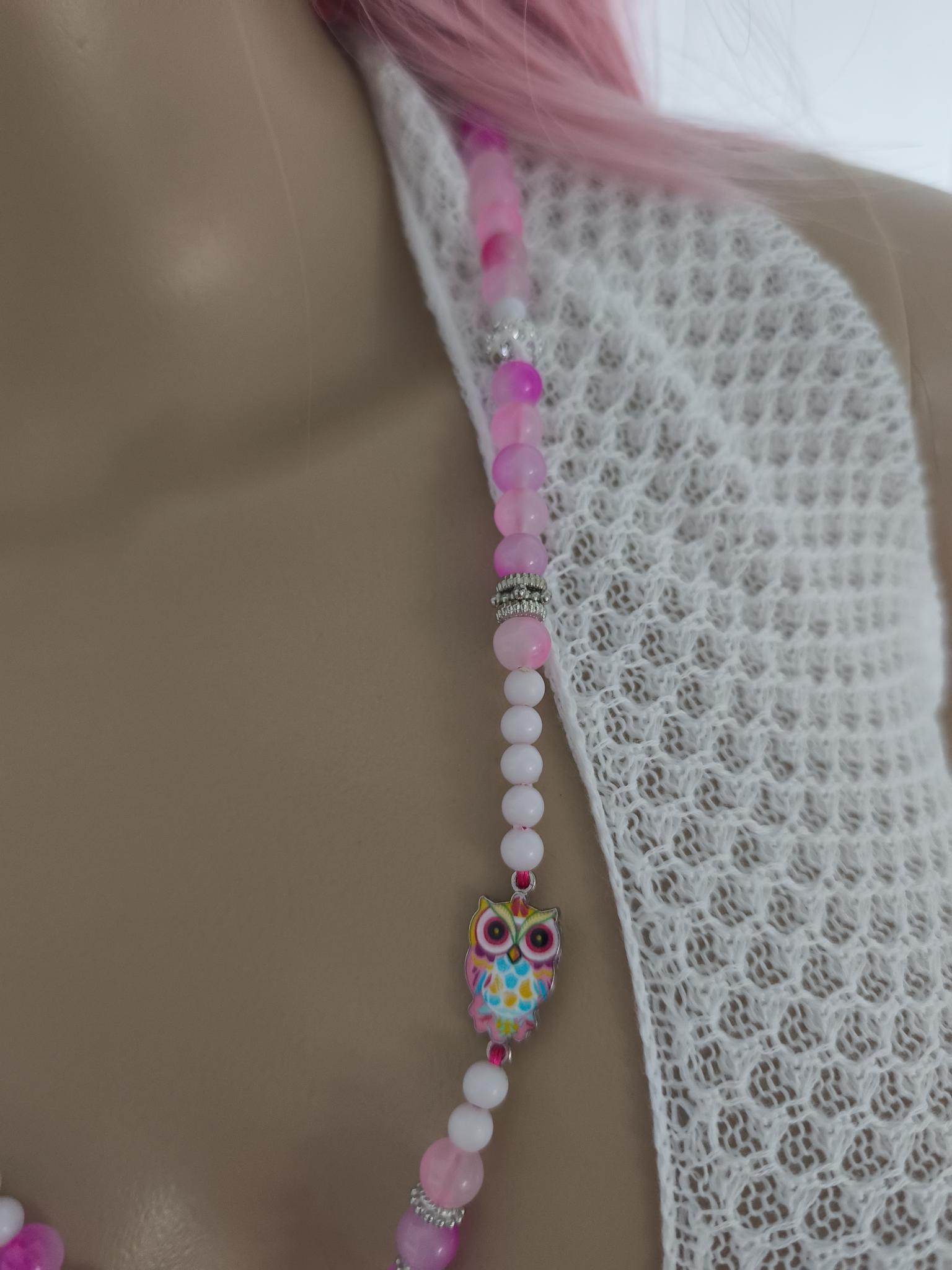 Beautiful boho necklace made of glass and acrylic beads, white with pink, glittering balls, with cute colorful owls.