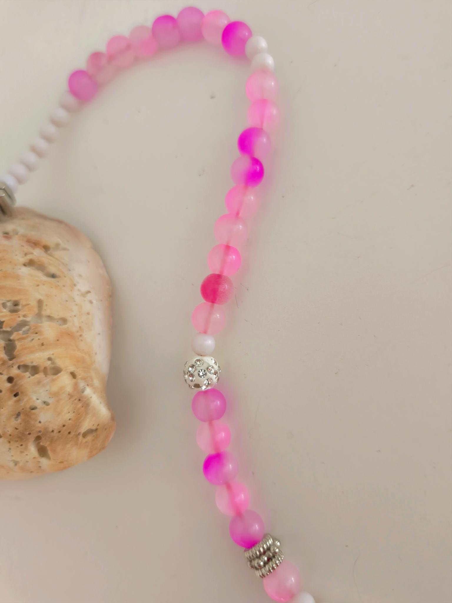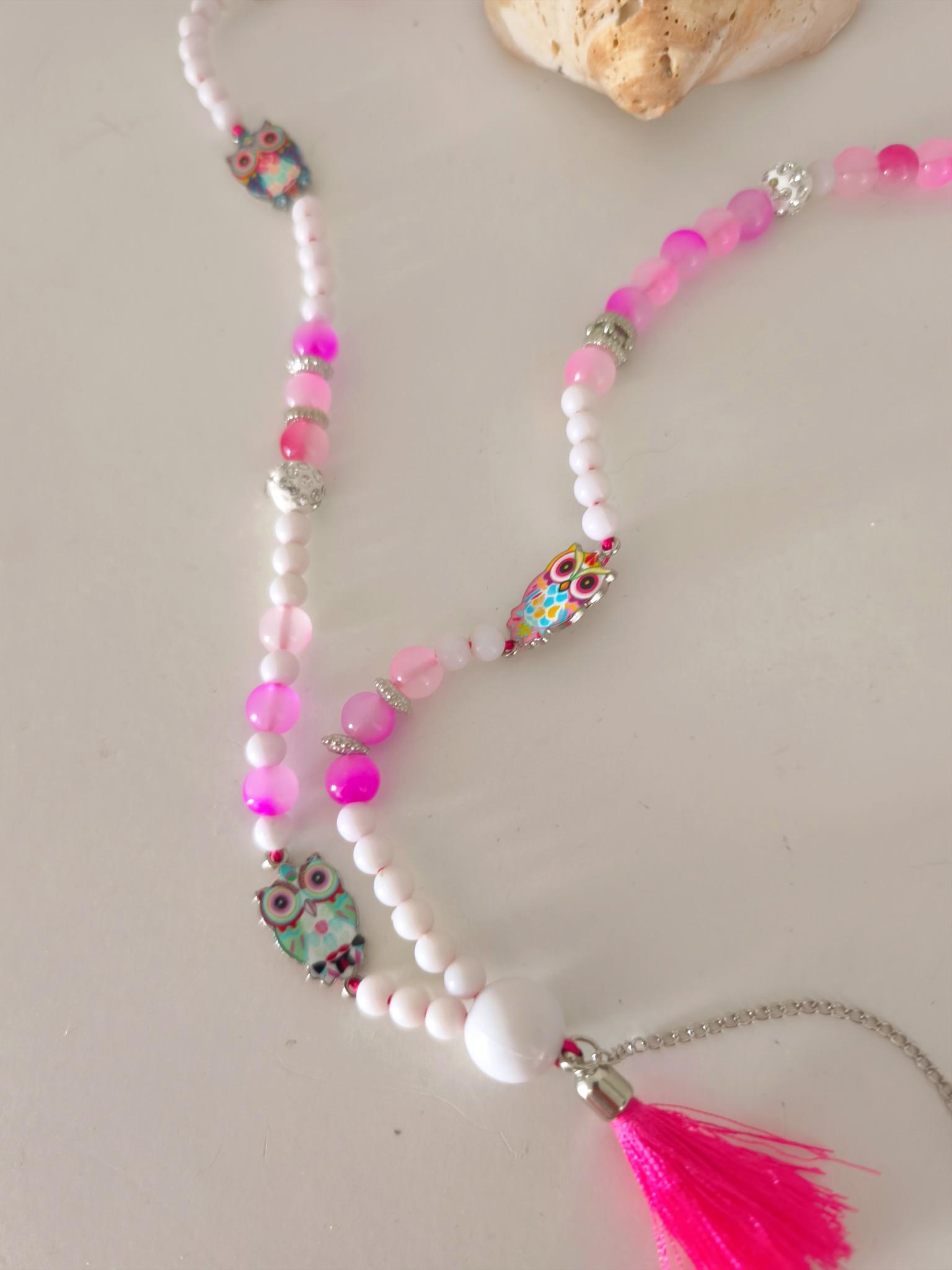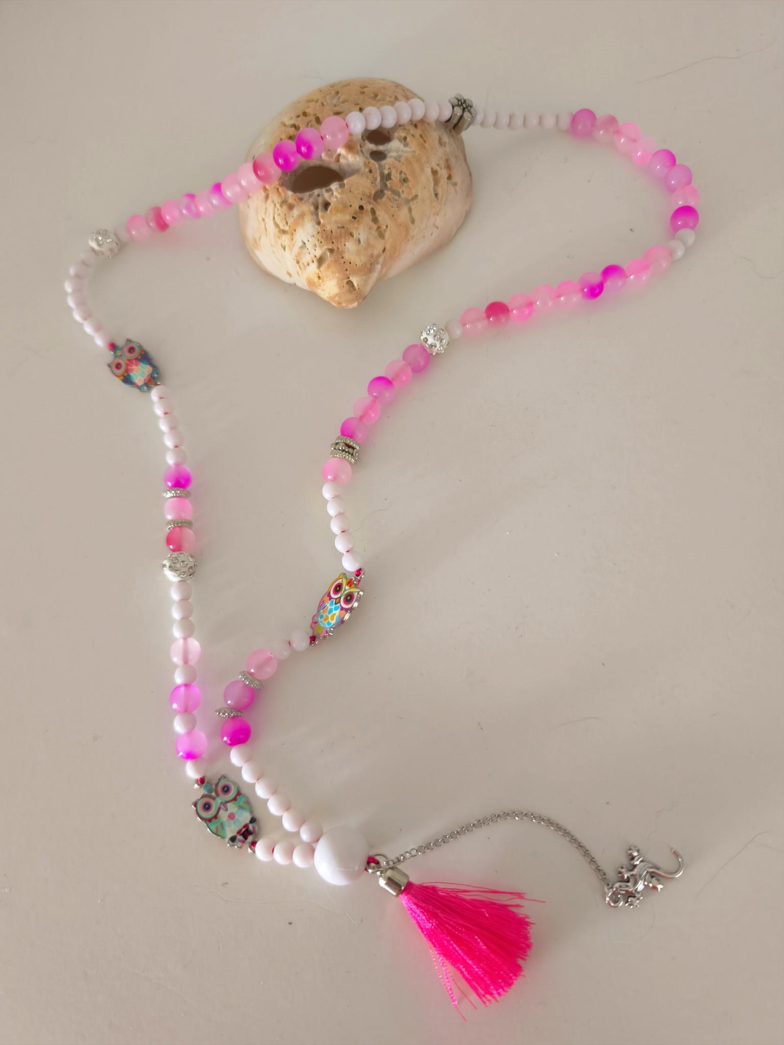 Beautiful boho necklace made of glass and acrylic beads, white with pink, glittering balls, with cute colorful owls.