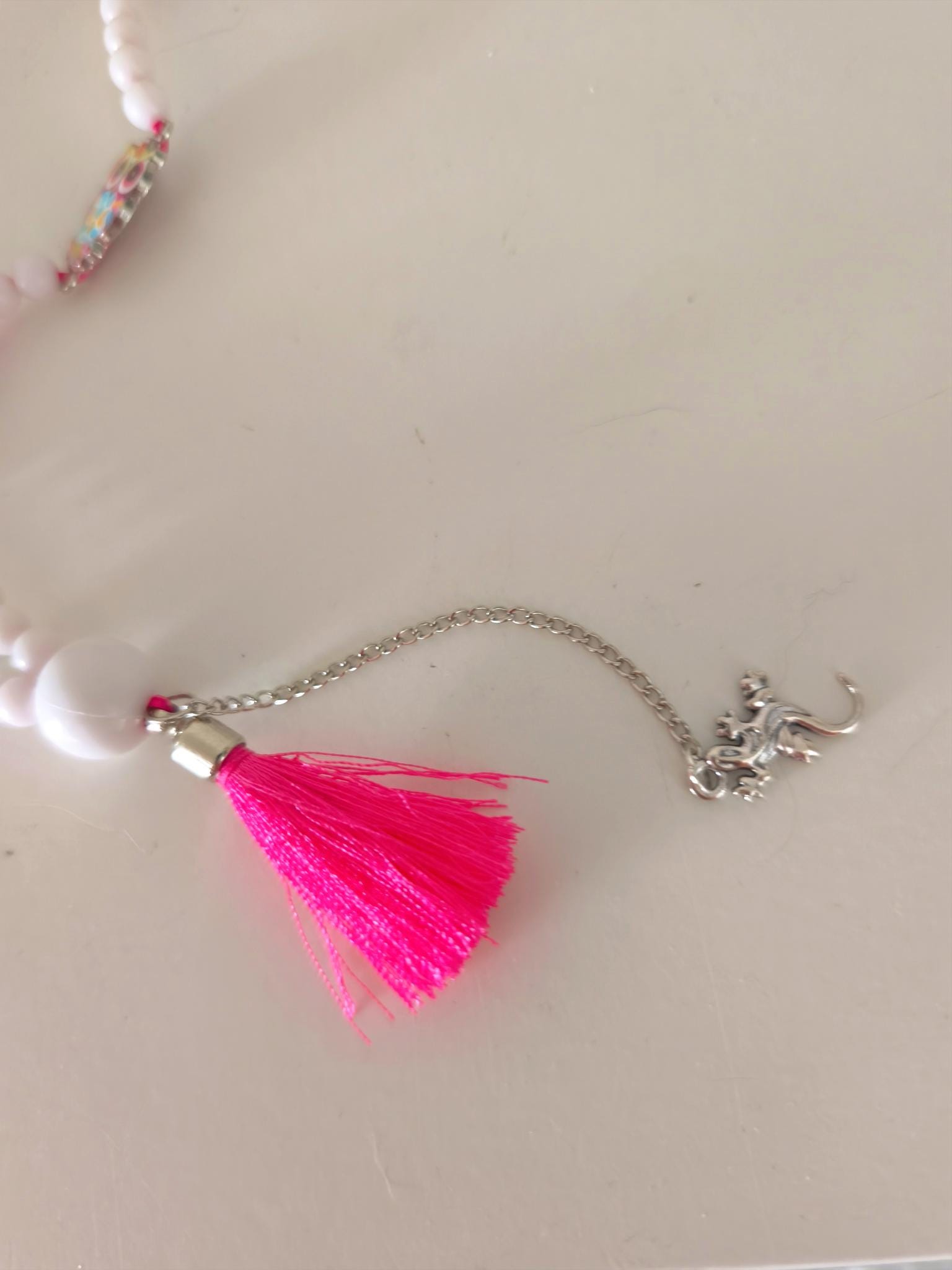 A pink tassel/pom-pom and a silver gecko on a chain serve as pendant accessories.