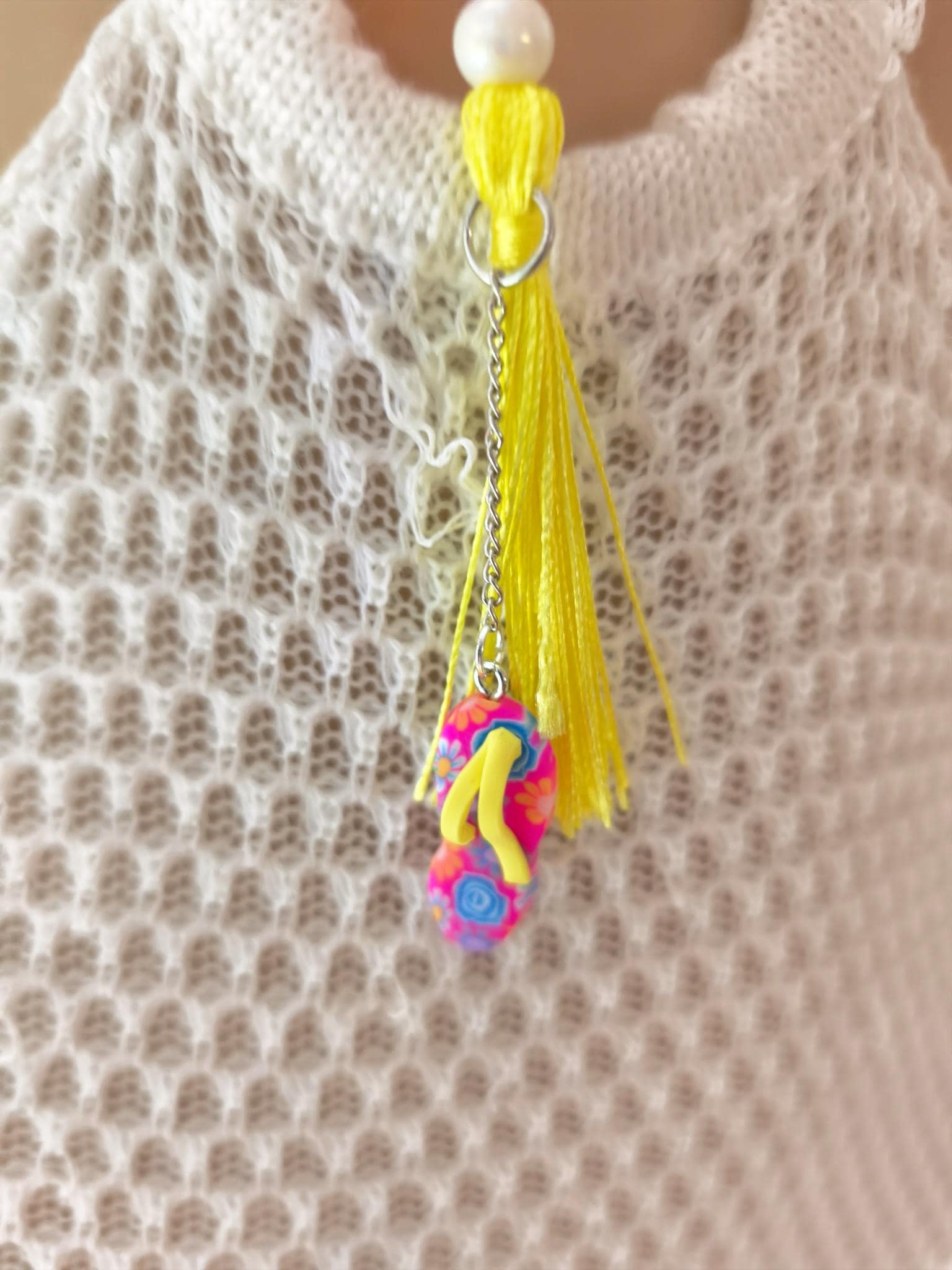 A yellow tassel/pom-pom with a cute flip-flop on a small silver chain serves as a pendant accessory.