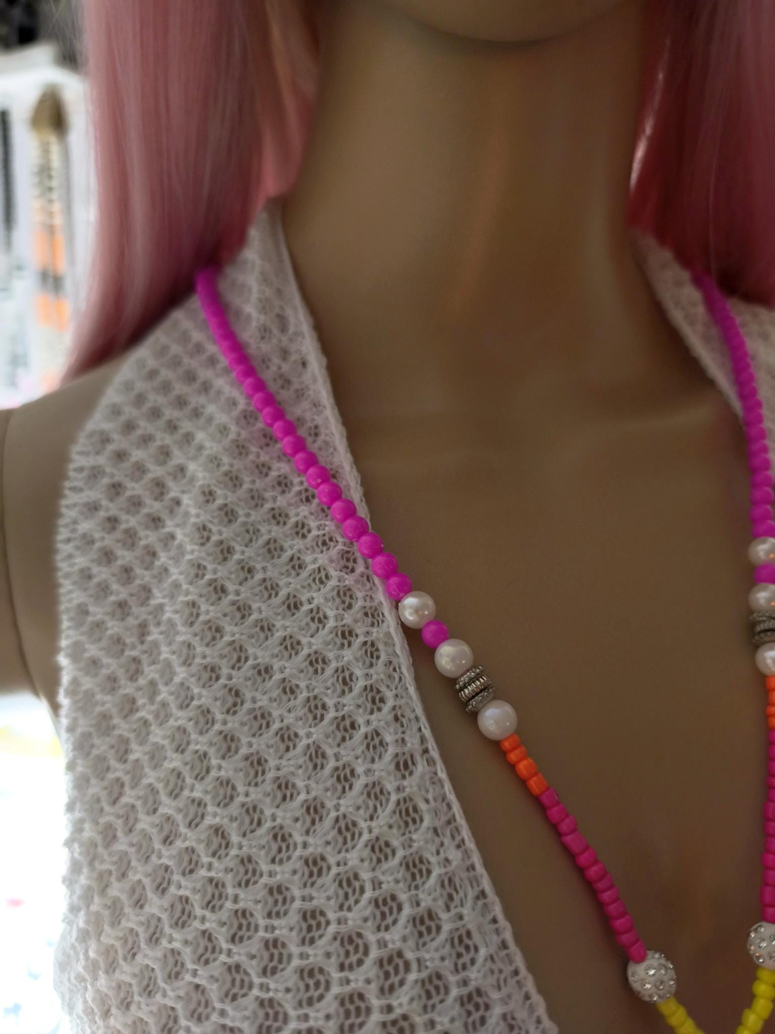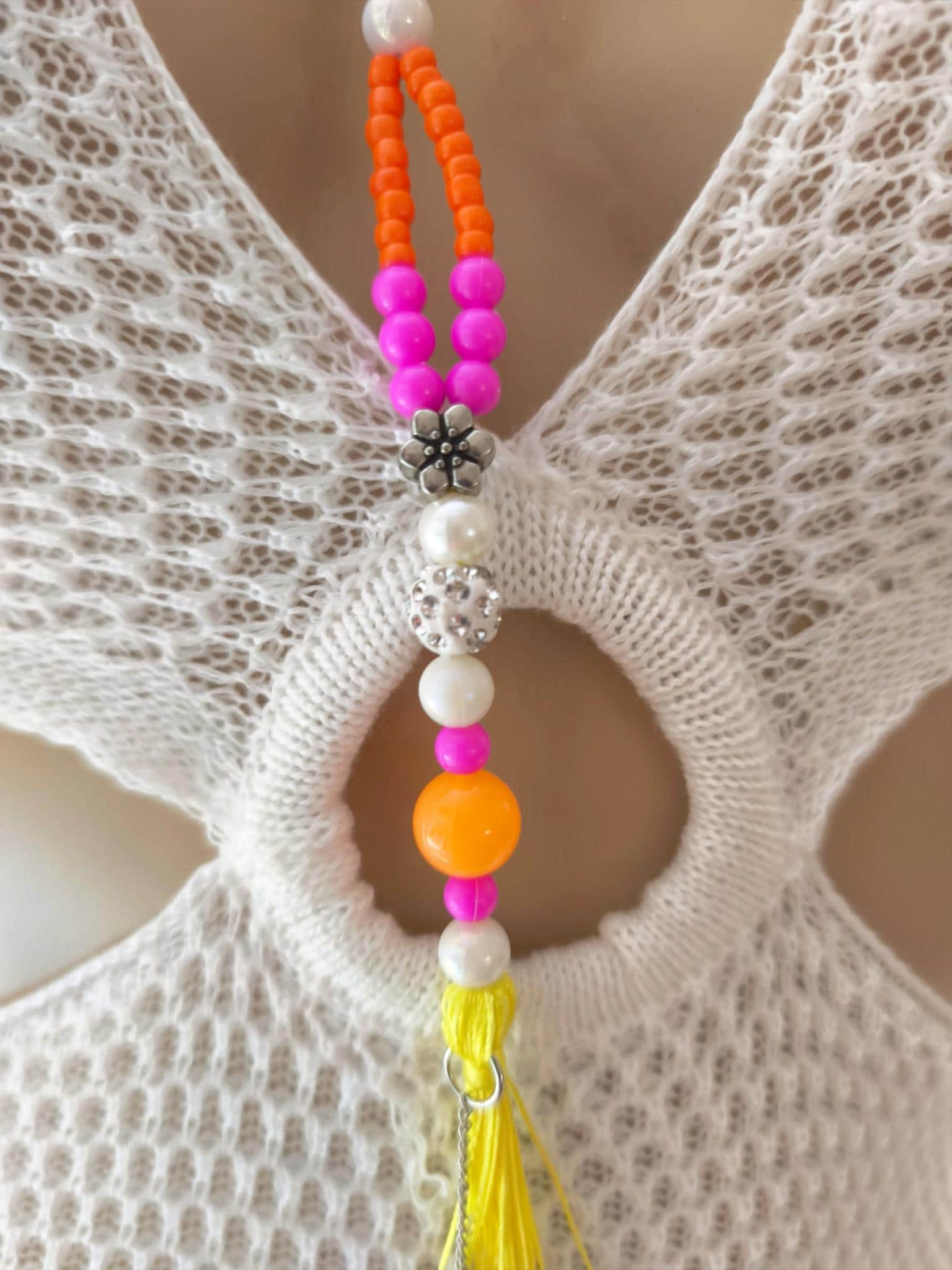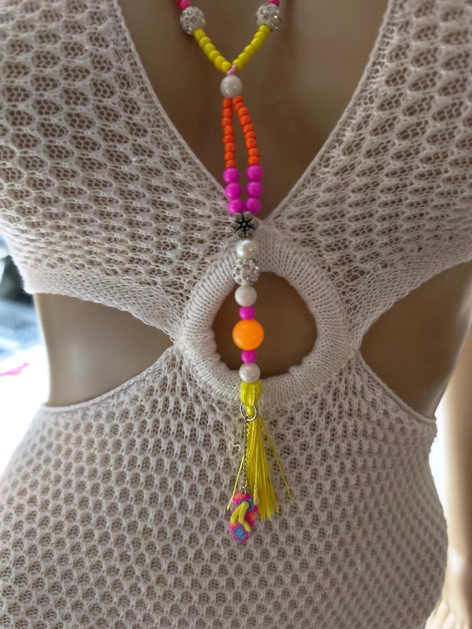 This beautiful Ibiza Boho necklace made of acrylic beads mixed with neon colors, such as pink, yellow, orange and white, is once again an absolute one-of-a-kind piece.