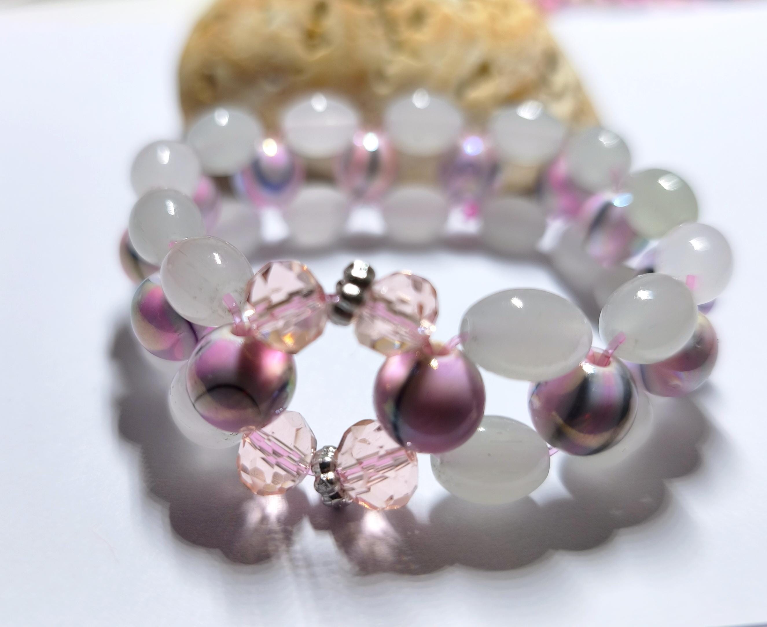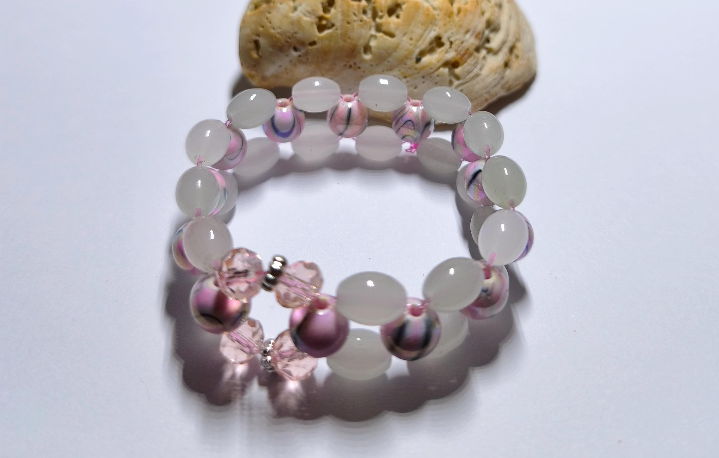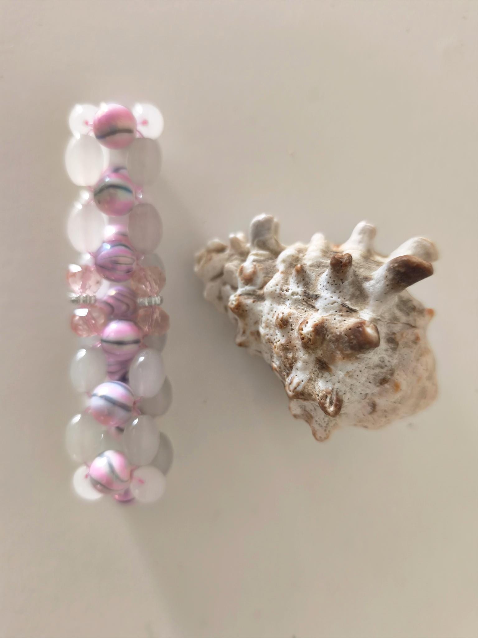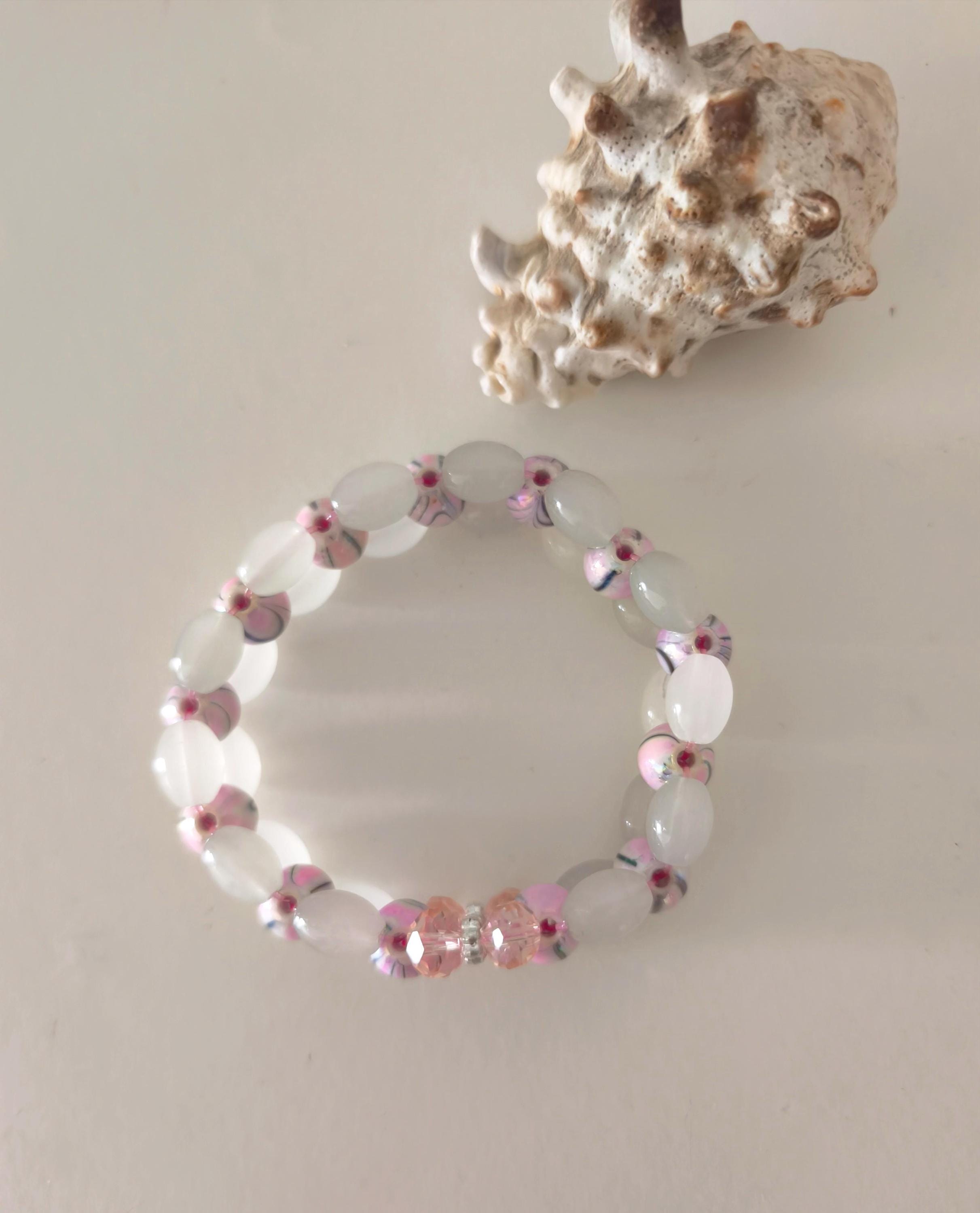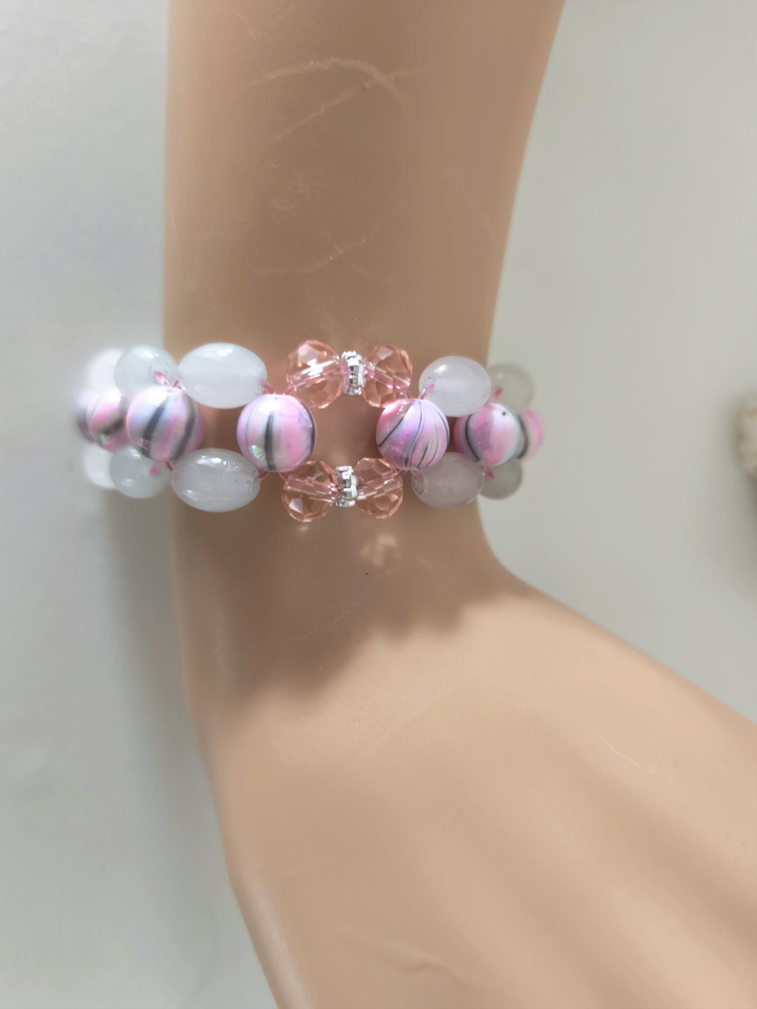 Pretty boho beaded bracelet made of white and grey oval glass beads and pink marbled acrylic beads. Sturdy stretch band. Inner dimension approx. 19/20 cm.
