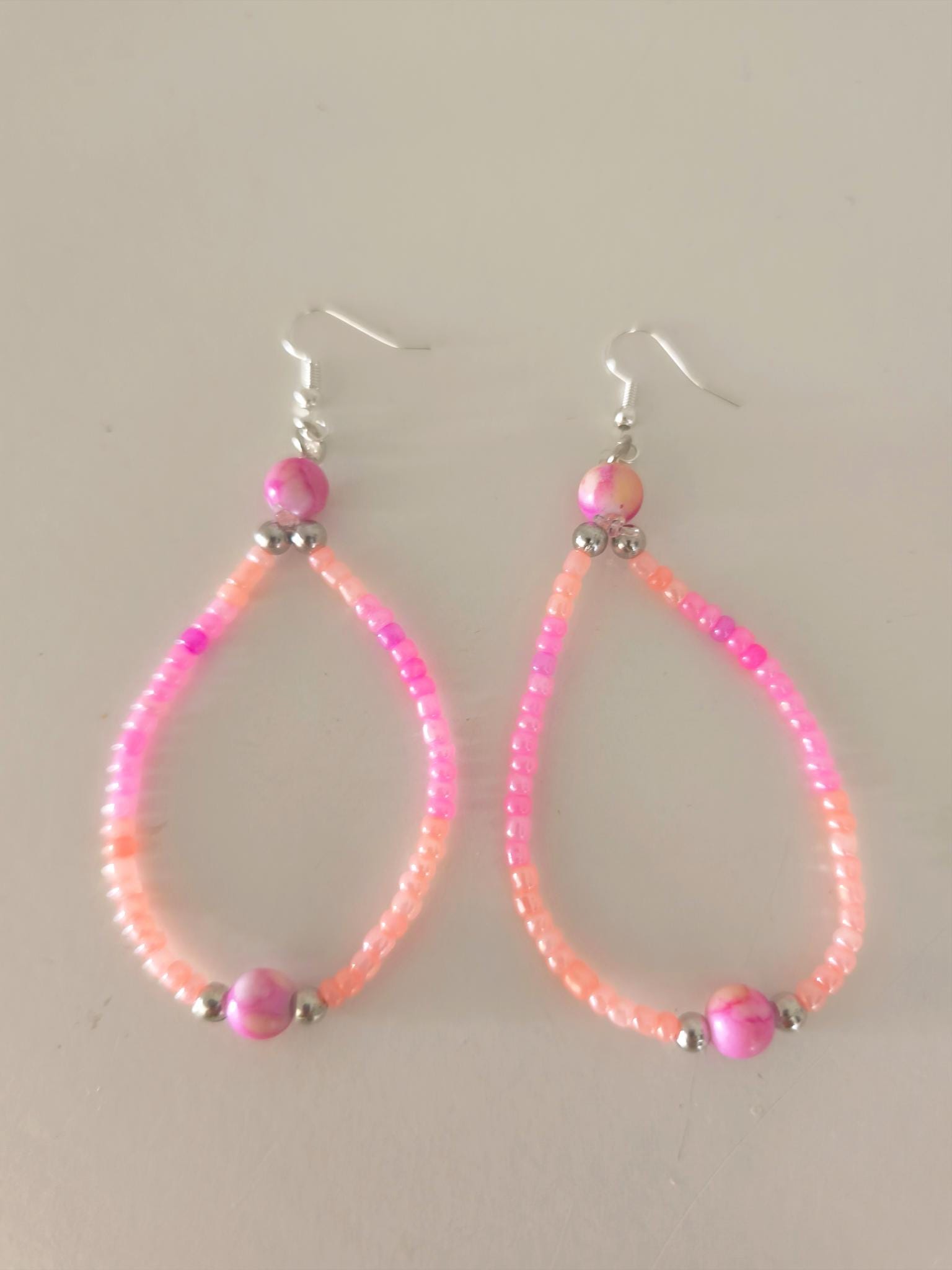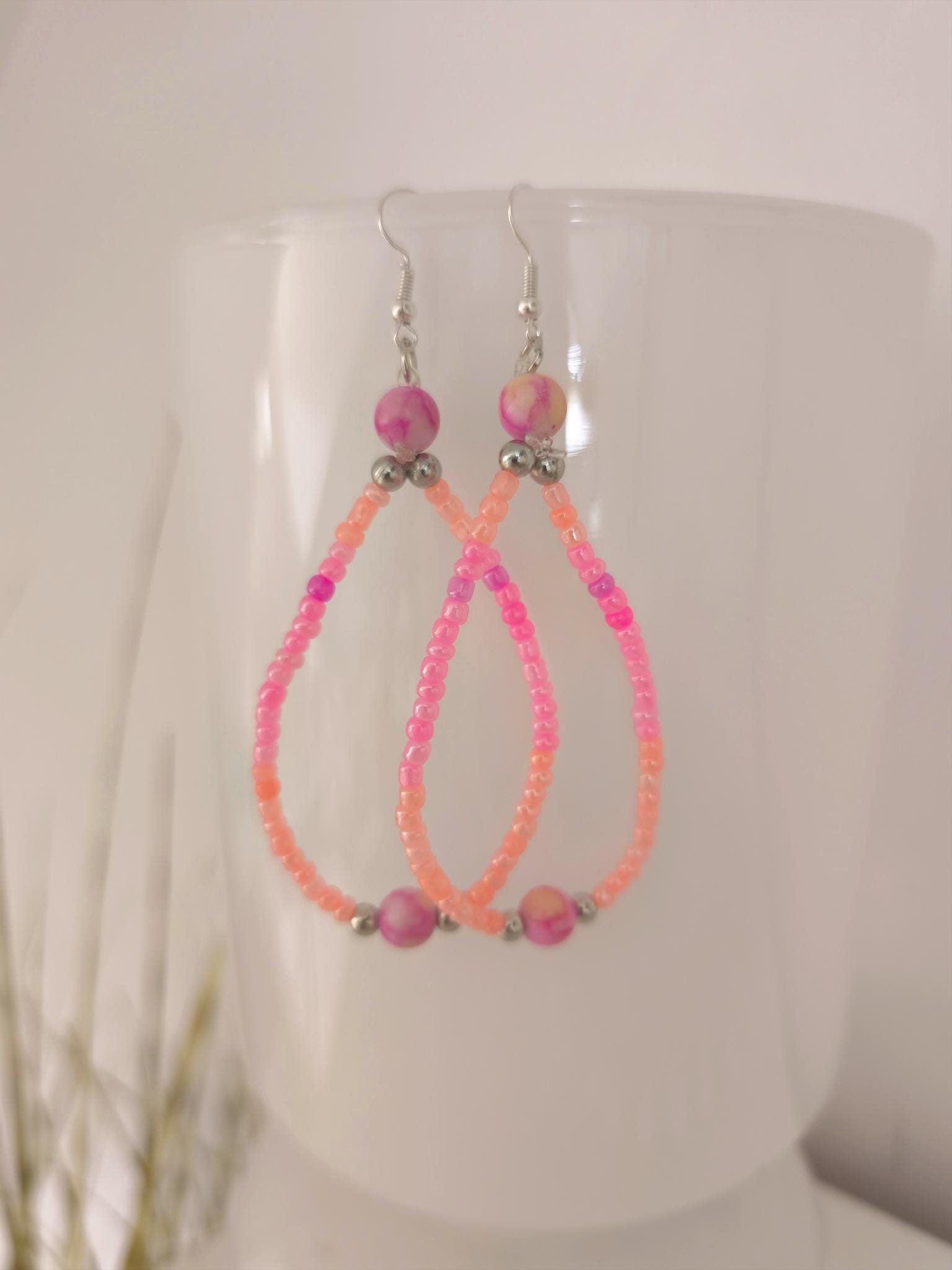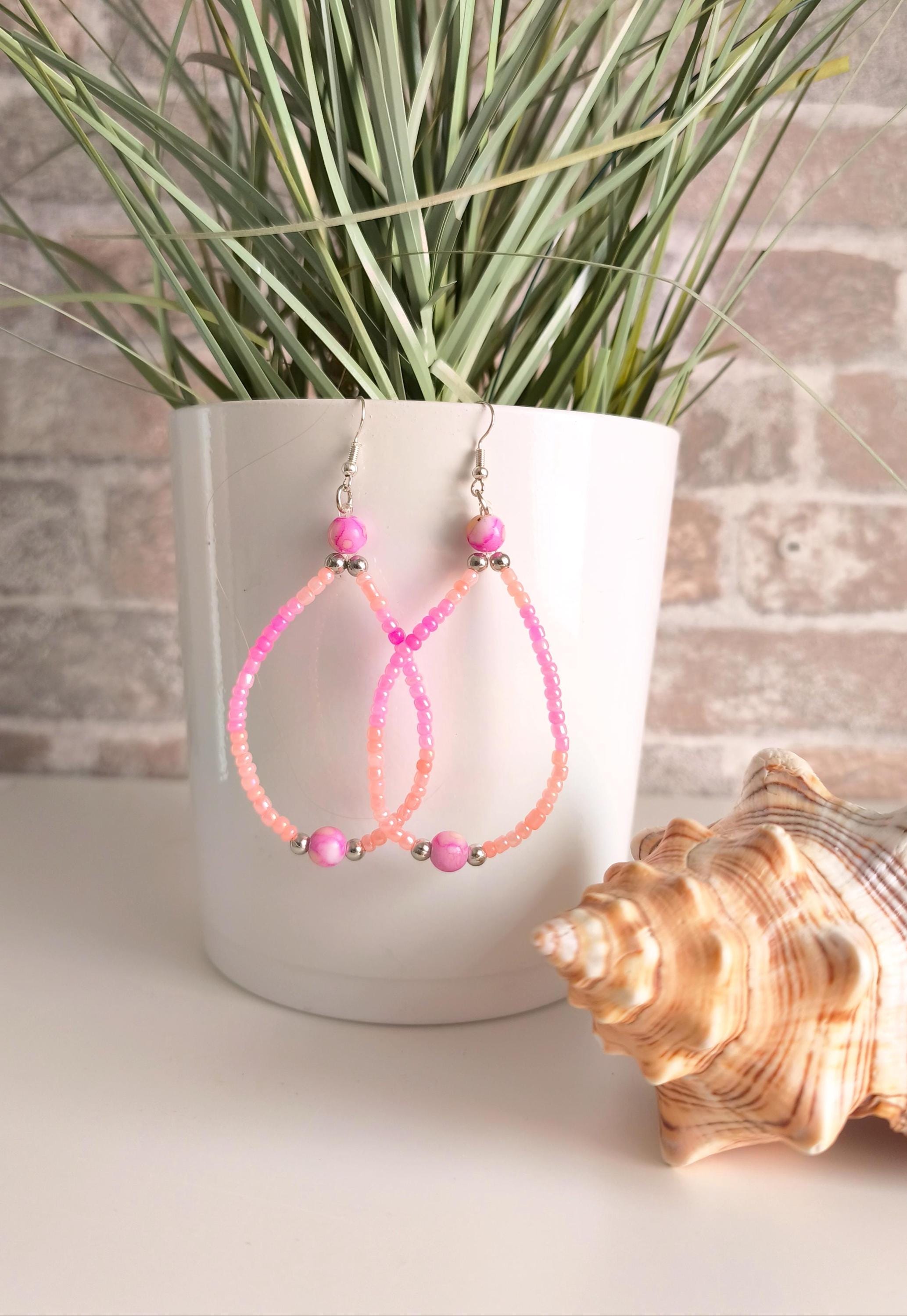 Pretty Ibiza boho pearl earrings with small silicone stoppers at the back to prevent loss. Summery pink/peach gradient color with silver accents. Fashion jewelry.
