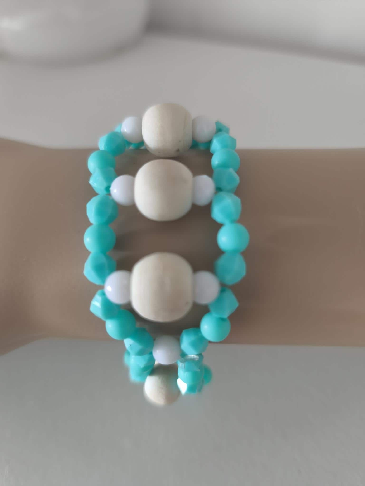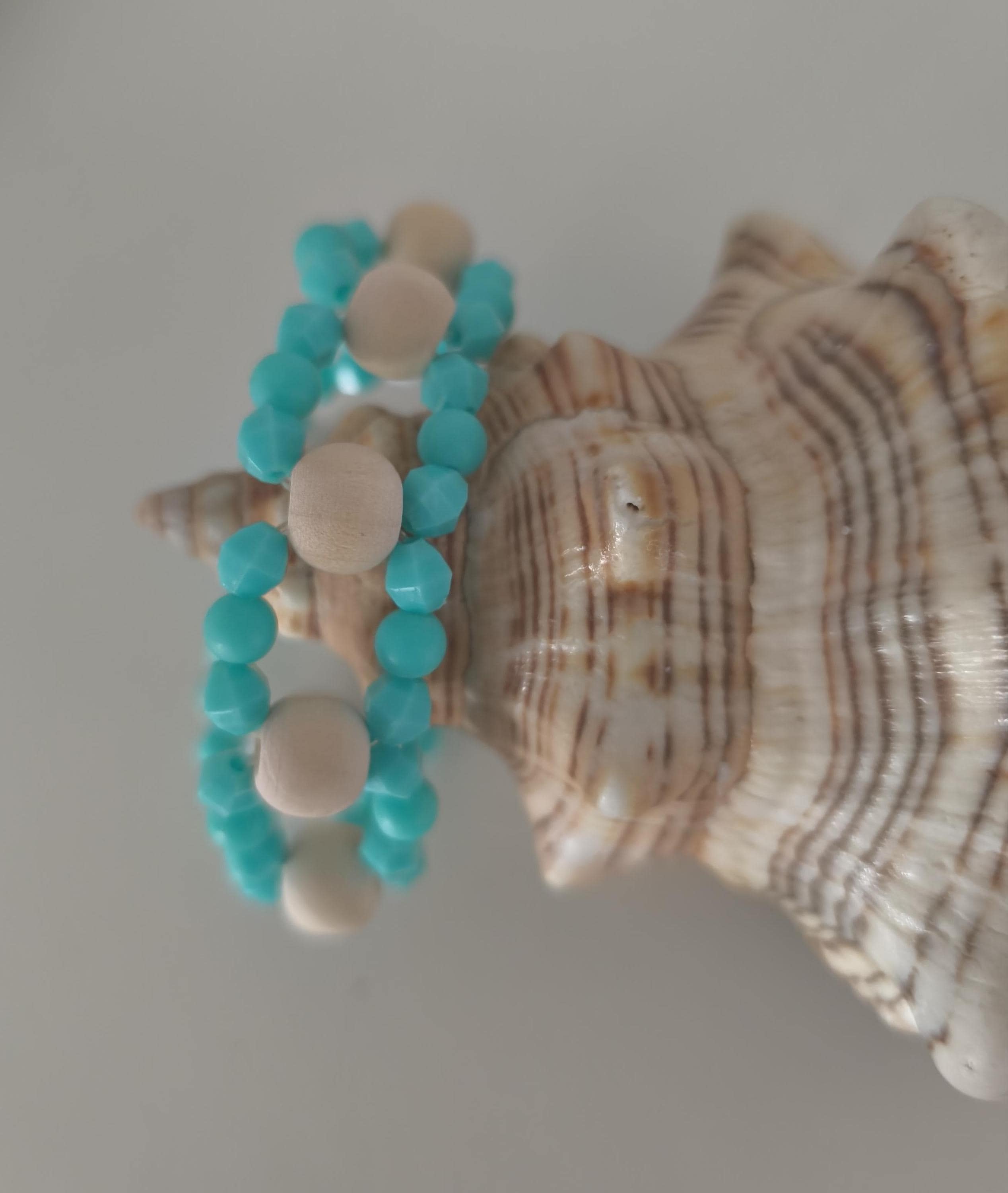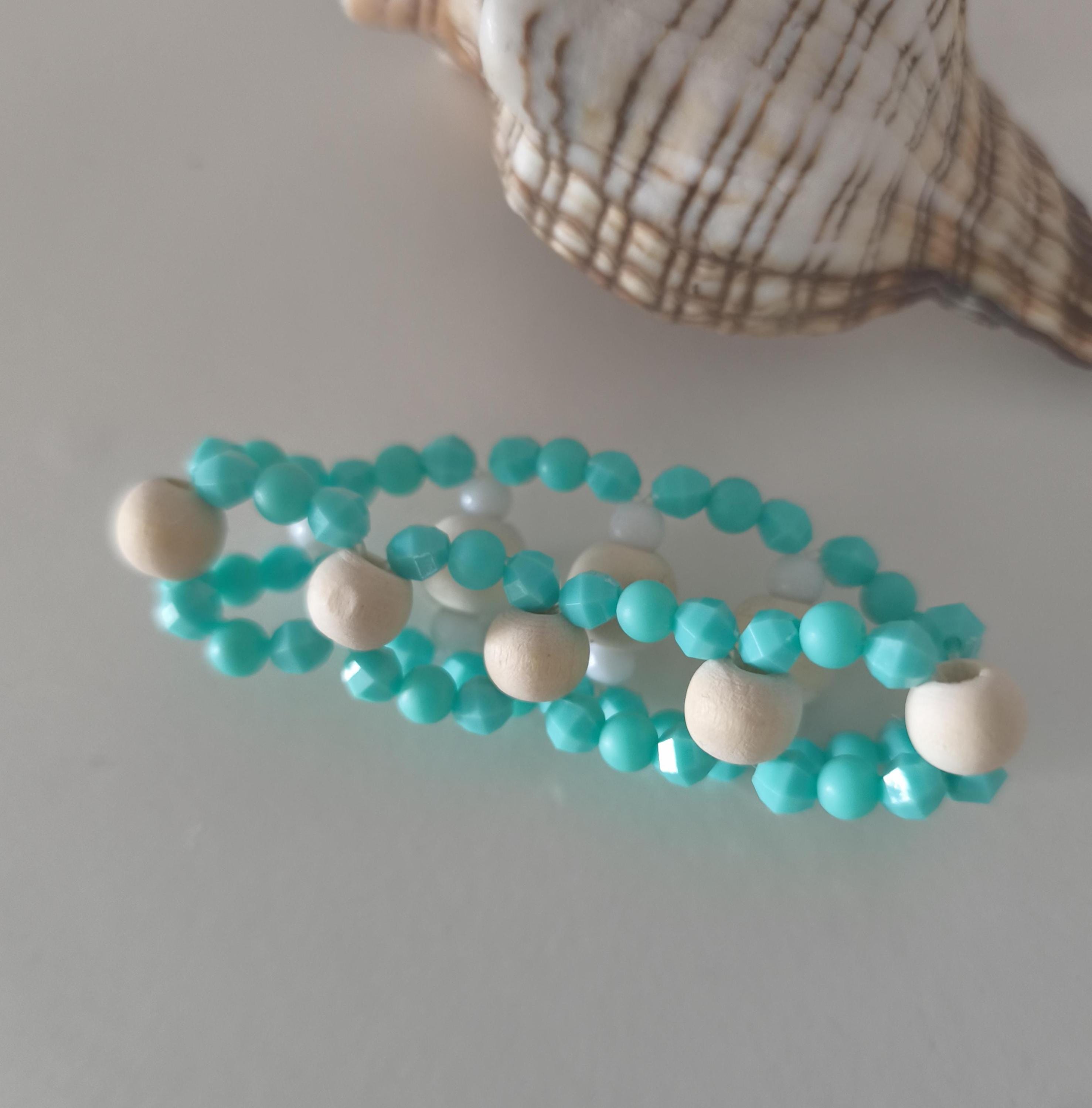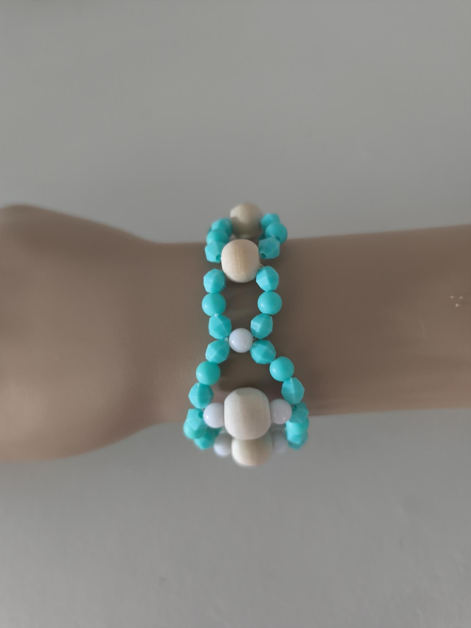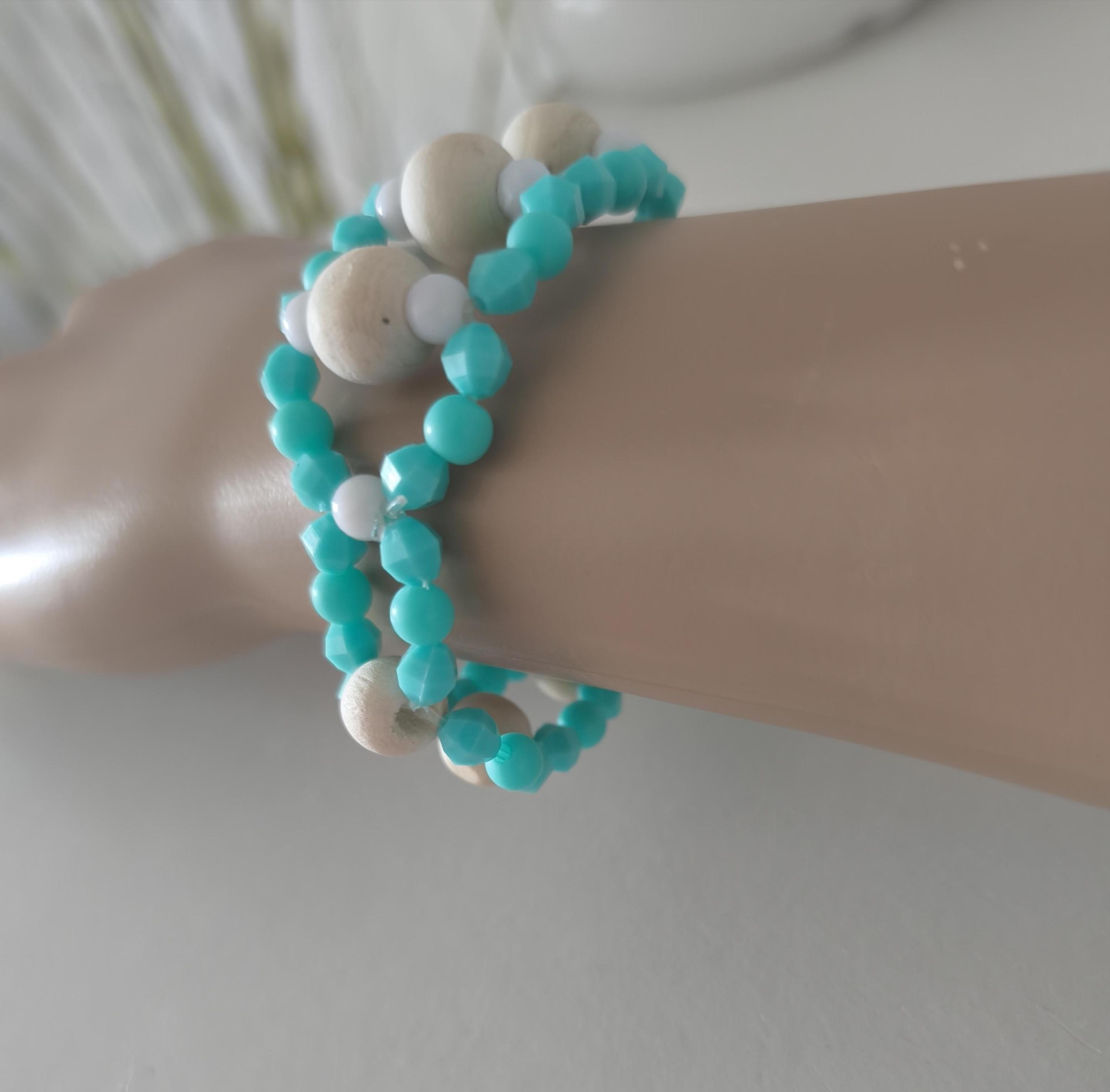 Pretty, fashionable Ibiza Boho beaded bracelet made of lightweight acrylic and wooden beads in summery turquoise/white combined with wood.