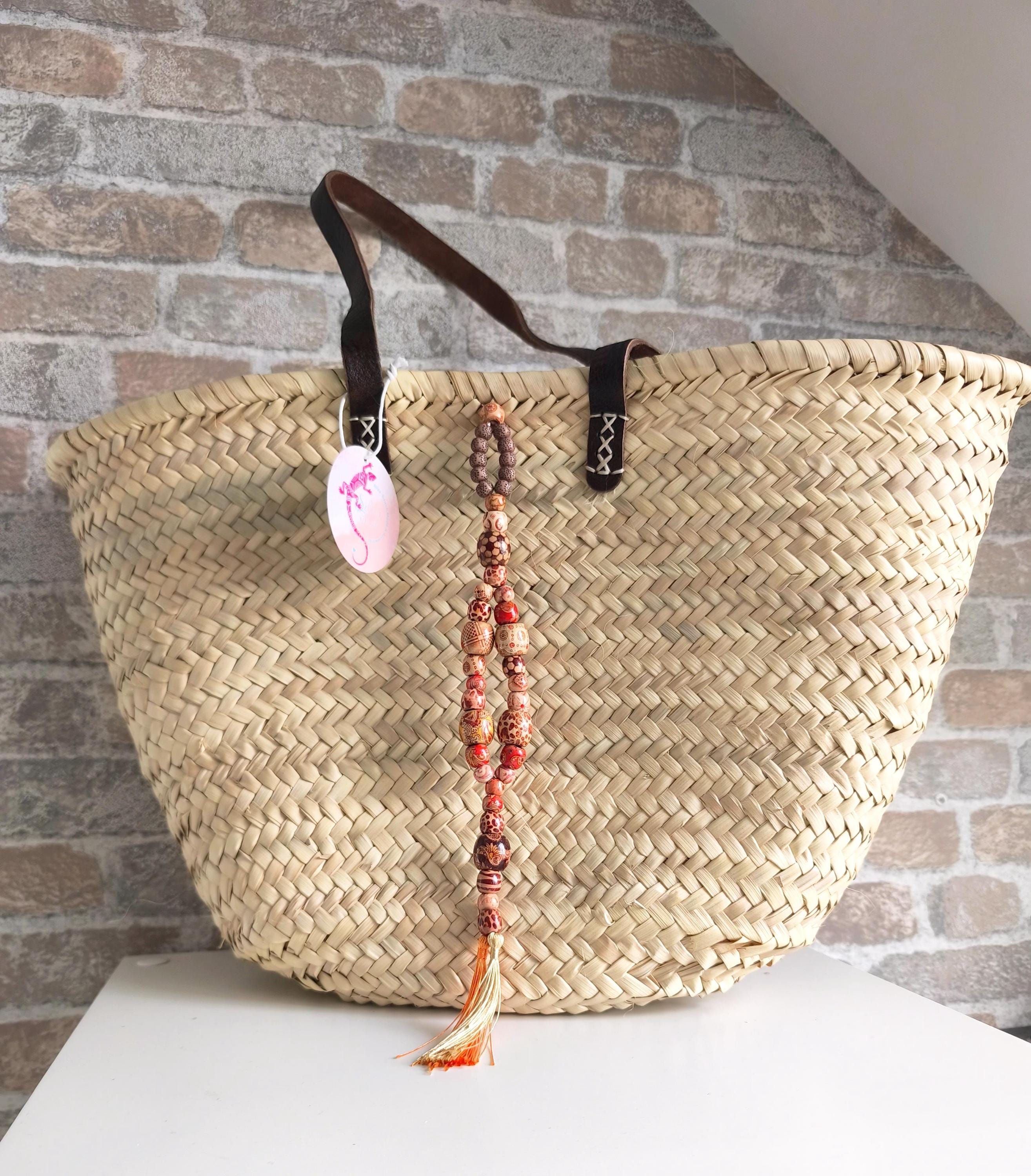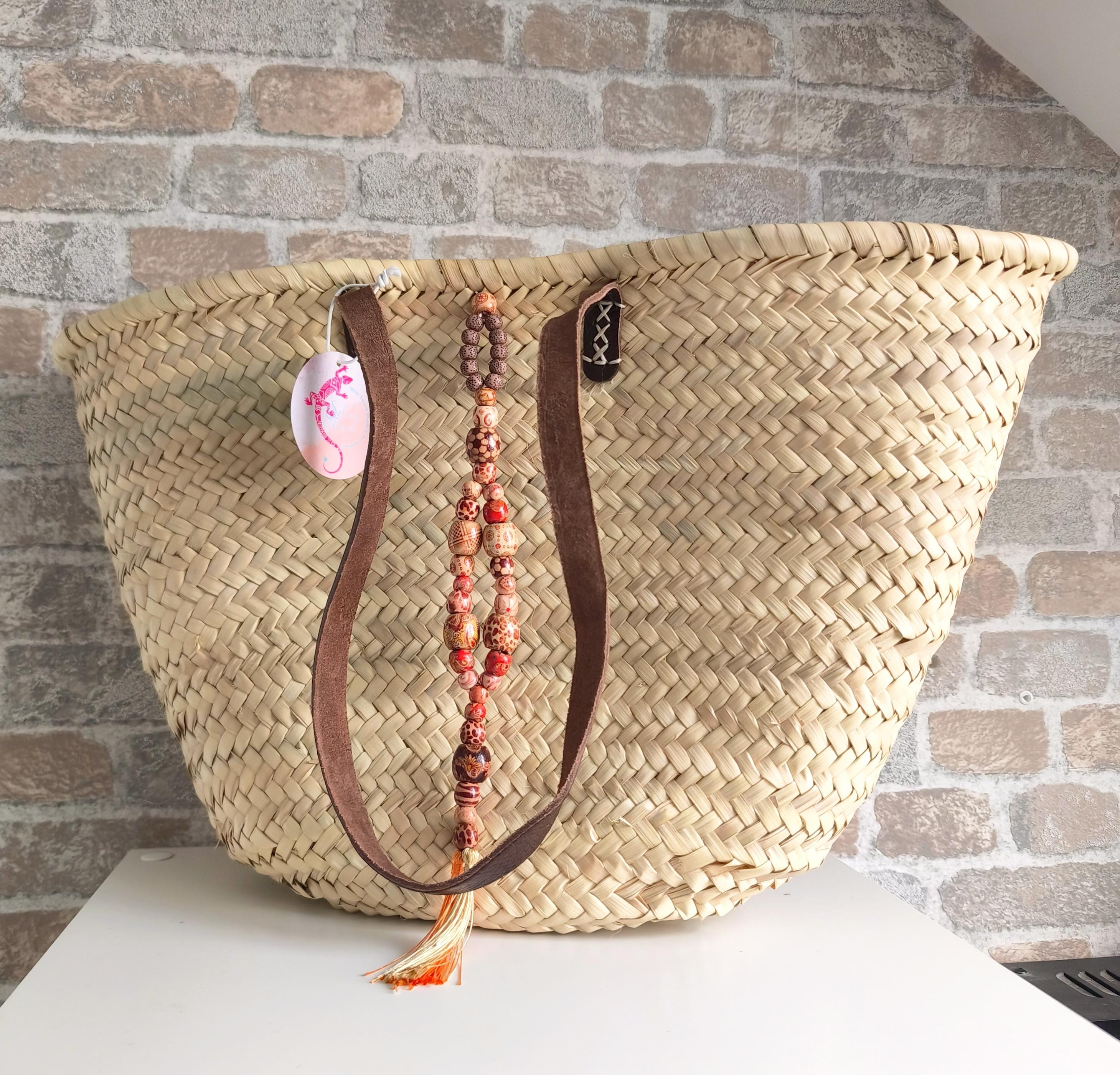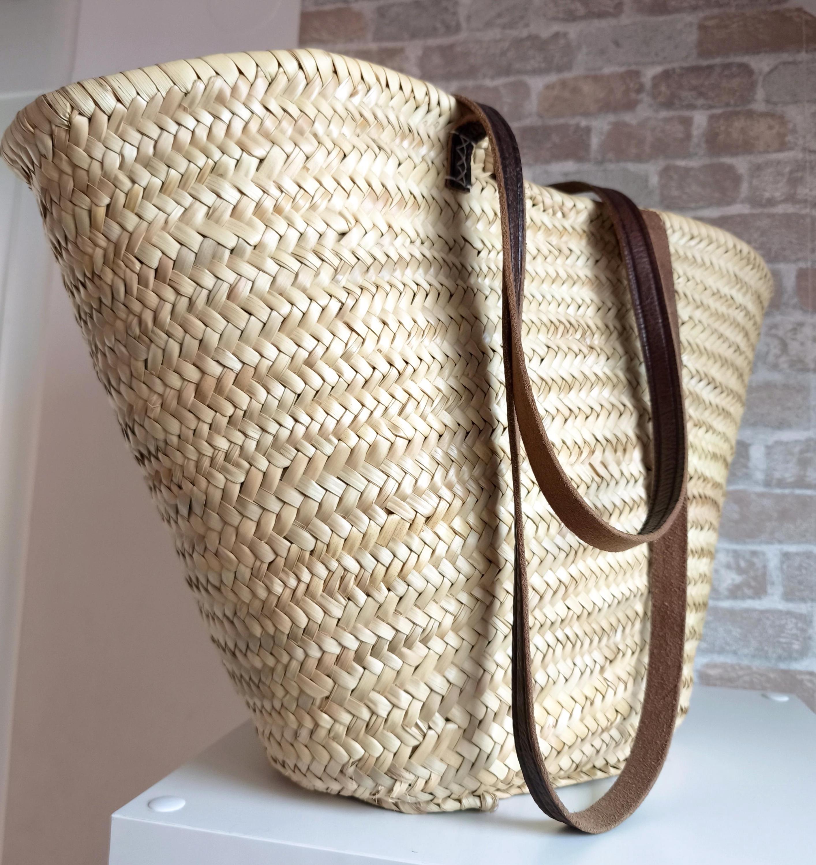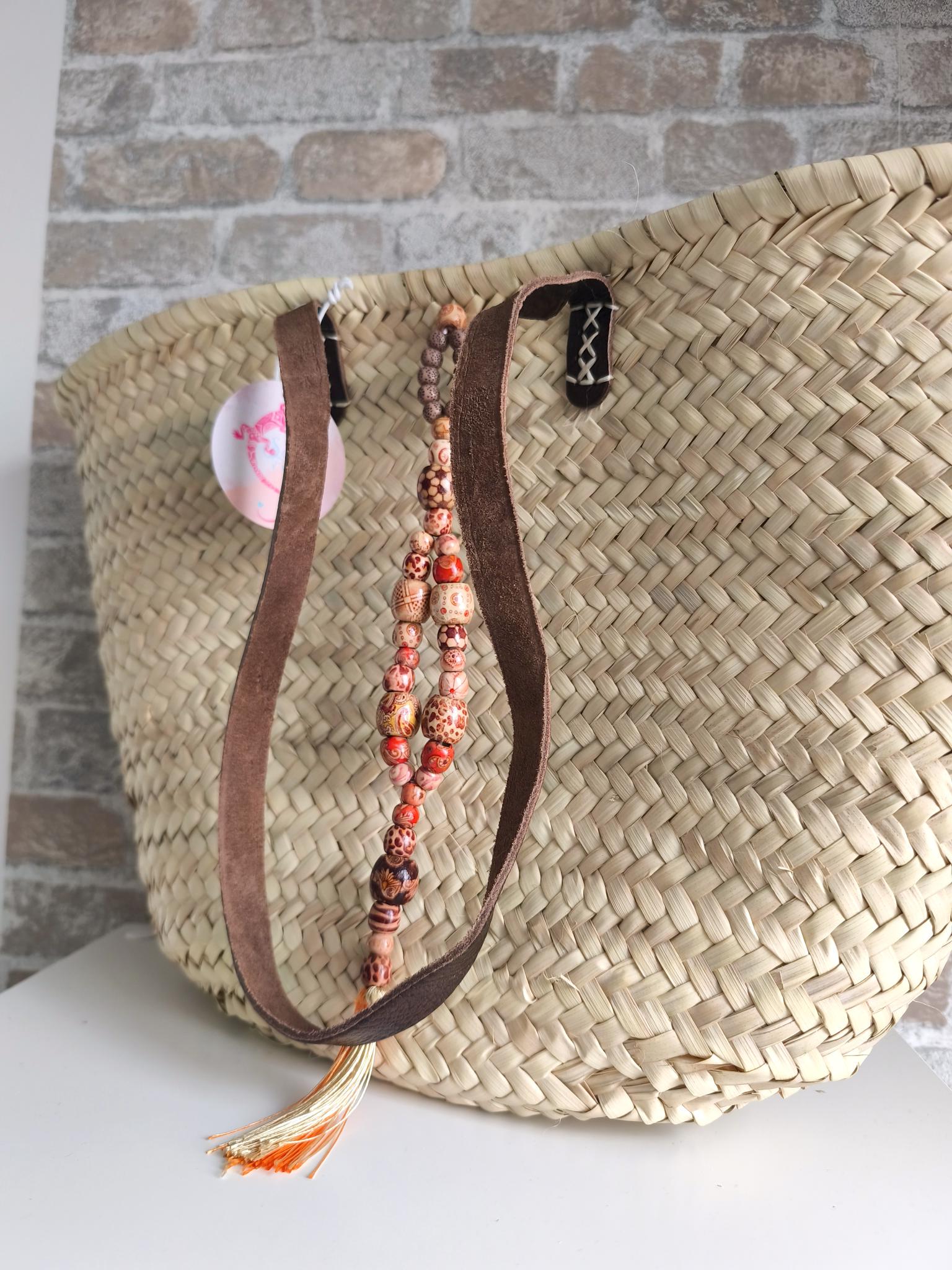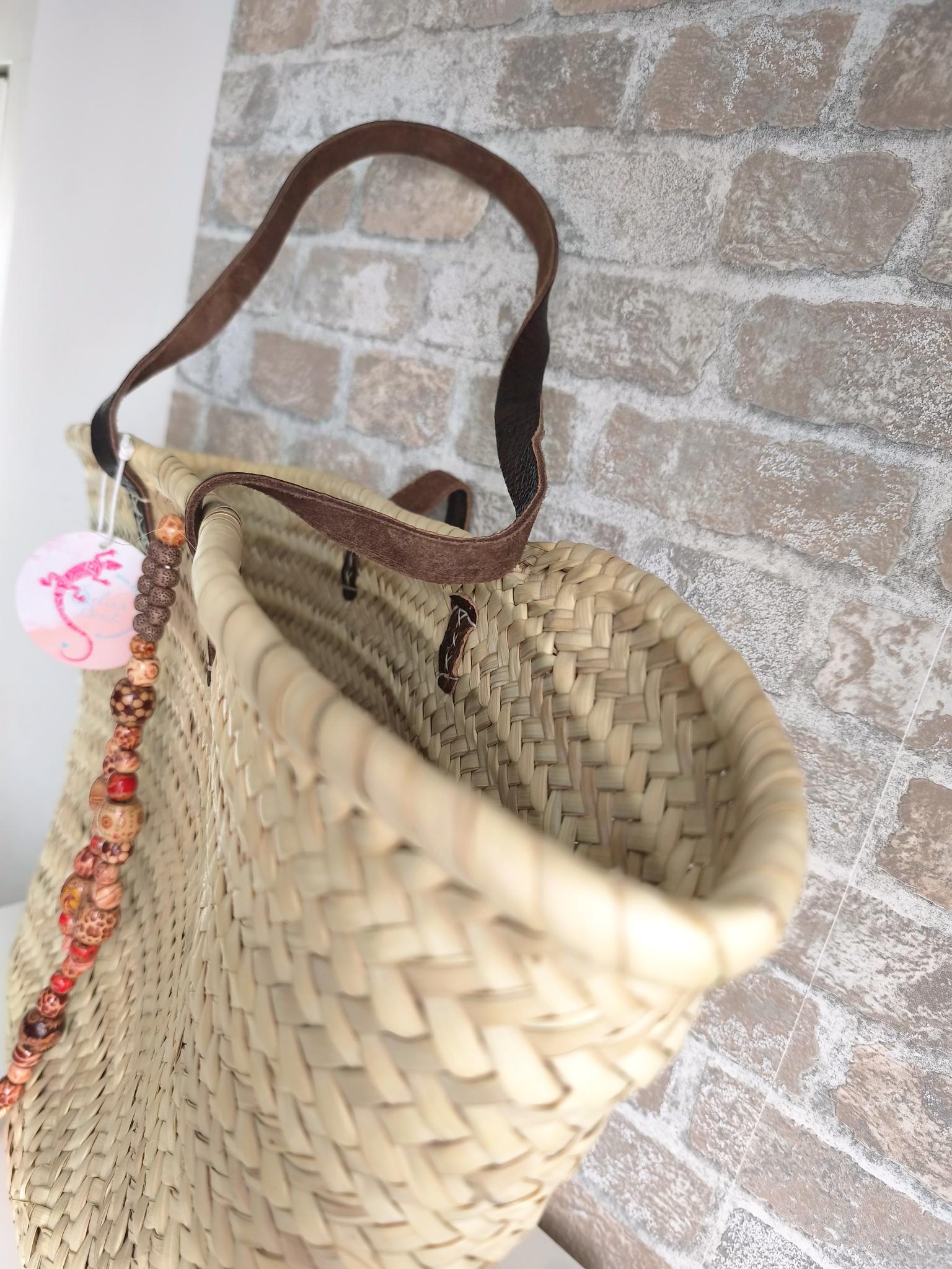 Handles and straps made of sturdy leather. This open bag offers plenty of space for all your beach essentials or shopping trips.