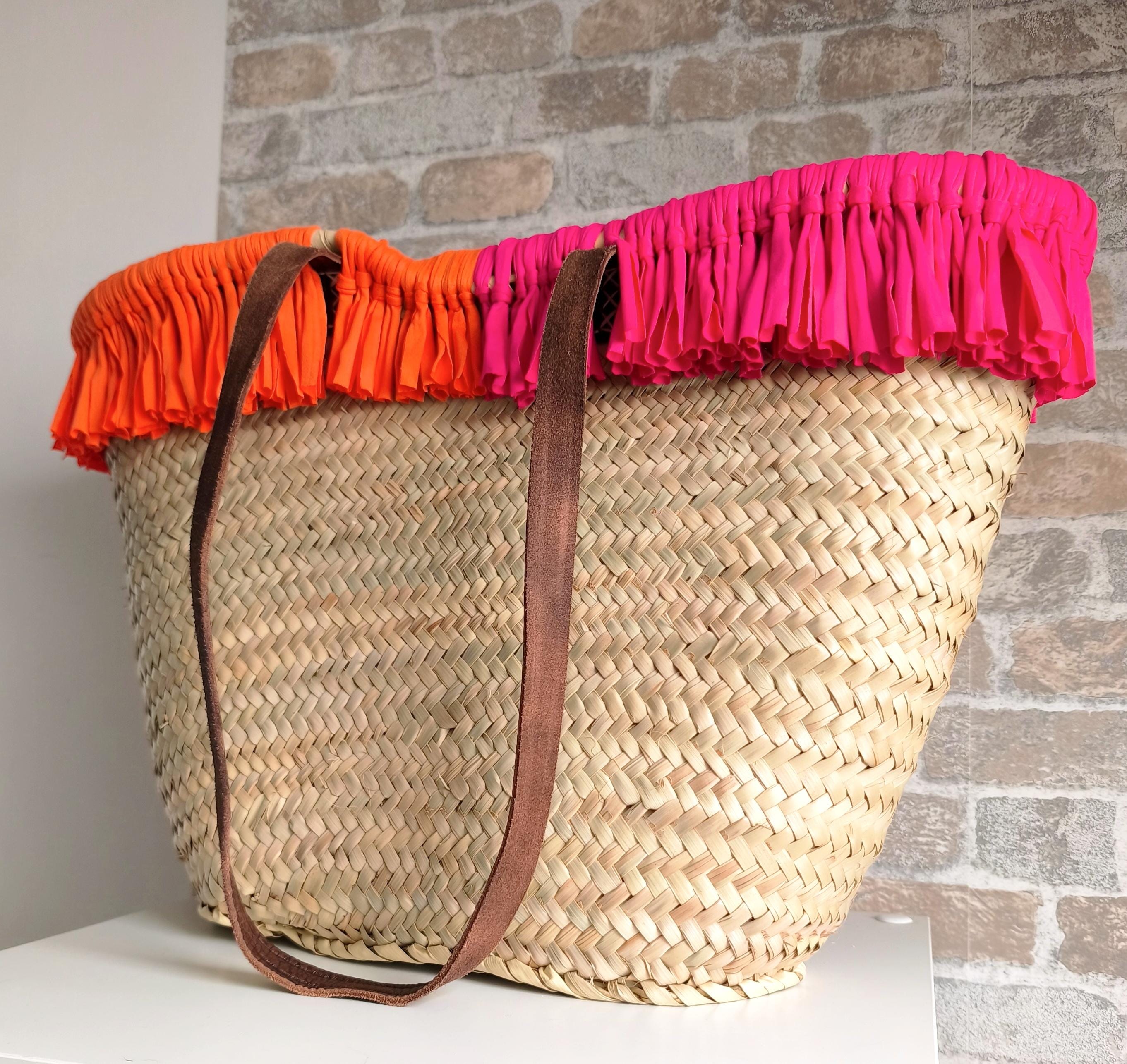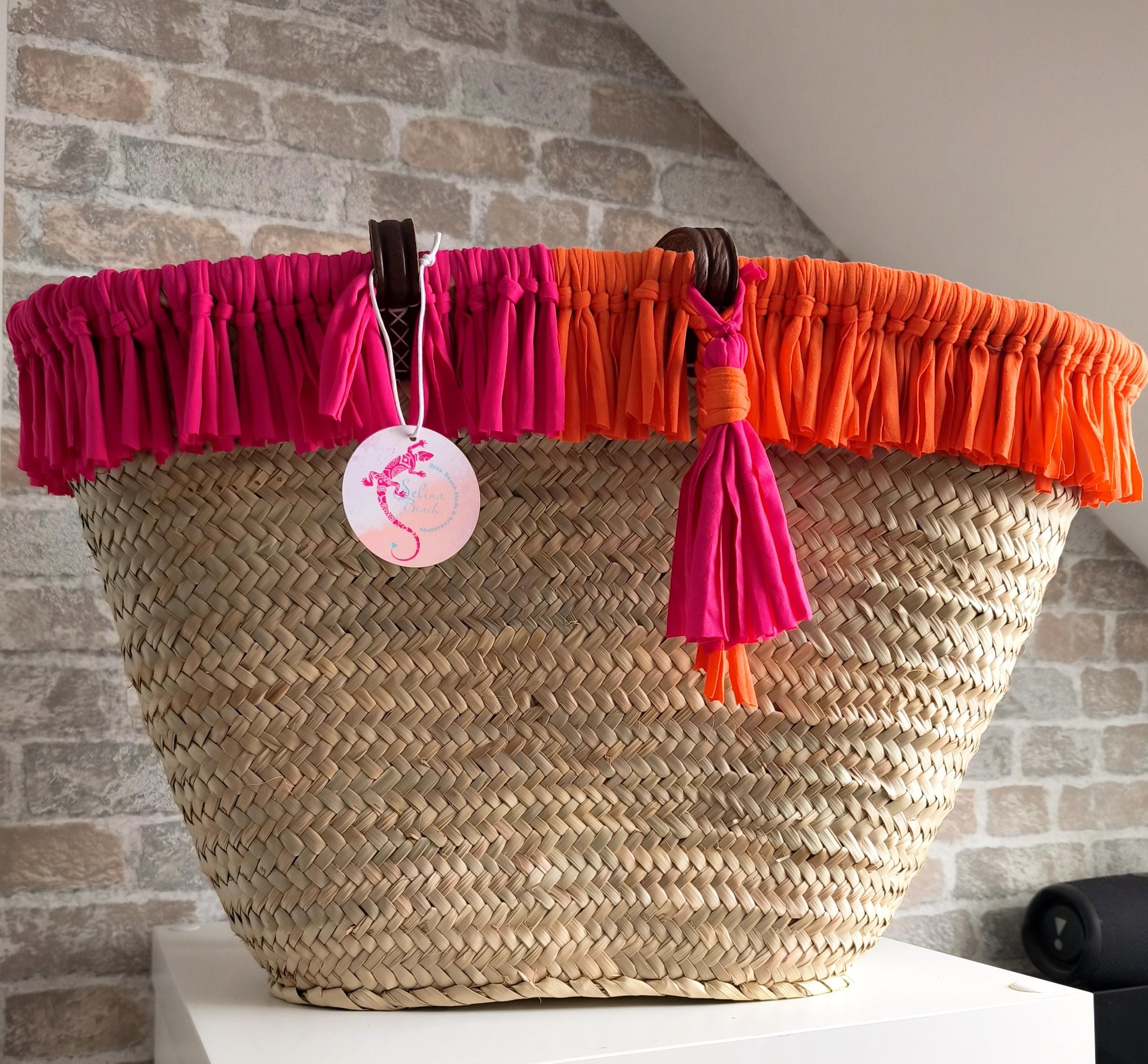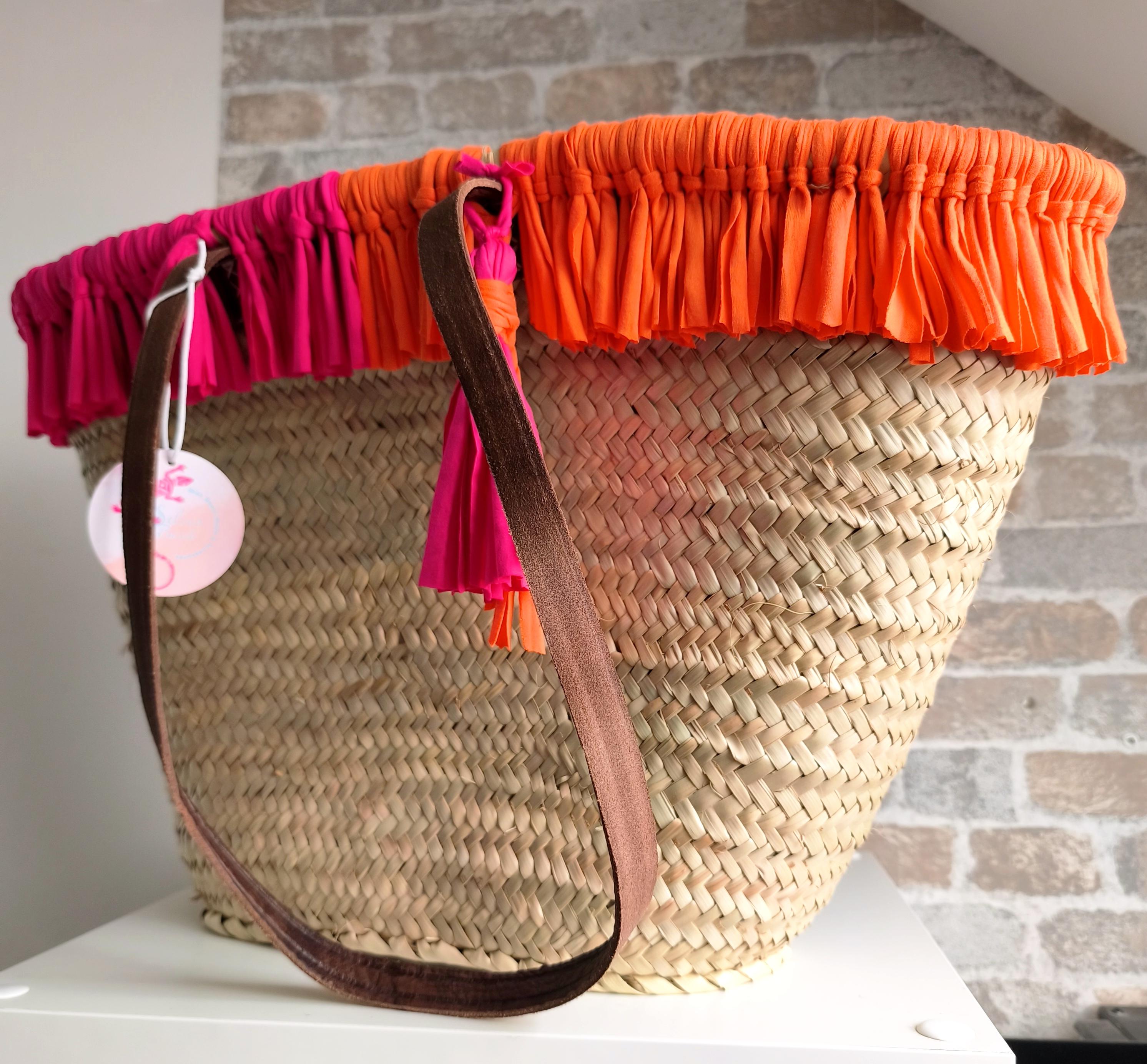 Pretty Ibiza basket beach bag XXL, with many soft fringes in trendy summer colors pink & orange.