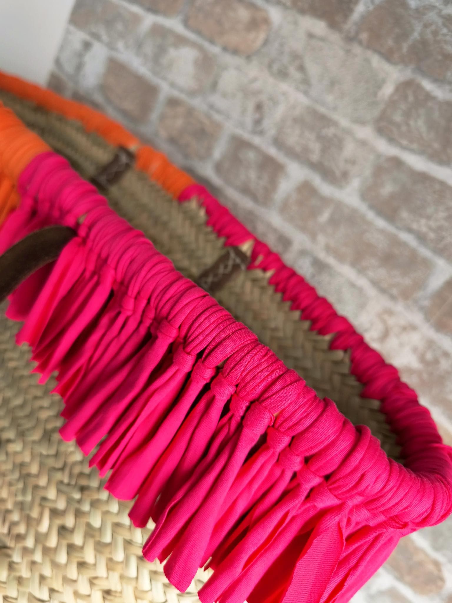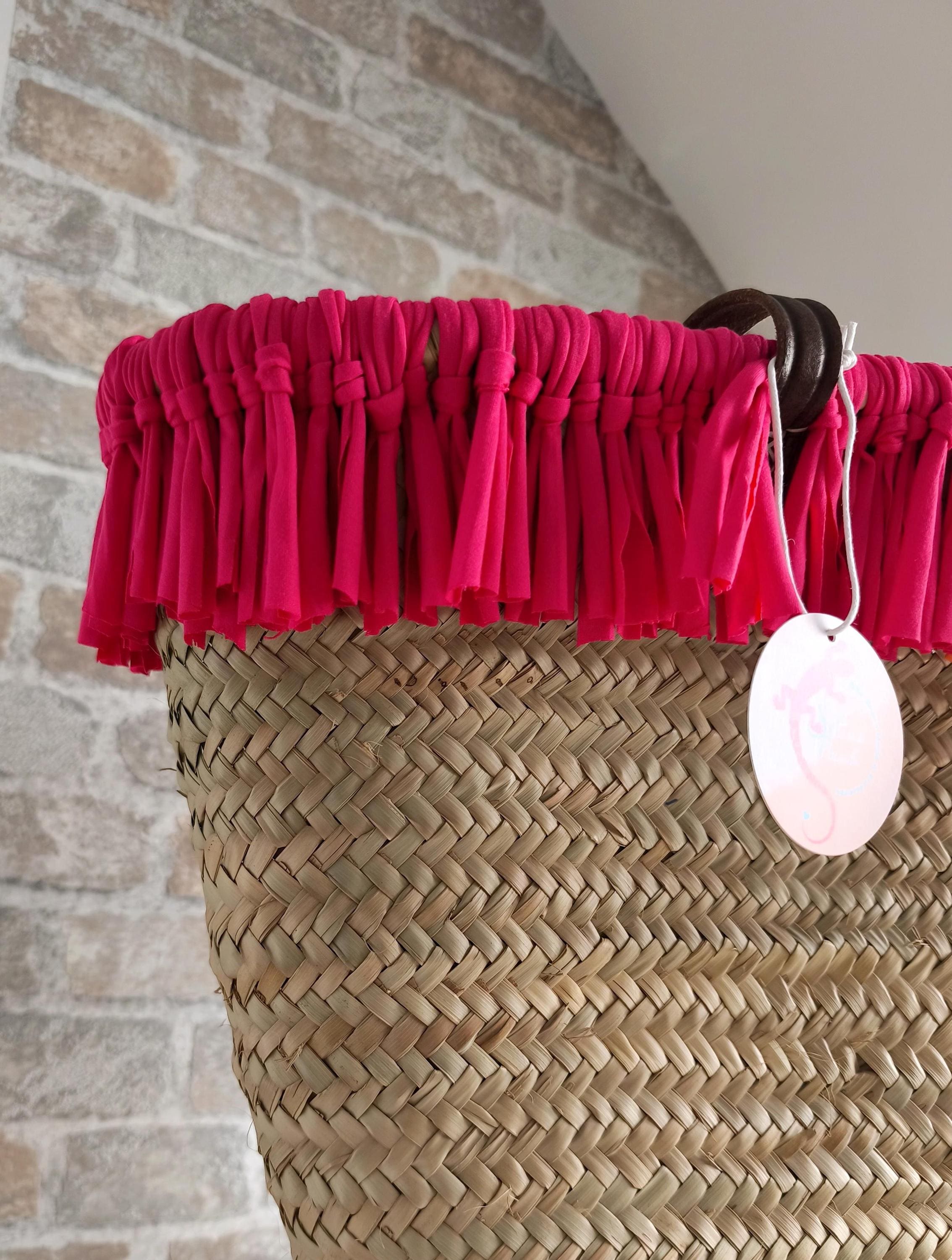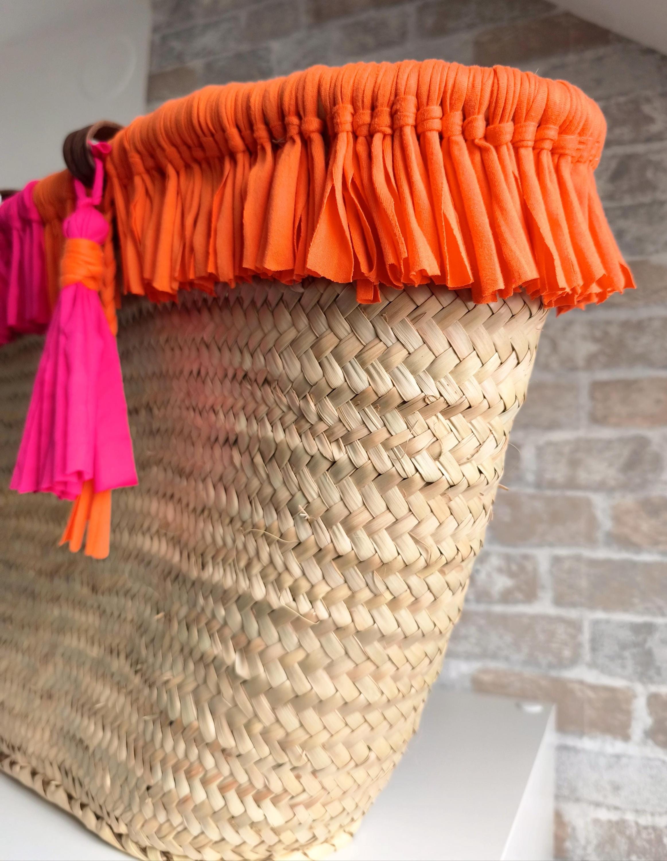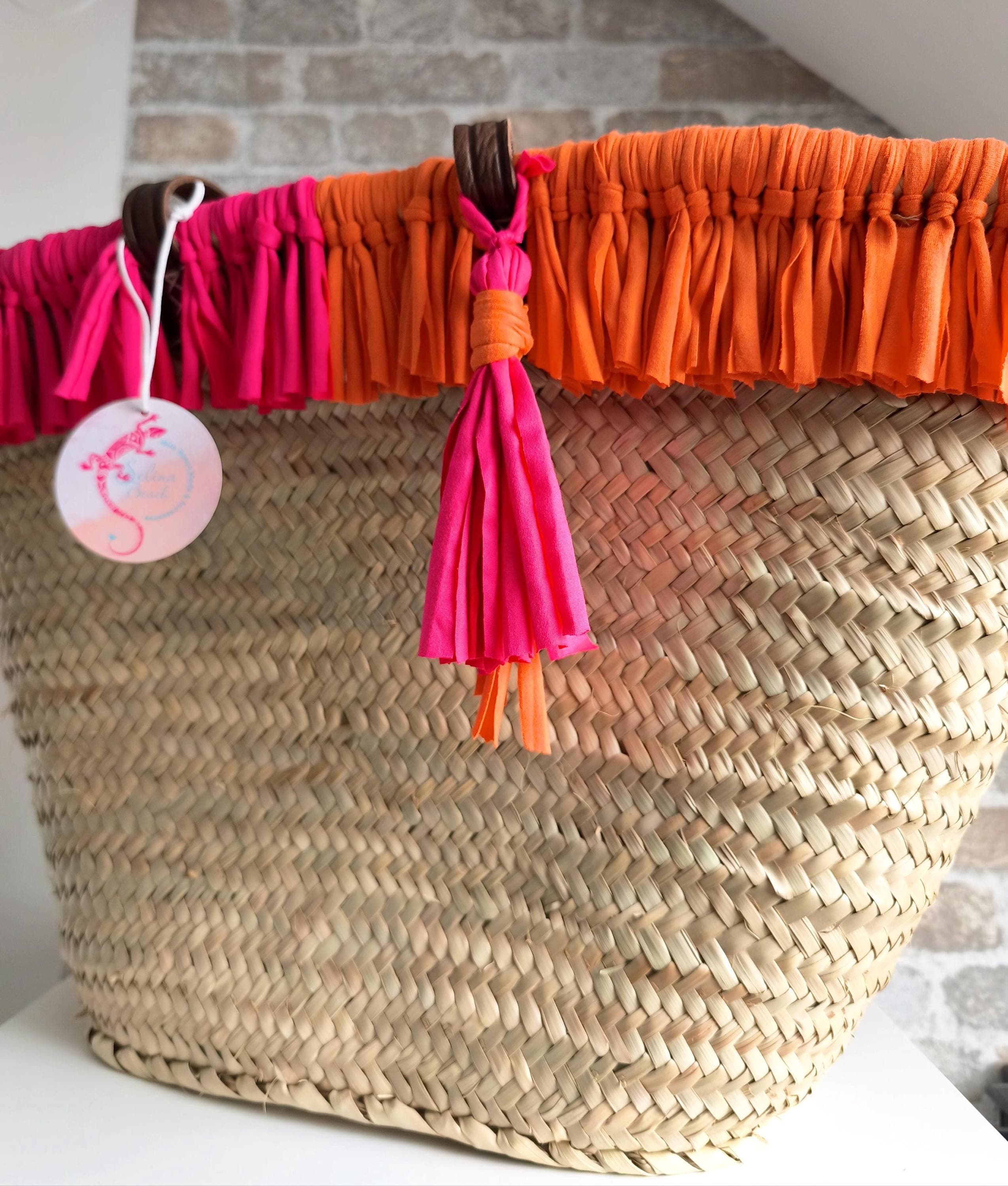 Pretty Ibiza basket beach bag XXL, with many soft fringes in trendy summer colors pink & orange.