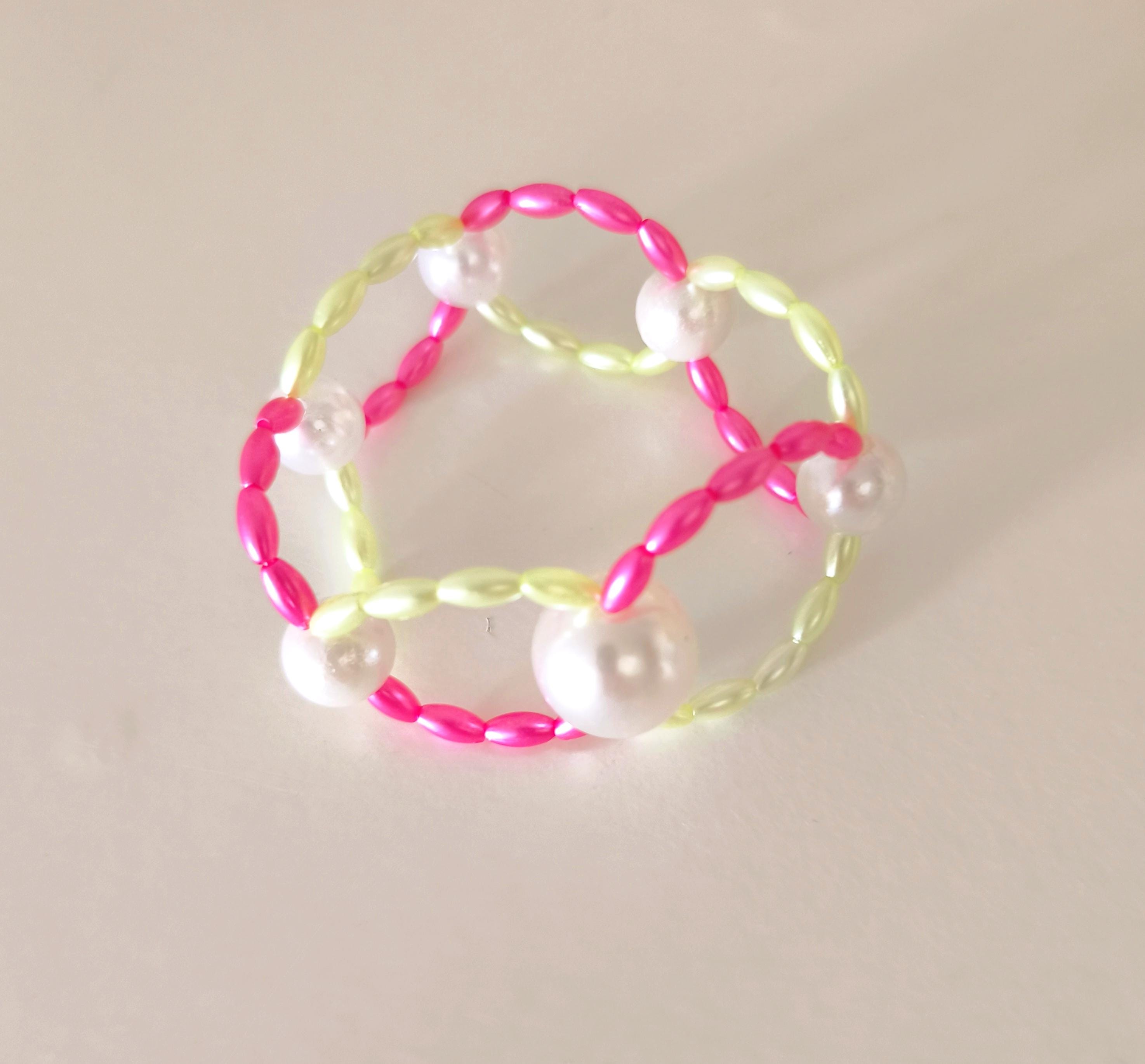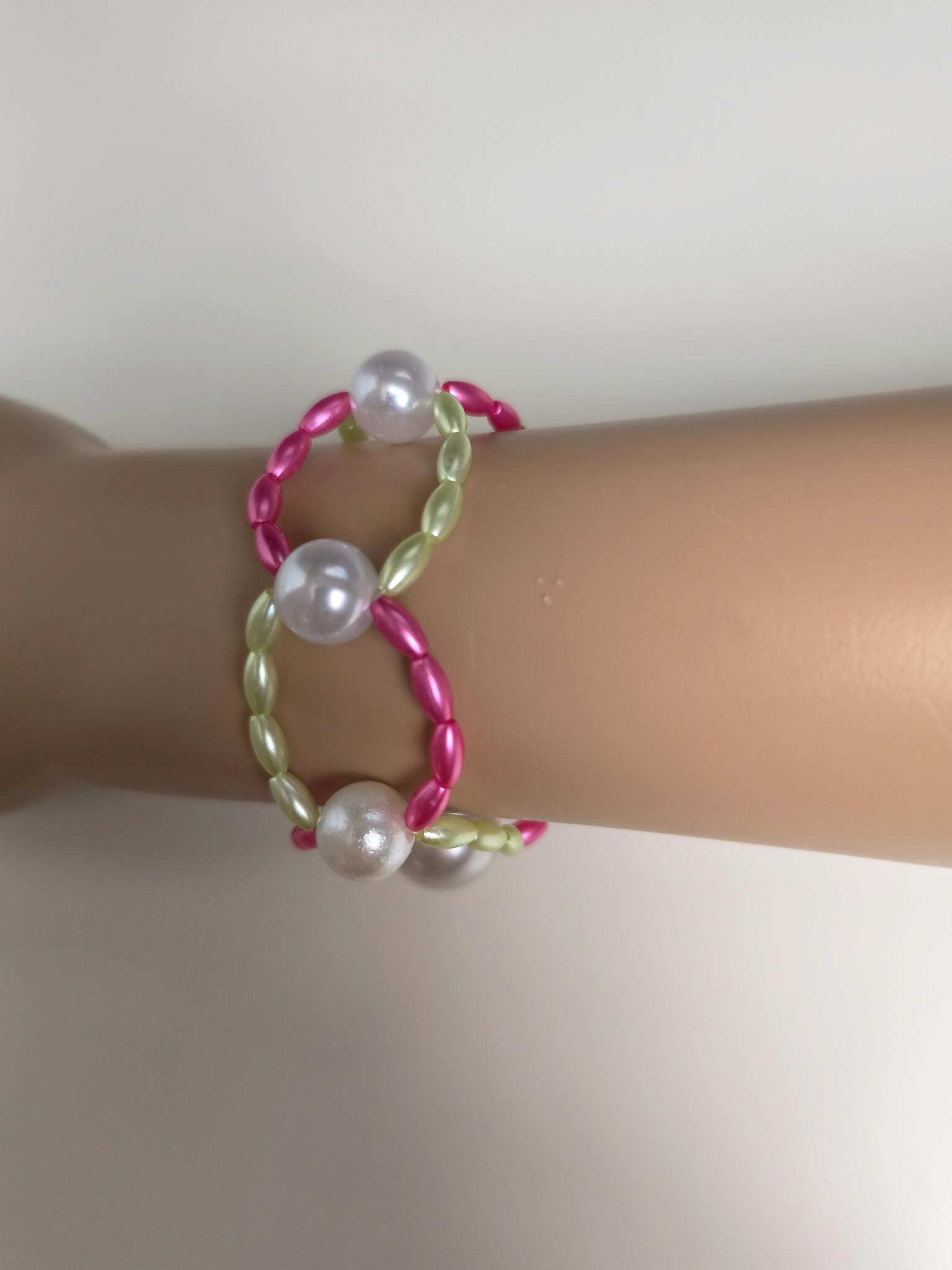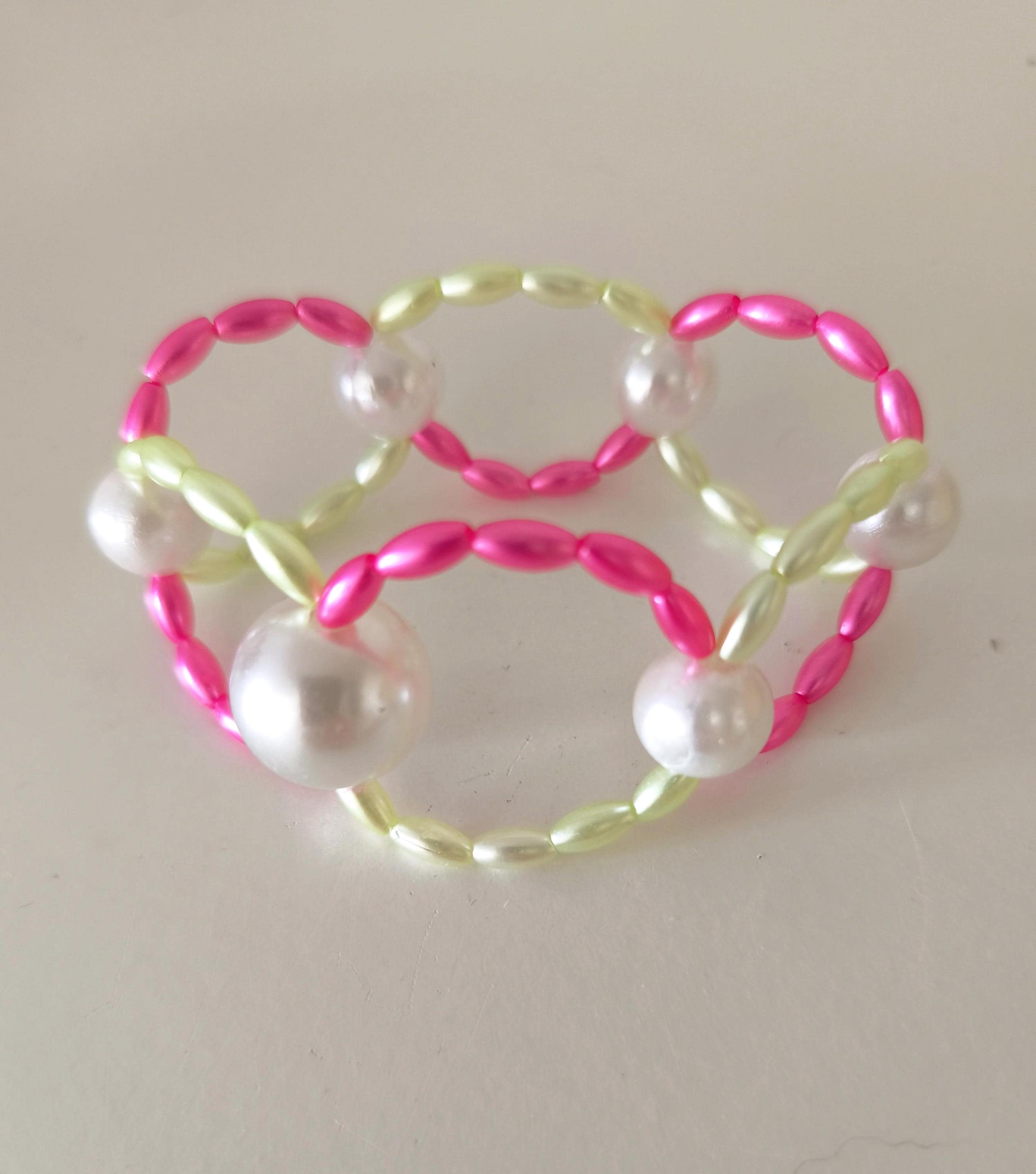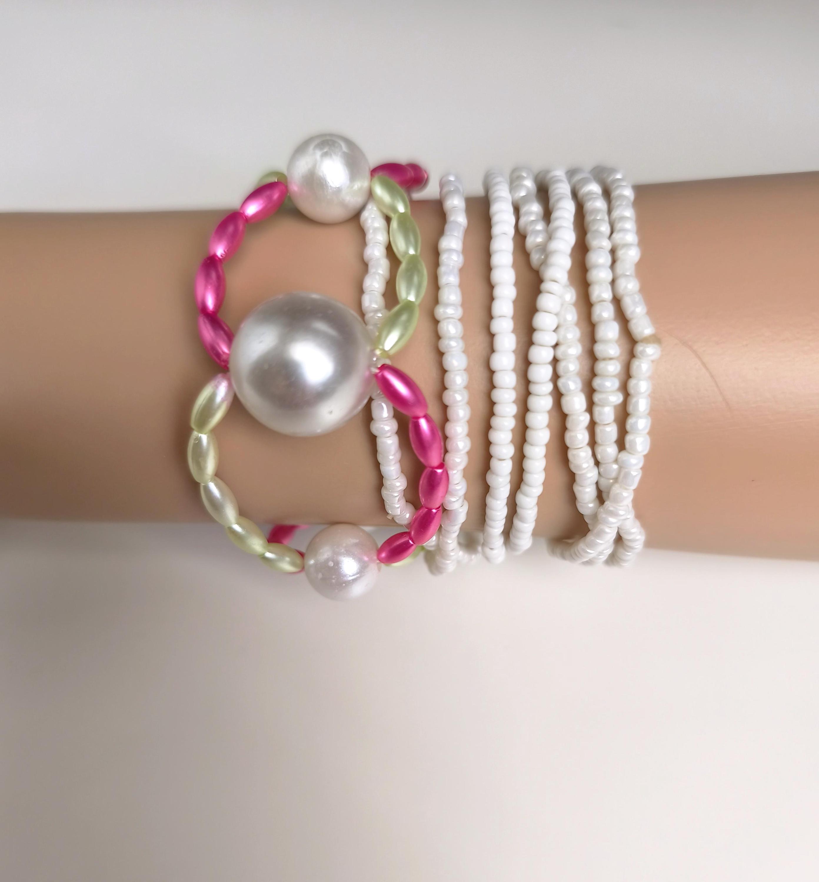 Pretty, wide, fashionable boho beaded bracelet made of lightweight acrylic beads in beautiful summer colors pink/lemon with large white beads.
