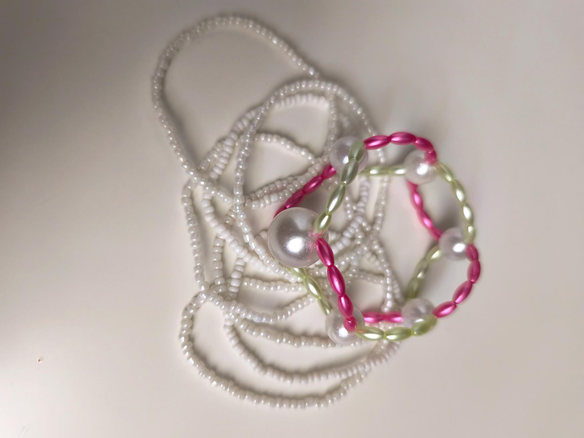 Without delicate white pearl bracelets. Available as an add-on in our shop.