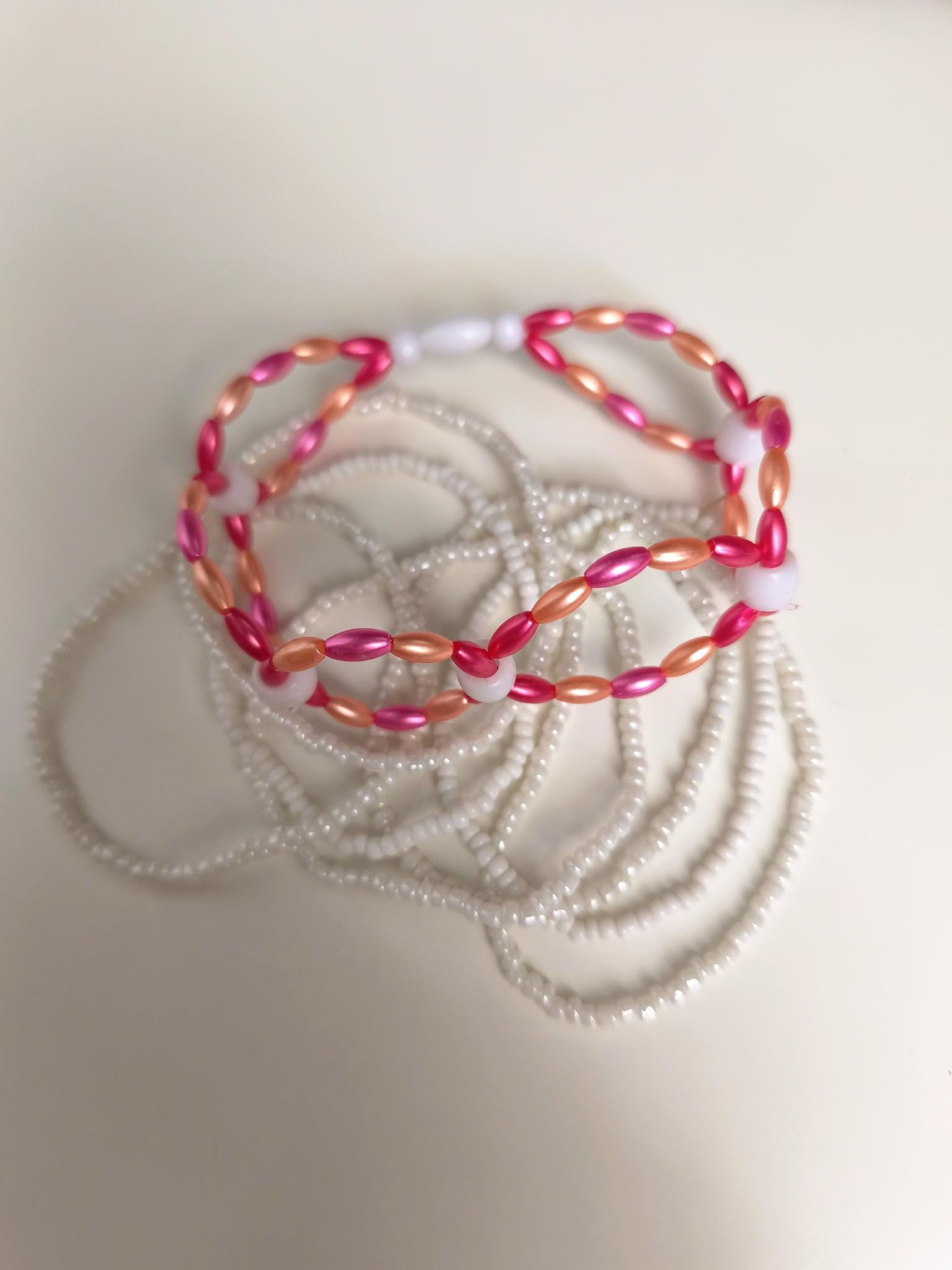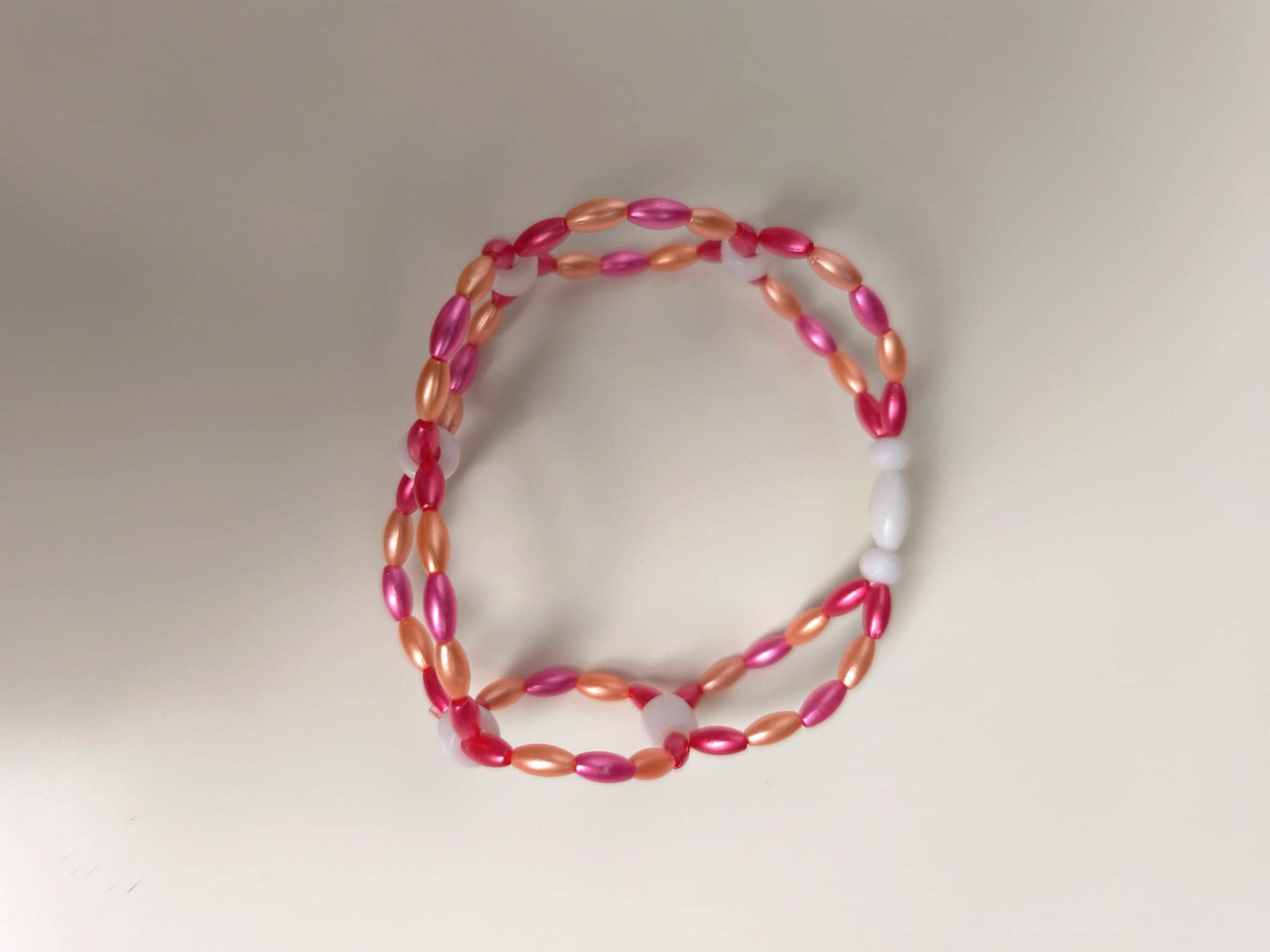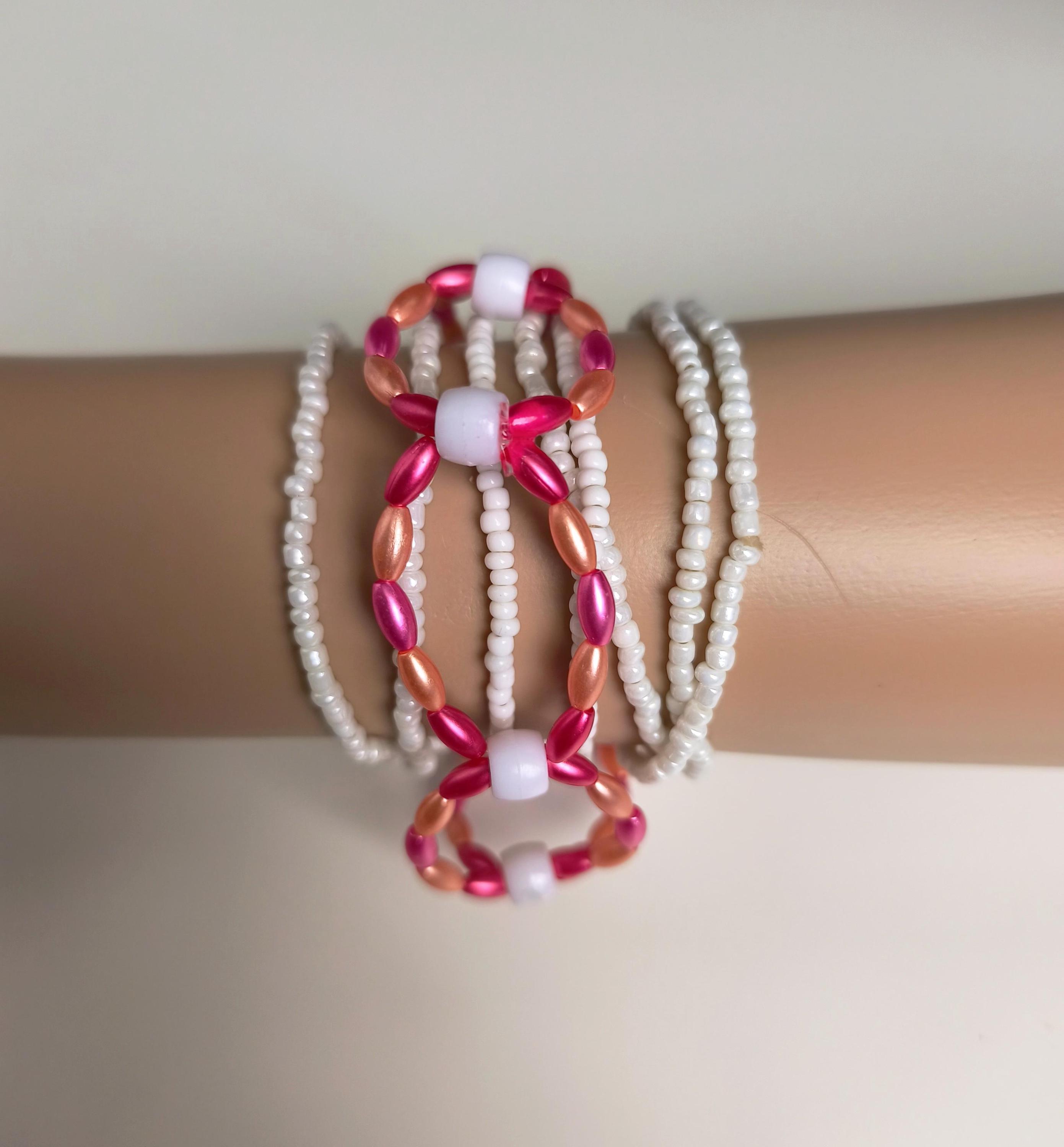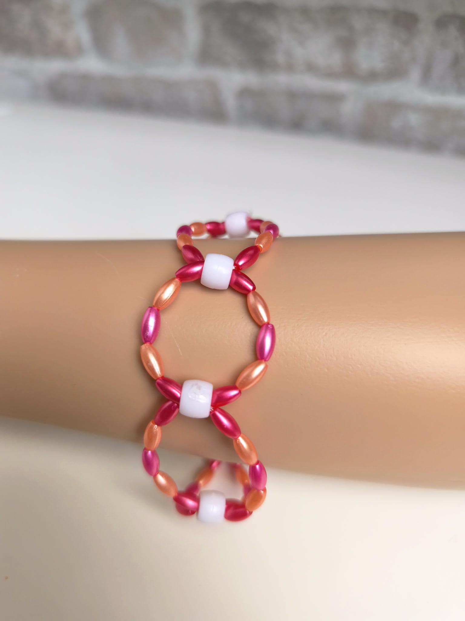 Pretty, wide, fashionable boho beaded bracelet made of lightweight acrylic beads in beautiful summer colors pink/apricot with white beads accented on top.