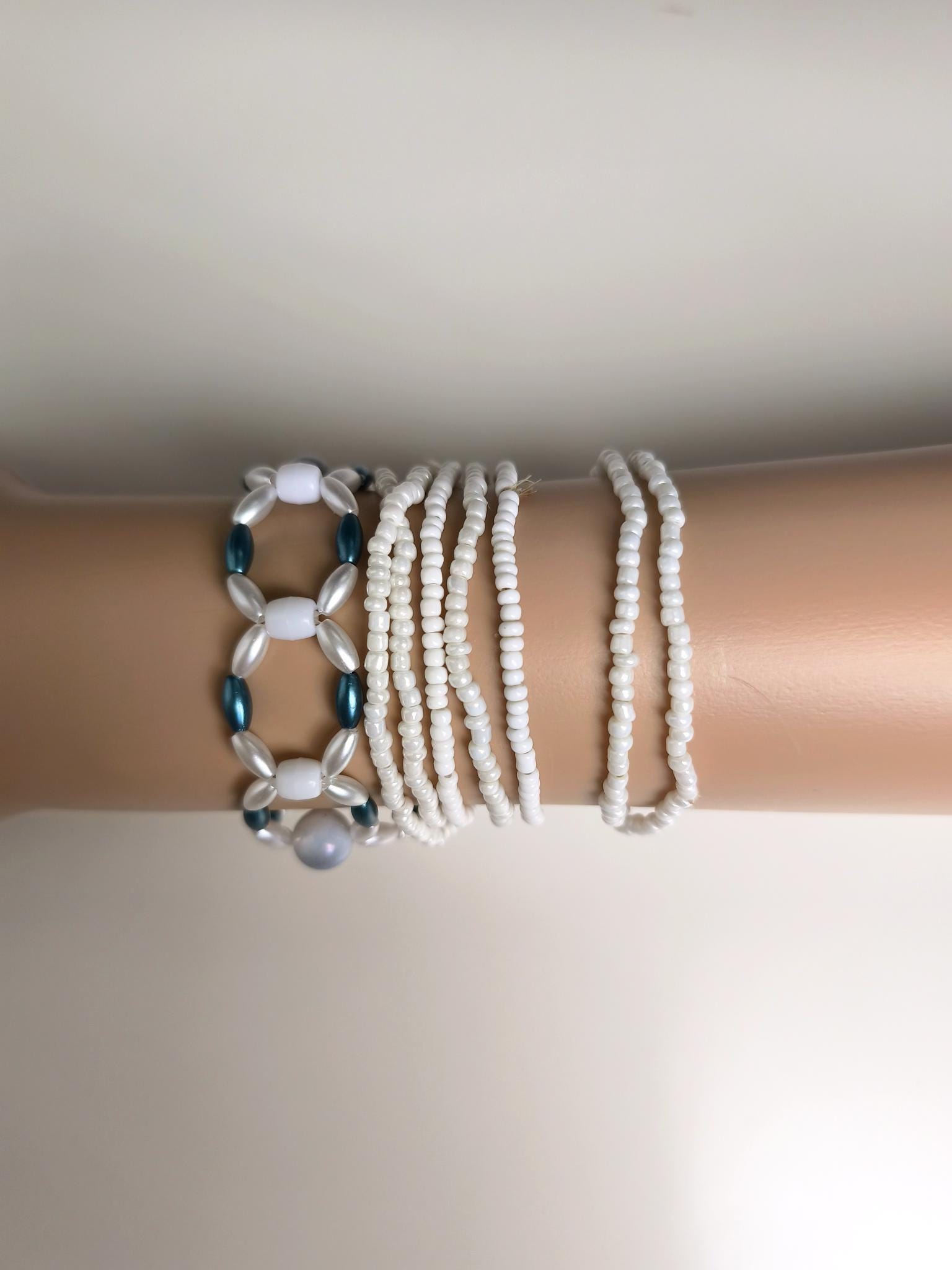 Ohne feine, weiße Perlenarmbänder. Zur Erweiterung hier im Shop.