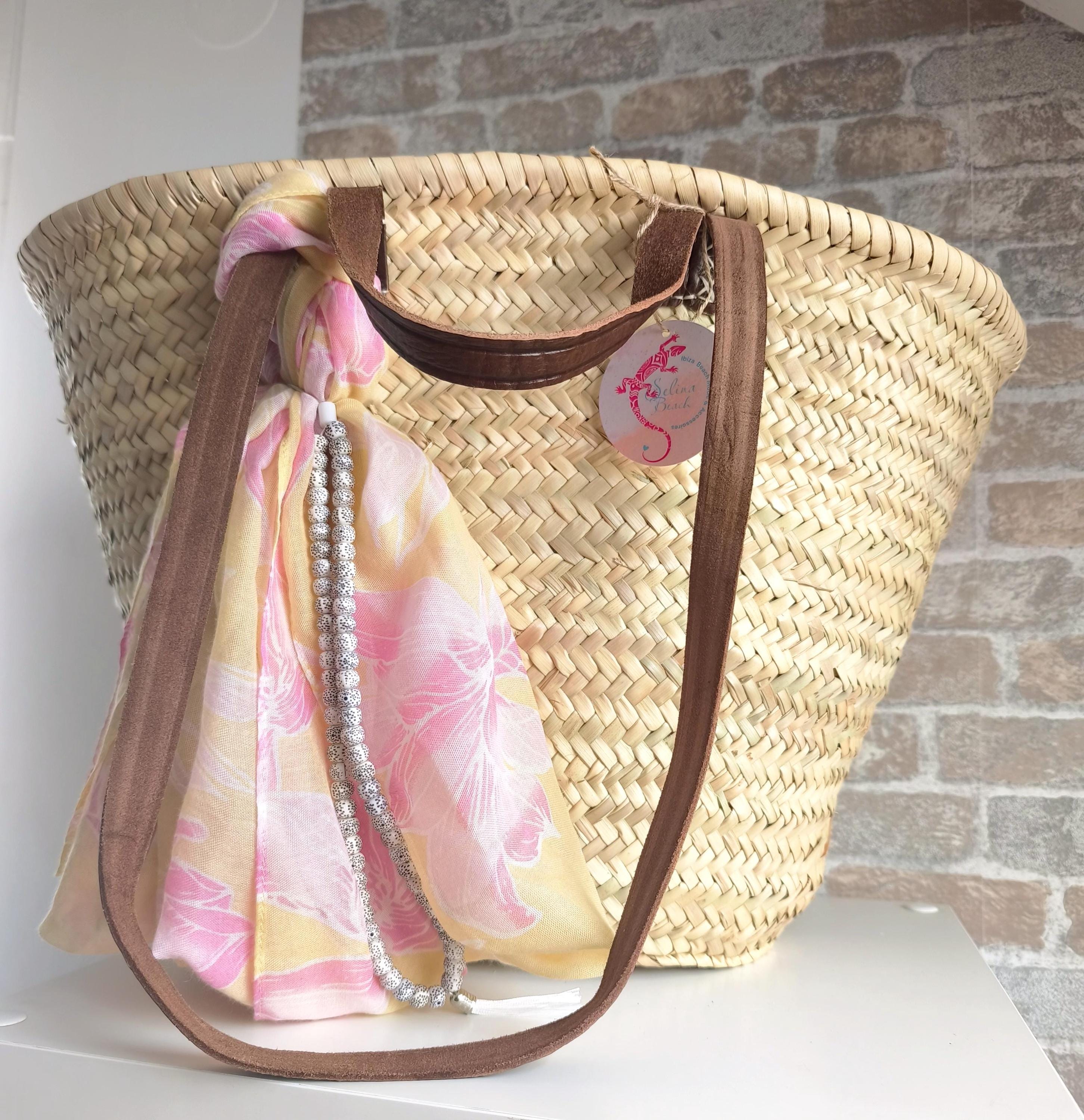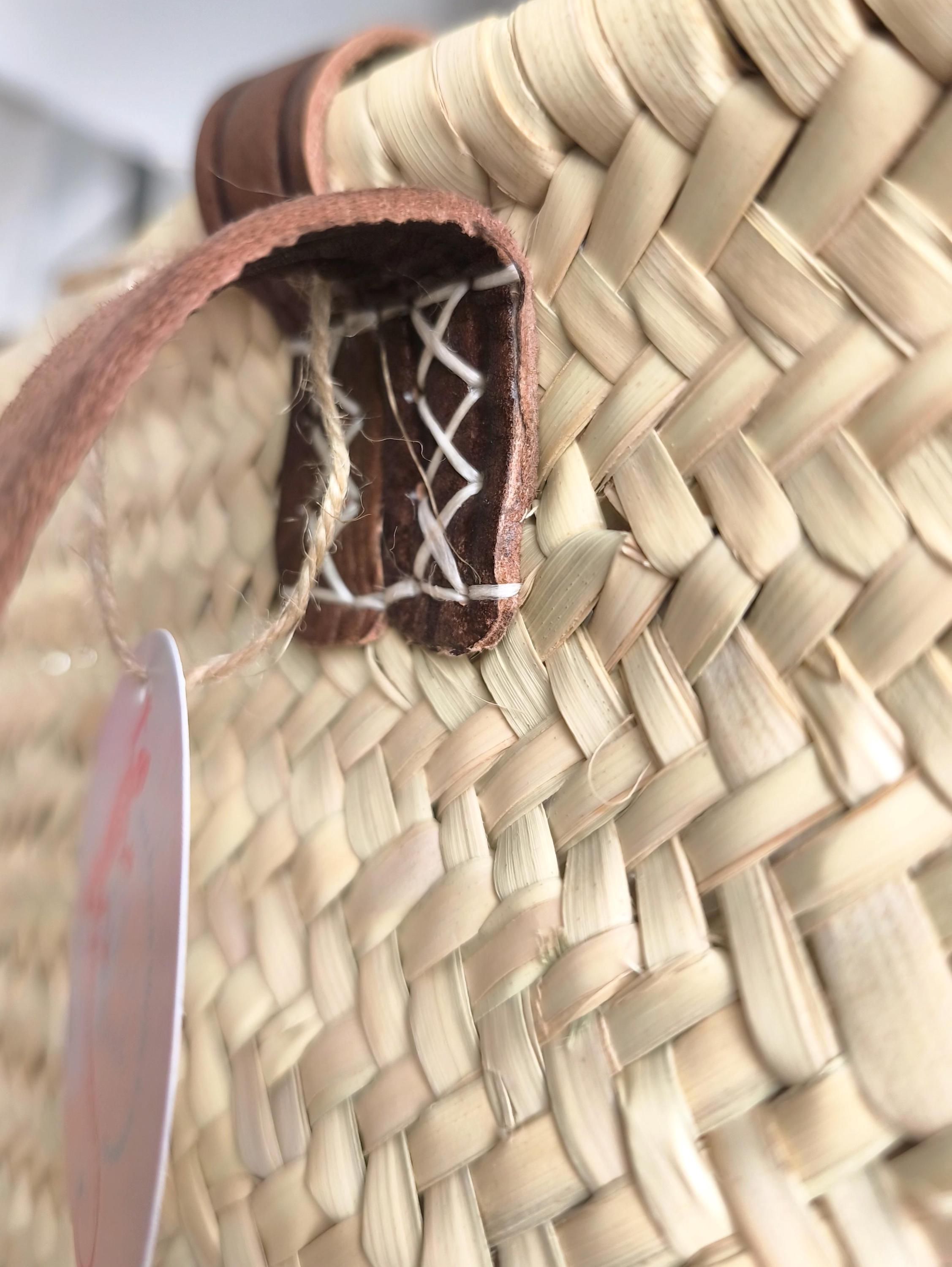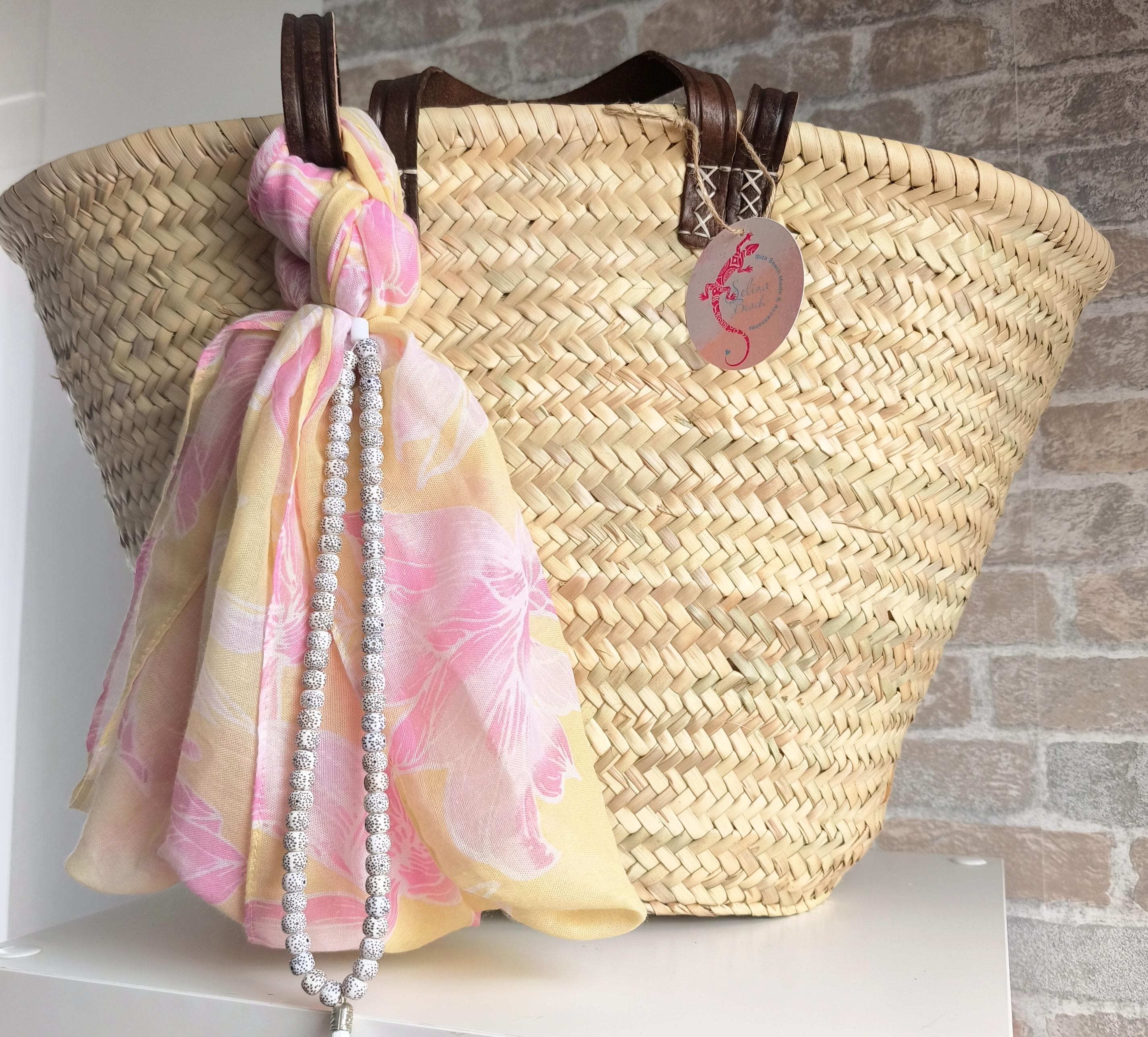 Bound from palm leaves (from the Netherlands), with double handles for hand and shoulder made of sturdy leather. A decorative, pastel-colored scarf with a handmade white boho necklace with a pom-pom adorns the front as an accessory.