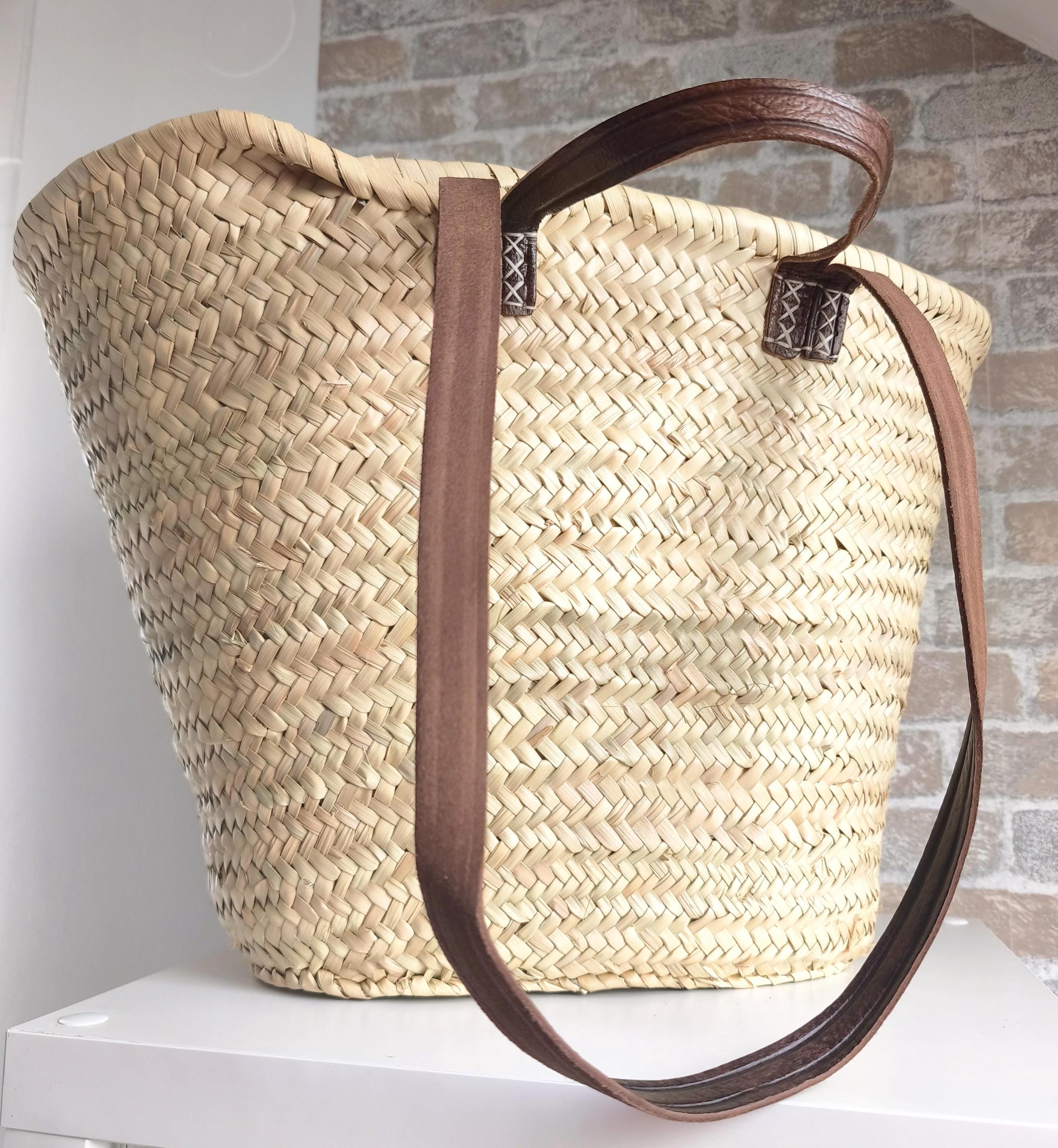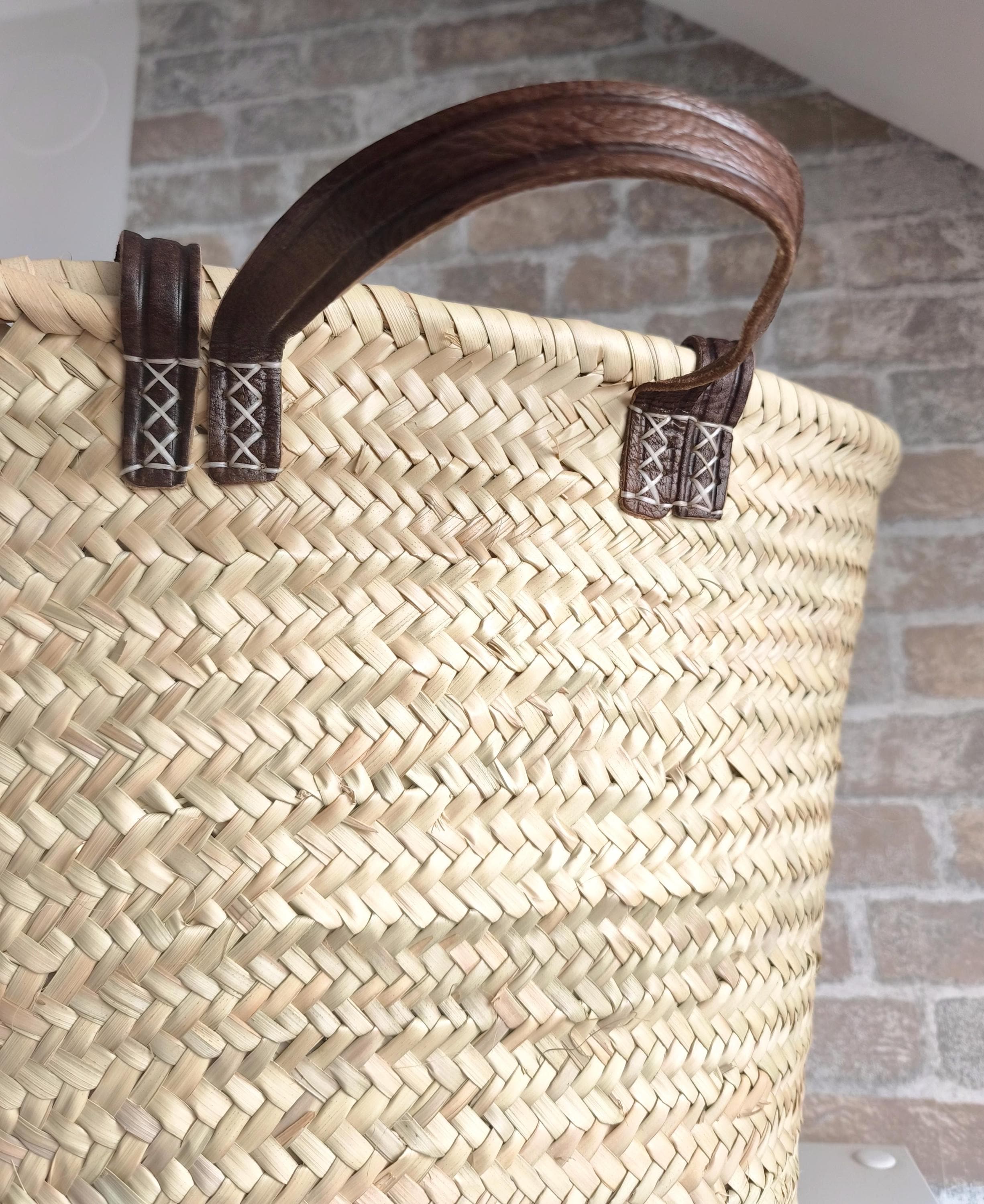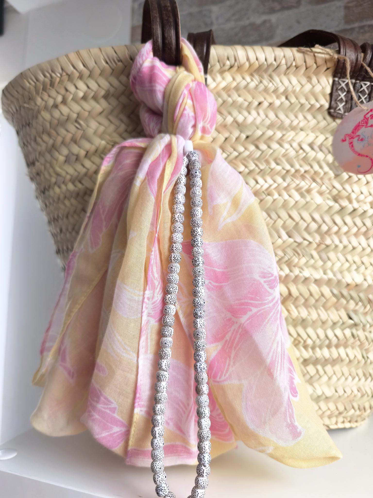 Bound from palm leaves (from the Netherlands), with double handles for hand and shoulder made of sturdy leather. A decorative, pastel-colored scarf with a handmade white boho necklace with a pom-pom adorns the front as an accessory.